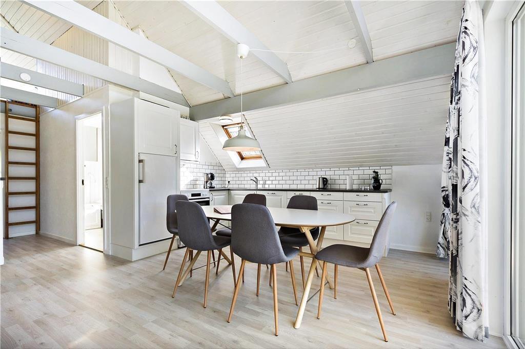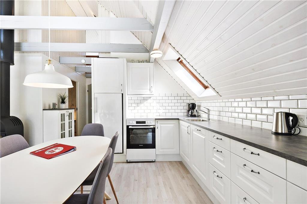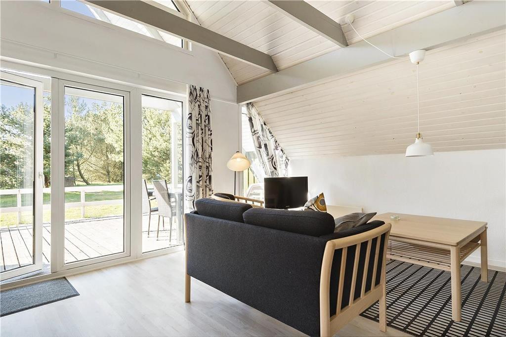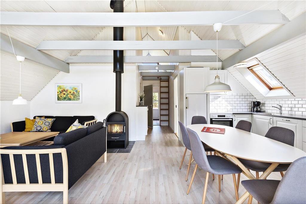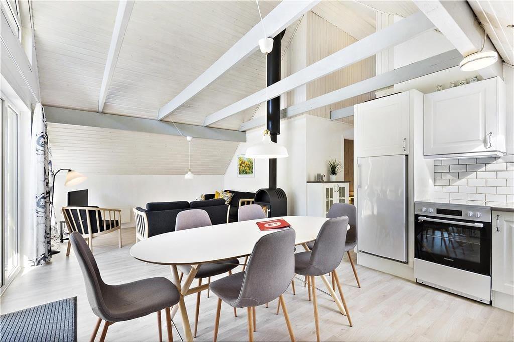 Als das Ferienhaus 2019 renoviert wurde, ist man sehr gründlich vorgegangen. Dies bedeutet, dass sich insbesondere der Wohnbereich auf einladende Weise präsentiert. Der helle und hohe Raum ist mit einem Brennofen und geschmackvollen Möbeln eingerichtet. Freue dich unter anderem auf eine schöne, offene Küche, in der sich mehrere Personen gleichzeitig um das Essen kümmern können. Stunden der Entspannung können im Sofabereich verbracht werden – oder auch im Badezimmer, in dem dich eine schöne Sauna erwartet. Ist es Zeit zum Schlafengehen, kannst du dich in die drei Schlafzimmer des Hauses zurückziehen, die alle mit einem guten Doppelbett ausgestattet sind. Die Duschnische des Ferienhauses verfügt außerdem über zwei weitere Schlafplätze, und diesen Ort werden die Kinder aller Wahrscheinlichkeit nach zur Lieblingshöhle erklären.