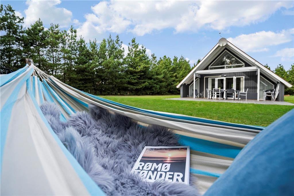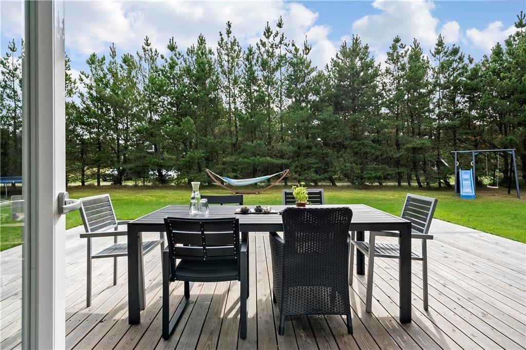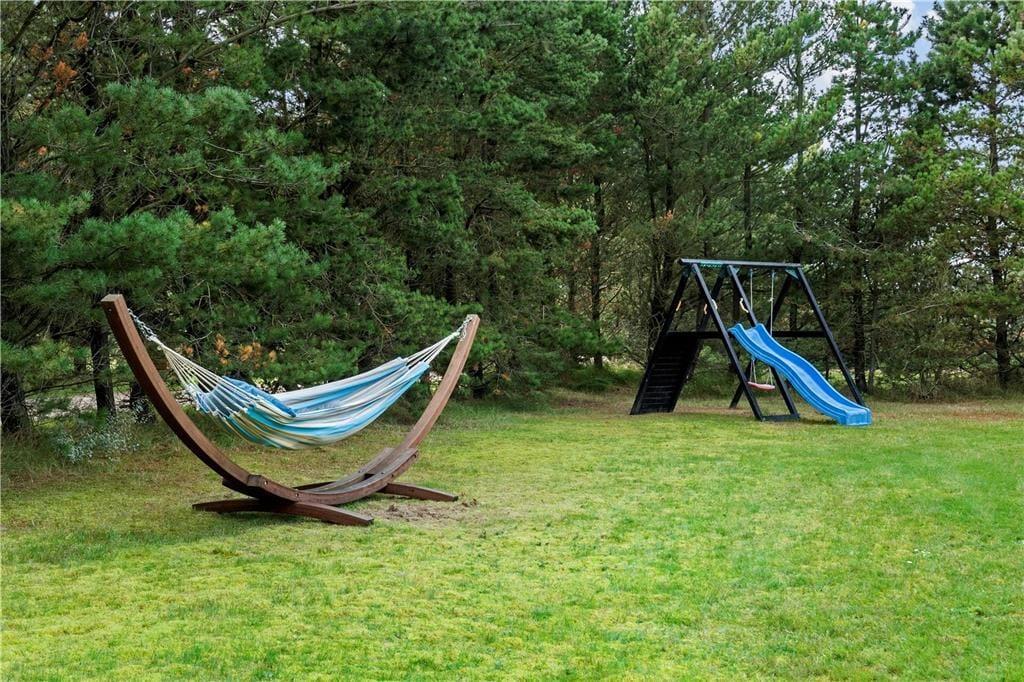 Das Haus steht auf einem 1.600 m² großen Grundstück, das von Kiefern umringt ist. Hier findest du deine eigene private Oase, wo du den Urlaub in Ruhe genießen kannst. Das Haus ist optimal platziert und nach der Sonne ausgerichtet, sodass du dich auf viele Sonnenstunden auf der schönen Terrasse freuen kannst. Die Rasenfläche ist groß und eben, perfekt zum Toben und Ballspielen; zudem gibt es auch noch eine Hängematte und einen kleinen Spielplatz mit Rutsche, Schaukel und Trampolin.