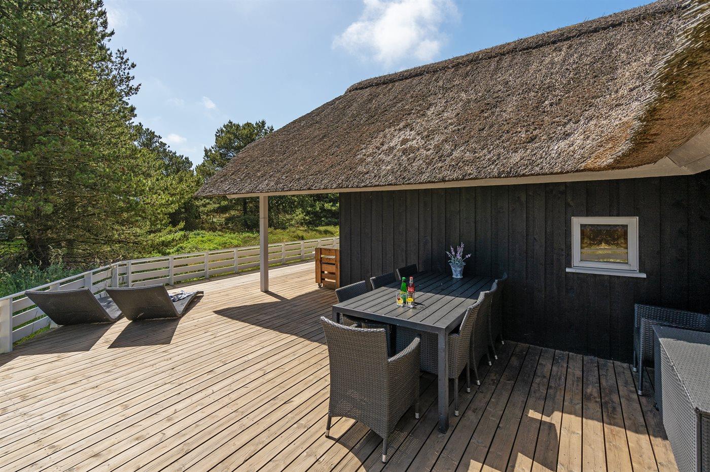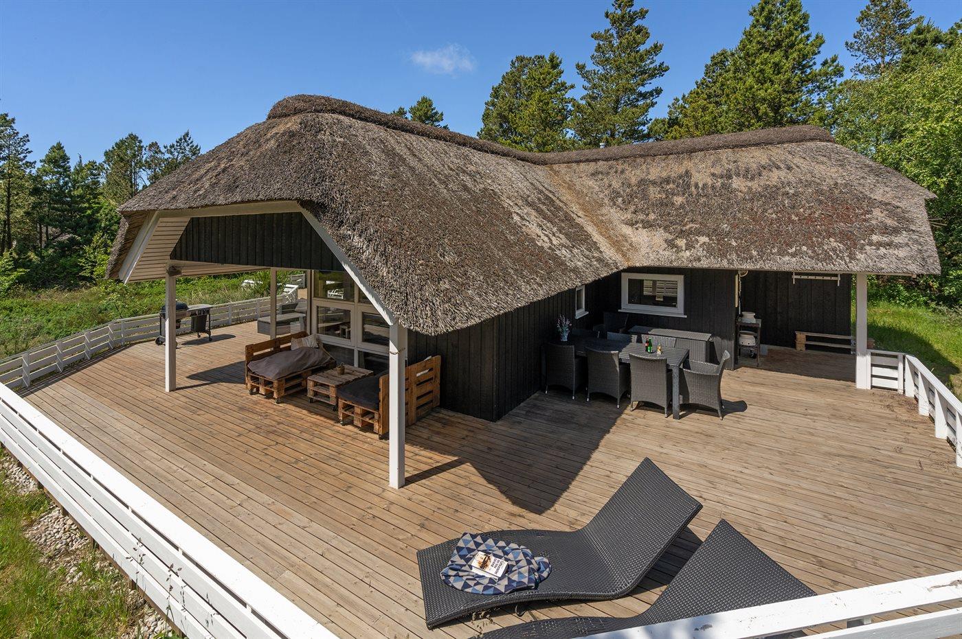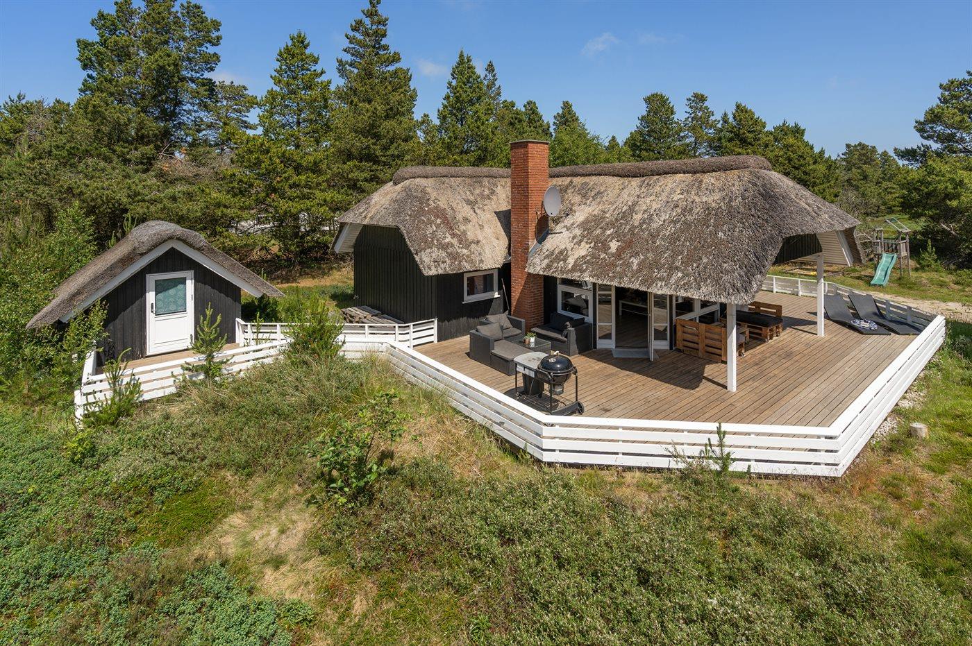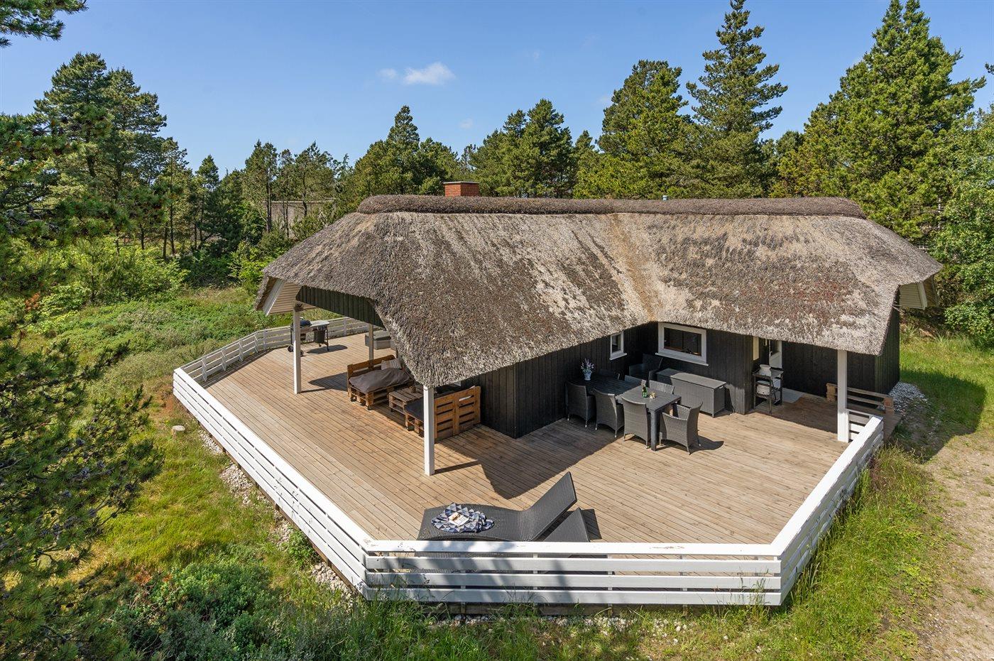 Hübsches Ferienhaus aus Holz mit Reetdach, 1992 gebaut und 2011 renoviert, auf einem großen, zurückgezogenen Naturgrundstück mit Heidekraut gelegen. Das Grundstück liegt ungestört und ist von Bäumen umzäunt. Zum Haus gehört eine große, teils überdachte Terrasse mit gutem Windschutz und Gartenmöbeln. Badezimmer mit 2-Pers. Whirlpool, Fußbodenheizung, Dusche und direktem Zutritt zur Sauna. Die hübsche, helle Küche ist mit dem Esszimmer kombiniert und ist mit u. a. Geschirrspüler, Waschmaschine und Wäschetrockner. Das Wohnzimmer ist mit großen Fenstern, Kaminofen, DVD-Spieler, TV mit Satellitenanschluss und Stereoanlage mit CD-Spieler eingerichtet. Ferner kostenlose, kabellose Internetverbindung vorhanden (Computer ist mitzubringen). Die Schlafplätze verteilen sich auf 3 Zimmer; 1 mit Doppelbett, 1 mit Doppelbett und 1 Einzelbett sowie 1 mit Etagenbett und 1 Einzelbett. Für die kleinen Feriengäste stehen Kinderbett, Kinderhochstuhl, Sandkasten und Schaukel zur Verfügung.