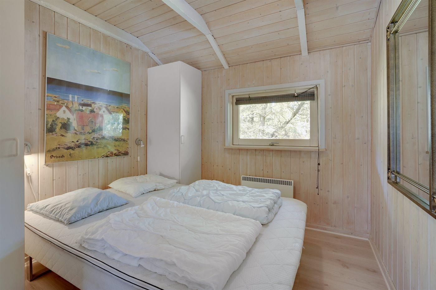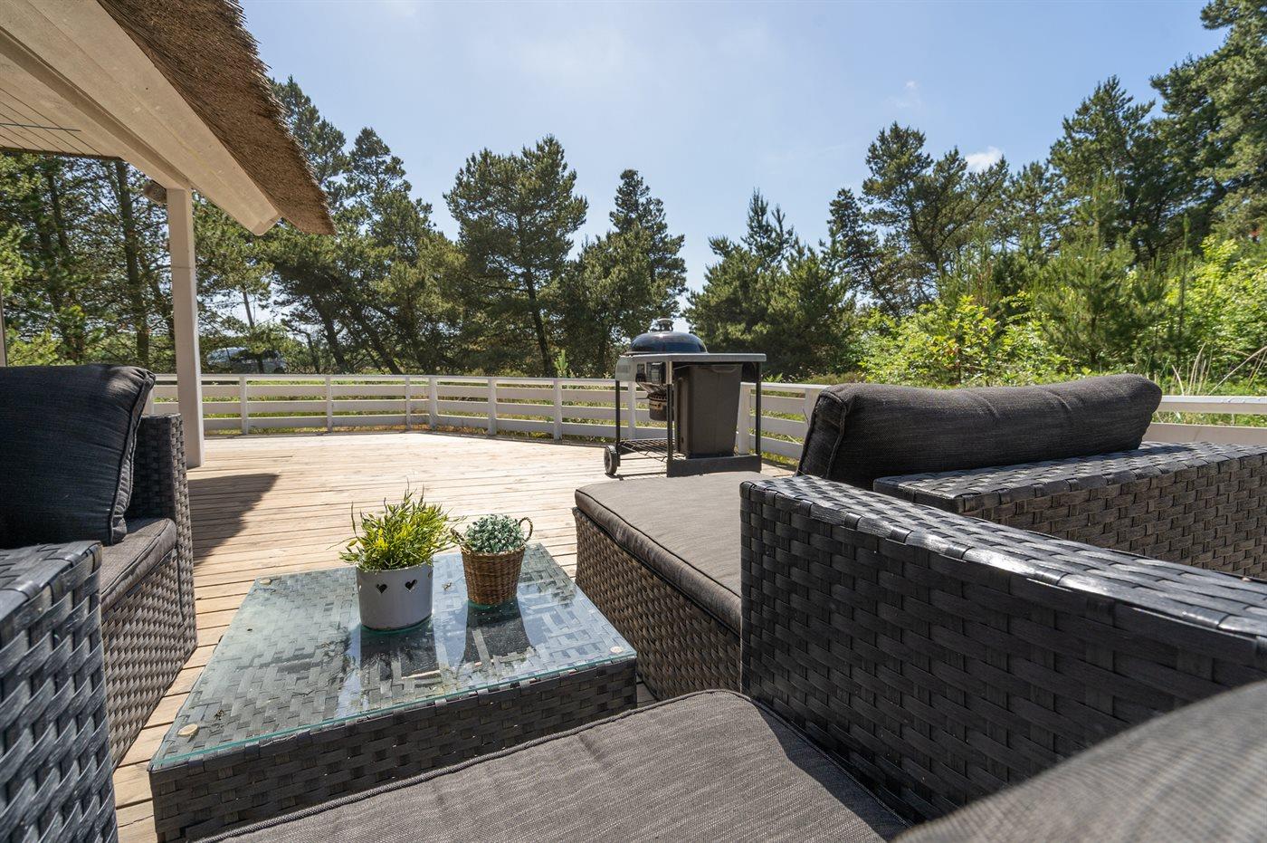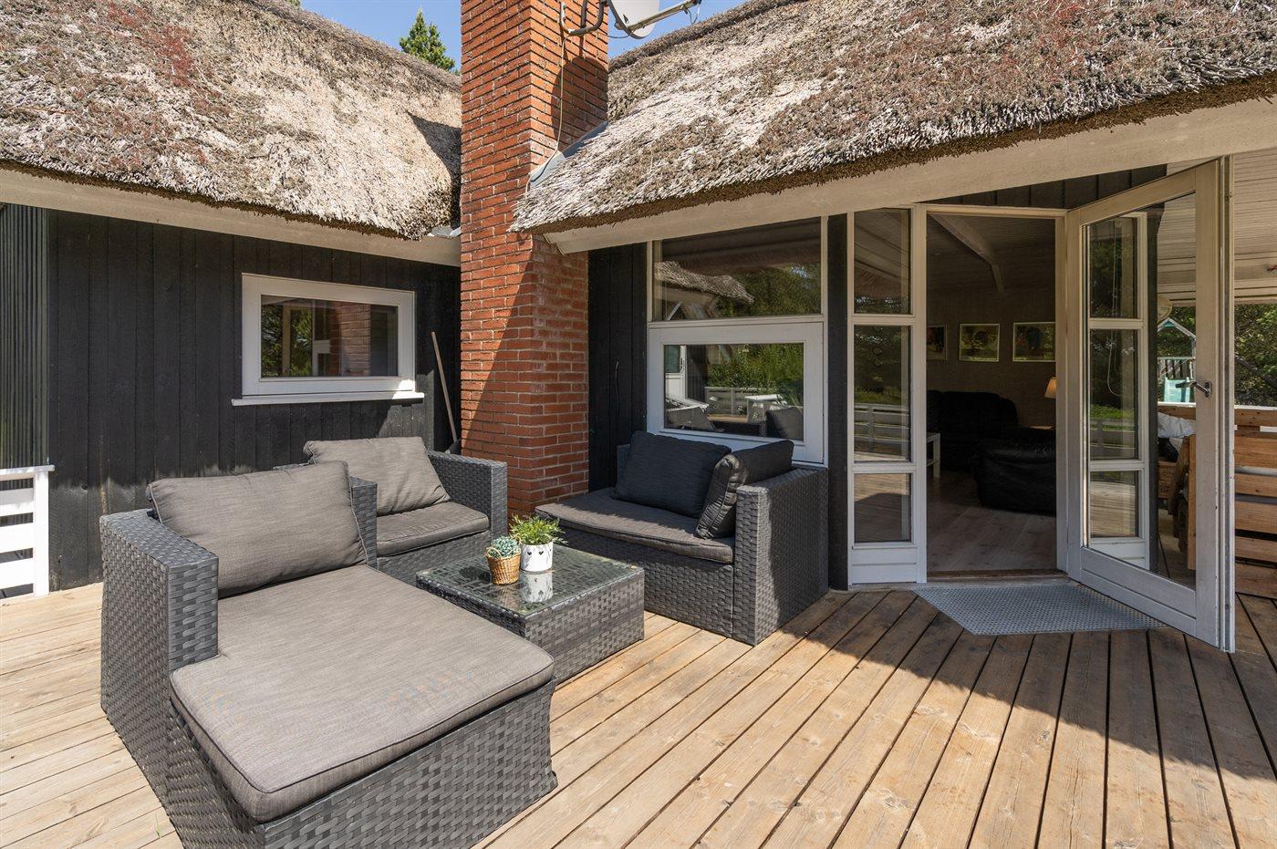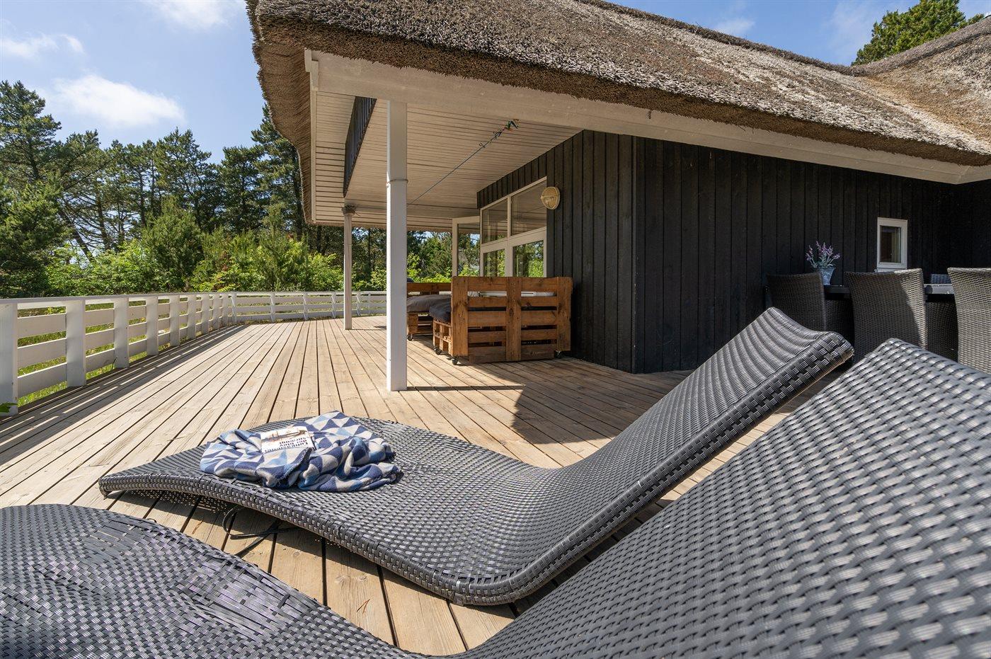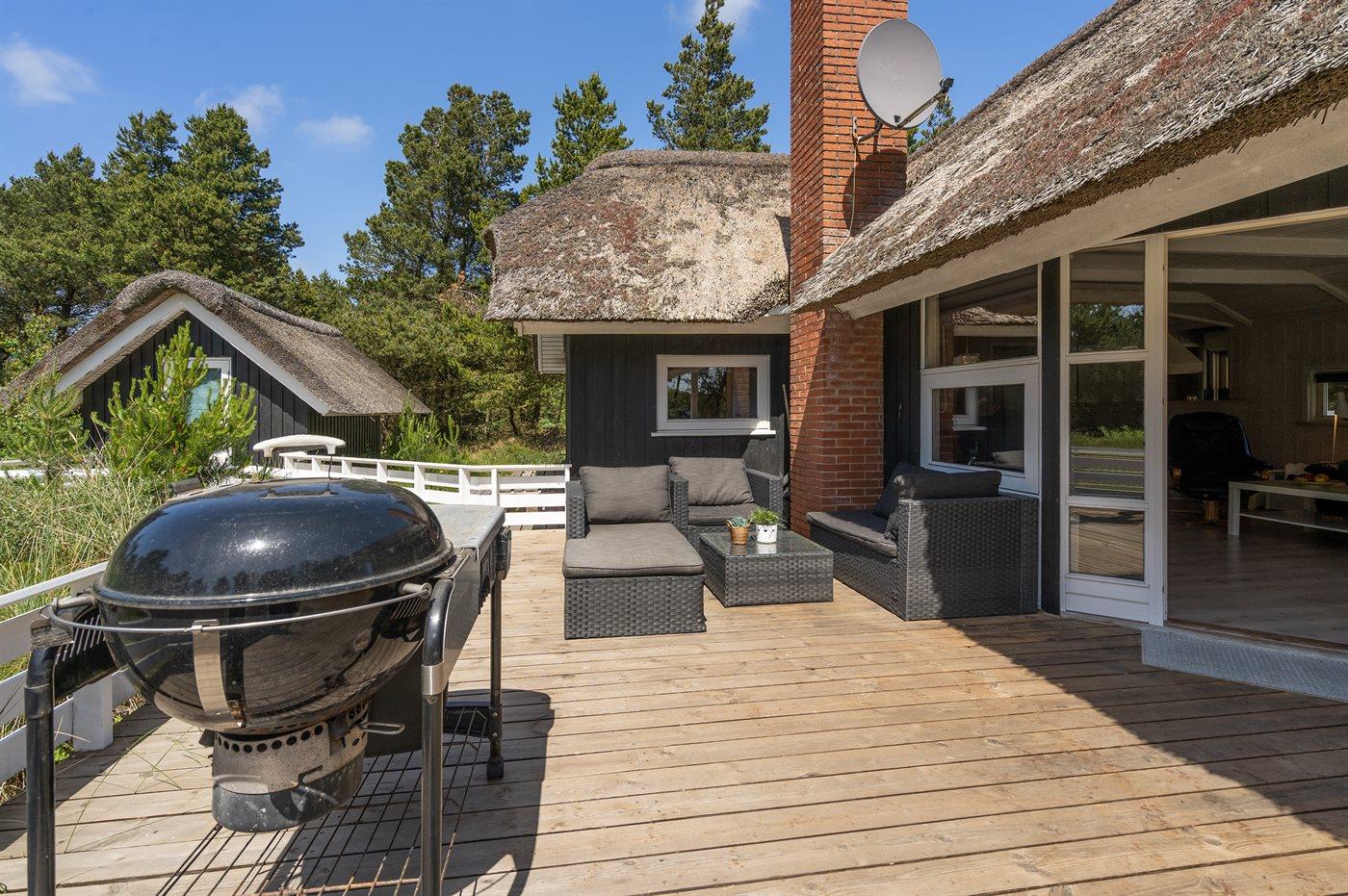 Hübsches Ferienhaus aus Holz mit Reetdach, 1992 gebaut und 2011 renoviert, auf einem großen, zurückgezogenen Naturgrundstück mit Heidekraut gelegen. Das Grundstück liegt ungestört und ist von Bäumen umzäunt. Zum Haus gehört eine große, teils überdachte Terrasse mit gutem Windschutz und Gartenmöbeln. Badezimmer mit 2-Pers. Whirlpool, Fußbodenheizung, Dusche und direktem Zutritt zur Sauna. Die hübsche, helle Küche ist mit dem Esszimmer kombiniert und ist mit u. a. Geschirrspüler, Waschmaschine und Wäschetrockner. Das Wohnzimmer ist mit großen Fenstern, Kaminofen, DVD-Spieler, TV mit Satellitenanschluss und Stereoanlage mit CD-Spieler eingerichtet. Ferner kostenlose, kabellose Internetverbindung vorhanden (Computer ist mitzubringen). Die Schlafplätze verteilen sich auf 3 Zimmer; 1 mit Doppelbett, 1 mit Doppelbett und 1 Einzelbett sowie 1 mit Etagenbett und 1 Einzelbett. Für die kleinen Feriengäste stehen Kinderbett, Kinderhochstuhl, Sandkasten und Schaukel zur Verfügung.