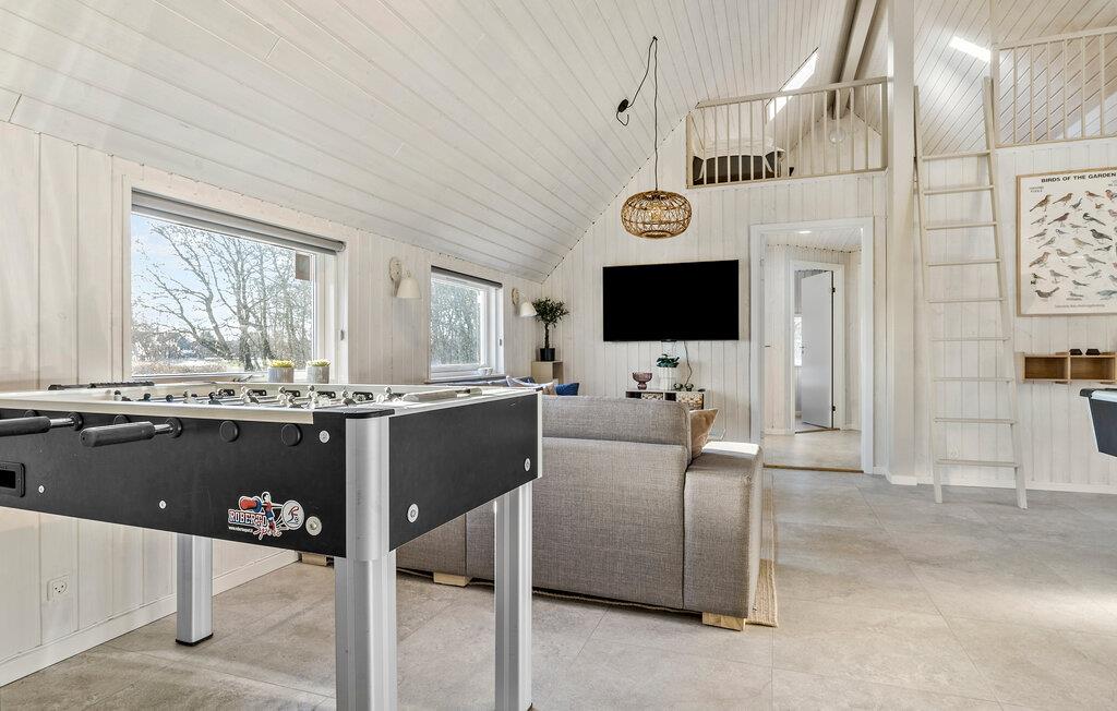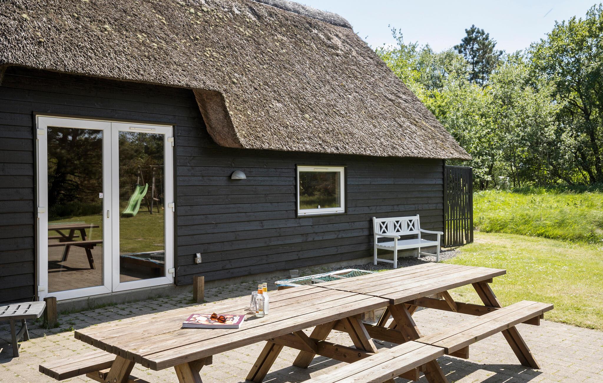 Dieses geräumige Feriendomizil heißt Sie mit einer komfortablen Einrichtung und ansprechenden Einrichtung willkommen. Treten Sie in das große Reetdachhaus ein und genießen das ansprechende Ambiente mit hellgebeiztem Holz, hohen Decken und einer Fülle an Entspannungsmöglichkeiten und Unterhaltung. Gehen Sie Ihrem Ferienalltag beim gemeinsamen Kochen in der gut ausgestatteten Küche oder plaudern am Esstisch nach. Von Wohnzimmer haben Sie einen guten Blick auf das Schwimmbad, wo Sie Ihren Kindern beim Rutschen zusehen und Sie selbst sich im Whirlpool oder der Sauna entspannen können. Ein weiterer Aktivitätsraum lädt bei jährlichen Familientreffen zu einem Dartturnier oder Billardspielen ein.