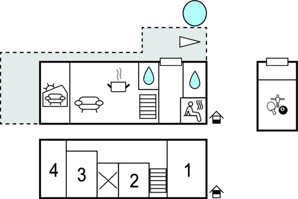Genießen Sie an heißen Sommertagen die Terrassen und spielen Sie im angrenzenden Aktivitätsgebäude Tischtennis. Im Garten ist der Grill bereit für schöne Grillabende mit köstlichen Mahlzeiten und die Kinder können sich auf dem Spielturm mit Schaukeln und einer Rutsche amüsieren.