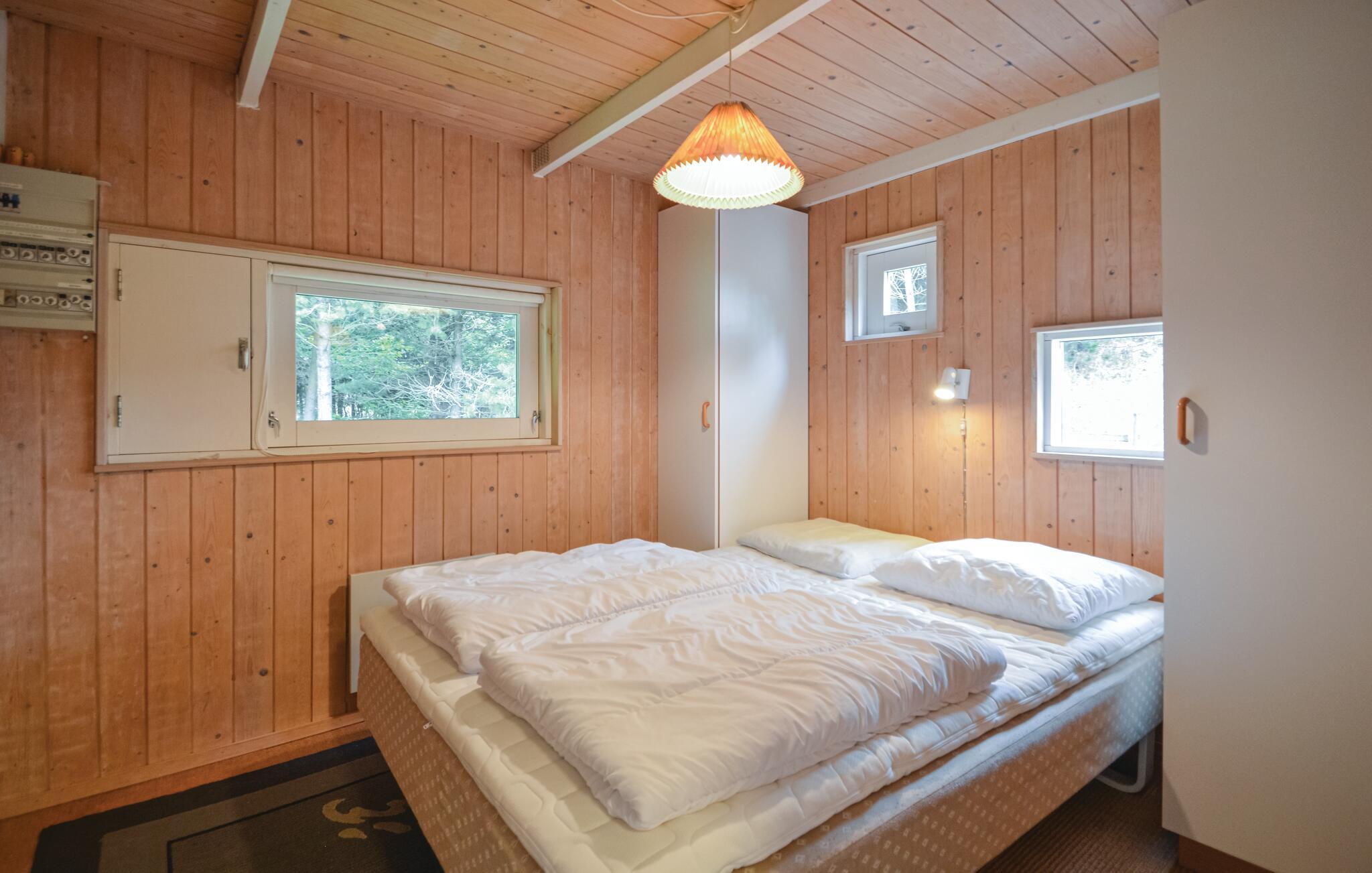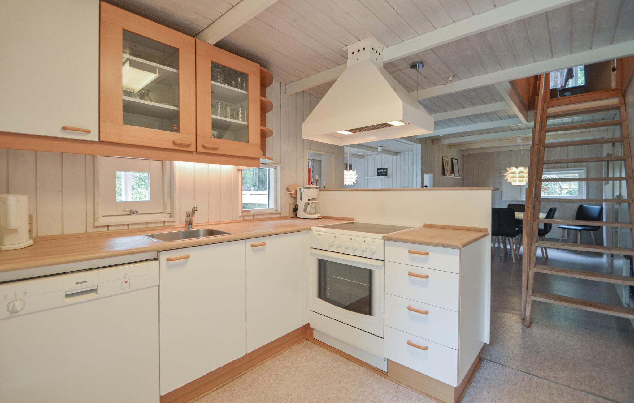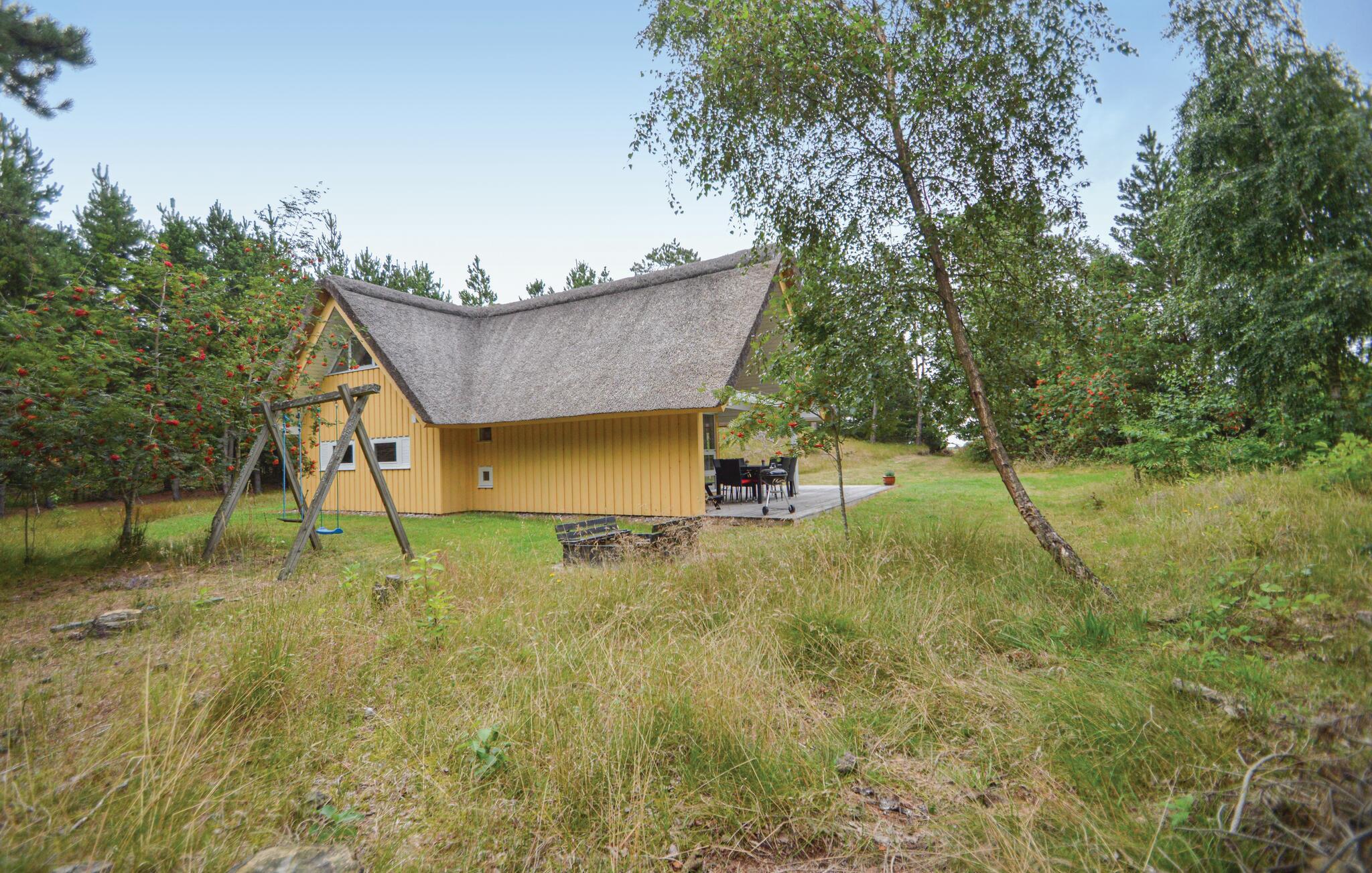 Schönes, reetgedecktes Ferienhaus auf einem hügeligen Grundstück. Der Garten ist von Bäumen umwachsen und bietet somit je nach Bedarf Sonne und Schatten. Hier wohnen Sie ganz nah an der Natur und vielleicht kommt sogar ein Reh in den Garten. Wenn es draußen kühler wird, können Sie es sich vor dem Kaminofen gemütlich machen. Die Küche liegt in der Mitte des Hauses und von dem Eckzimmer treten Sie auf die überdachte Terrasse. Das eine Schlafzimmer liegt im Erdgeschoss und hat ein Dopplebett. Die beiden anderen Schlafzimmer liegen im Obergeschoss und sind mit jeweils zwei Einzelbetten eingerichtet.