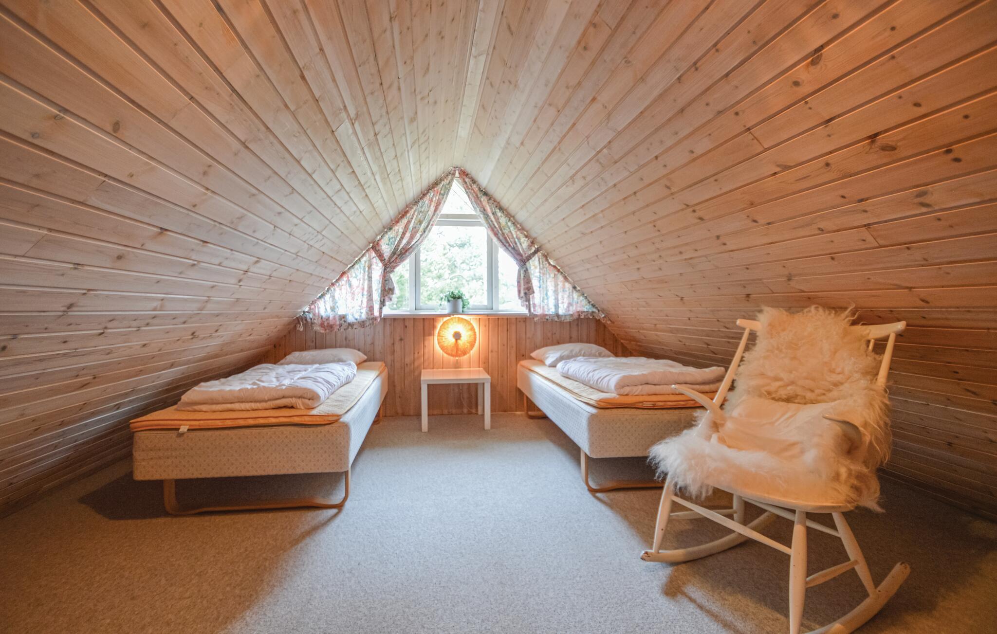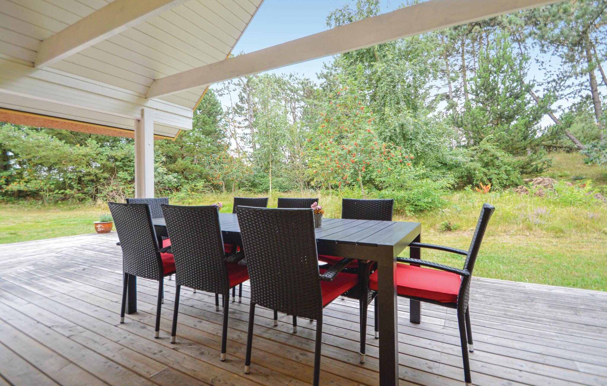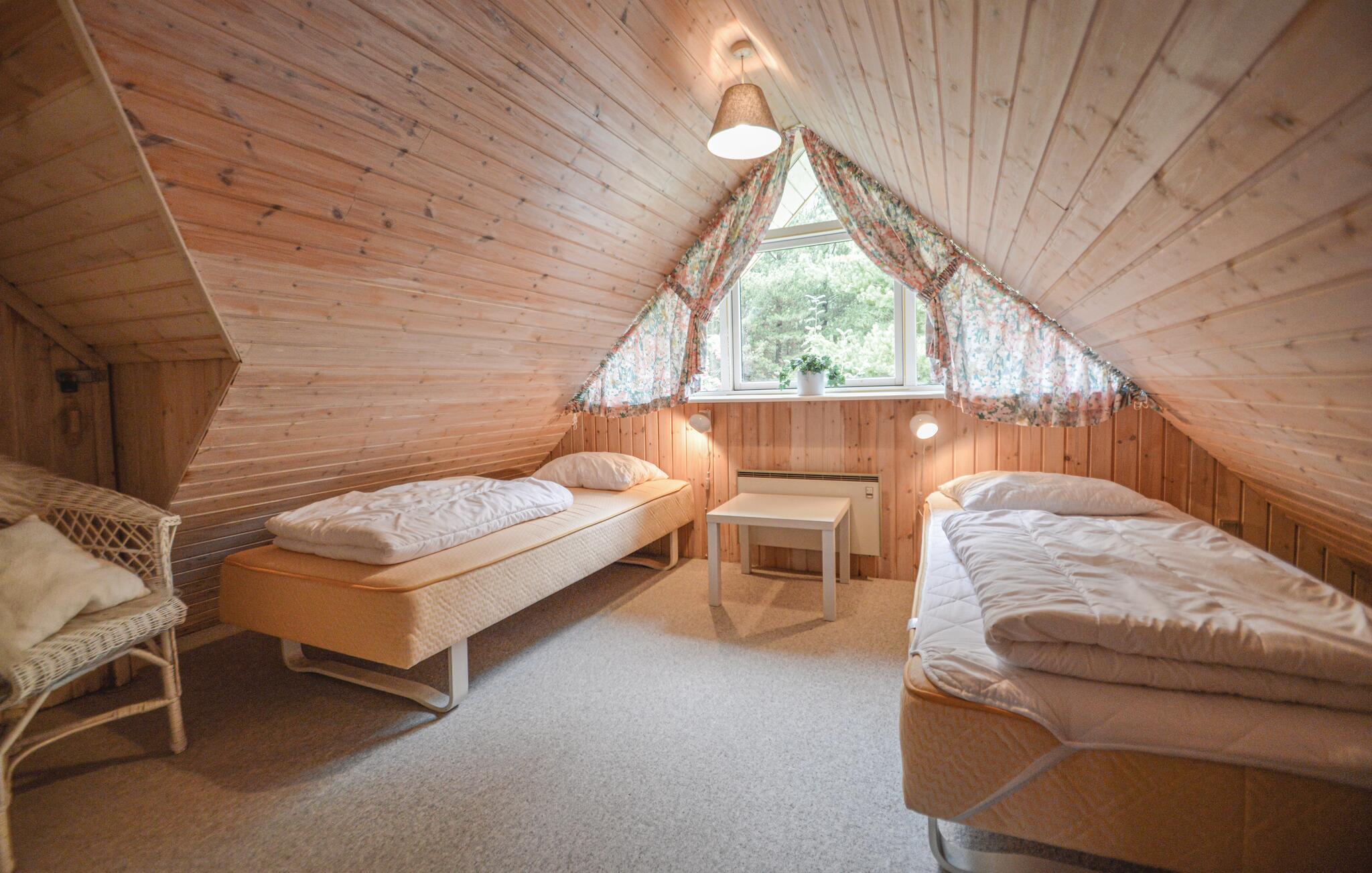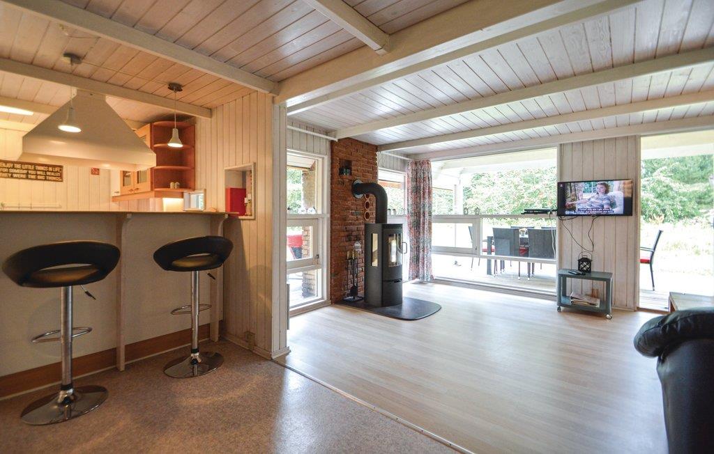 Schönes, reetgedecktes Ferienhaus auf einem hügeligen Grundstück. Der Garten ist von Bäumen umwachsen und bietet somit je nach Bedarf Sonne und Schatten. Hier wohnen Sie ganz nah an der Natur und vielleicht kommt sogar ein Reh in den Garten. Wenn es draußen kühler wird, können Sie es sich vor dem Kaminofen gemütlich machen. Die Küche liegt in der Mitte des Hauses und von dem Eckzimmer treten Sie auf die überdachte Terrasse. Das eine Schlafzimmer liegt im Erdgeschoss und hat ein Dopplebett. Die beiden anderen Schlafzimmer liegen im Obergeschoss und sind mit jeweils zwei Einzelbetten eingerichtet.