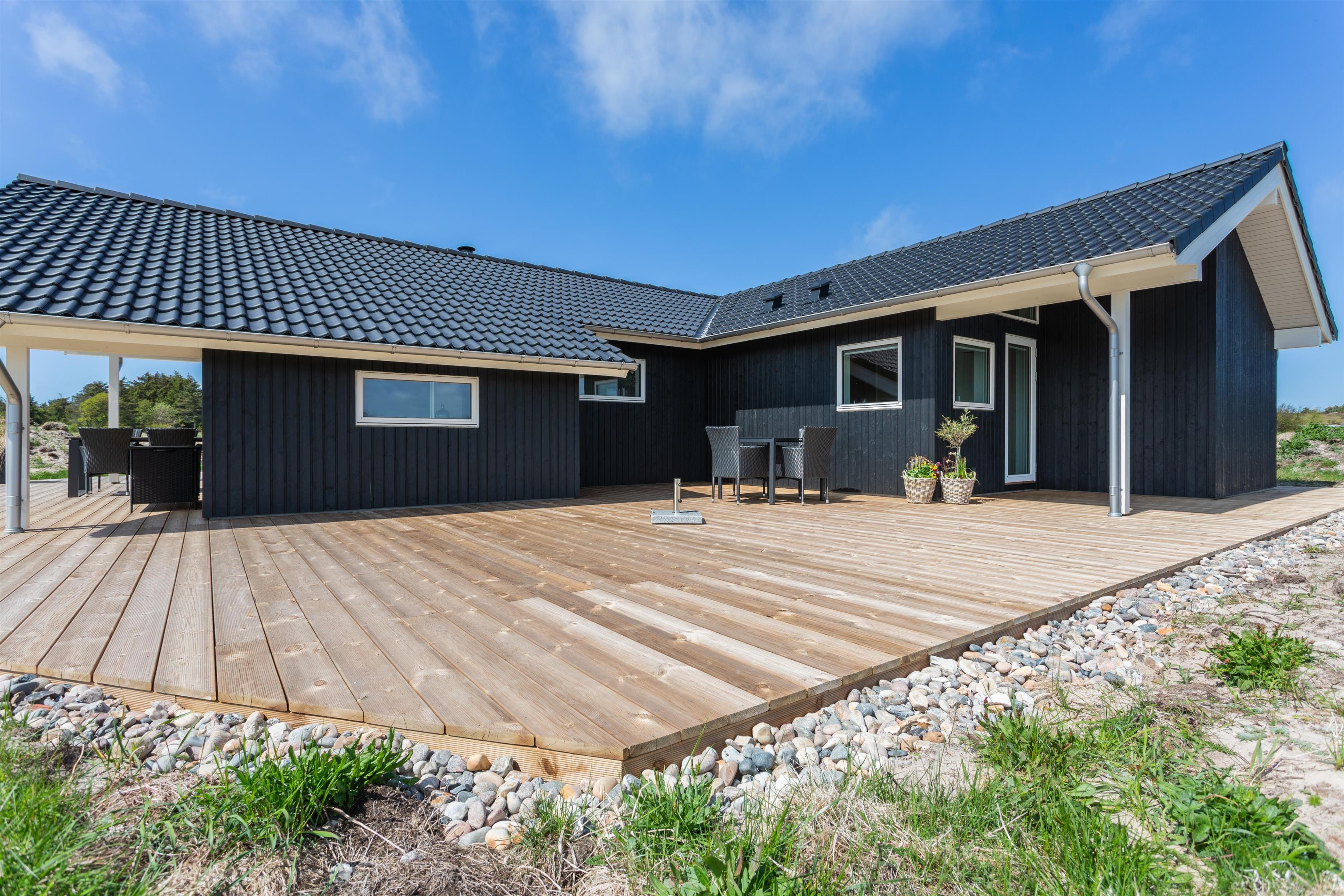 Das Ferienhaus bietet eine beeindruckende, teilweise überdachte Terrassenlandschaft mit gemütlichen geschützten Ecken, in denen Sie sich entspannen und den frischen Duft der Westküste sowie die wunderschöne Umgebung genießen können. Nach einem Ausflug zum Strand können Sie die Familie zu gemütlichen Momenten auf der großen, nach Süden ausgerichteten Terrasse versammeln, die ideal für Entspannung und Sommerhausgemütlichkeit ist.