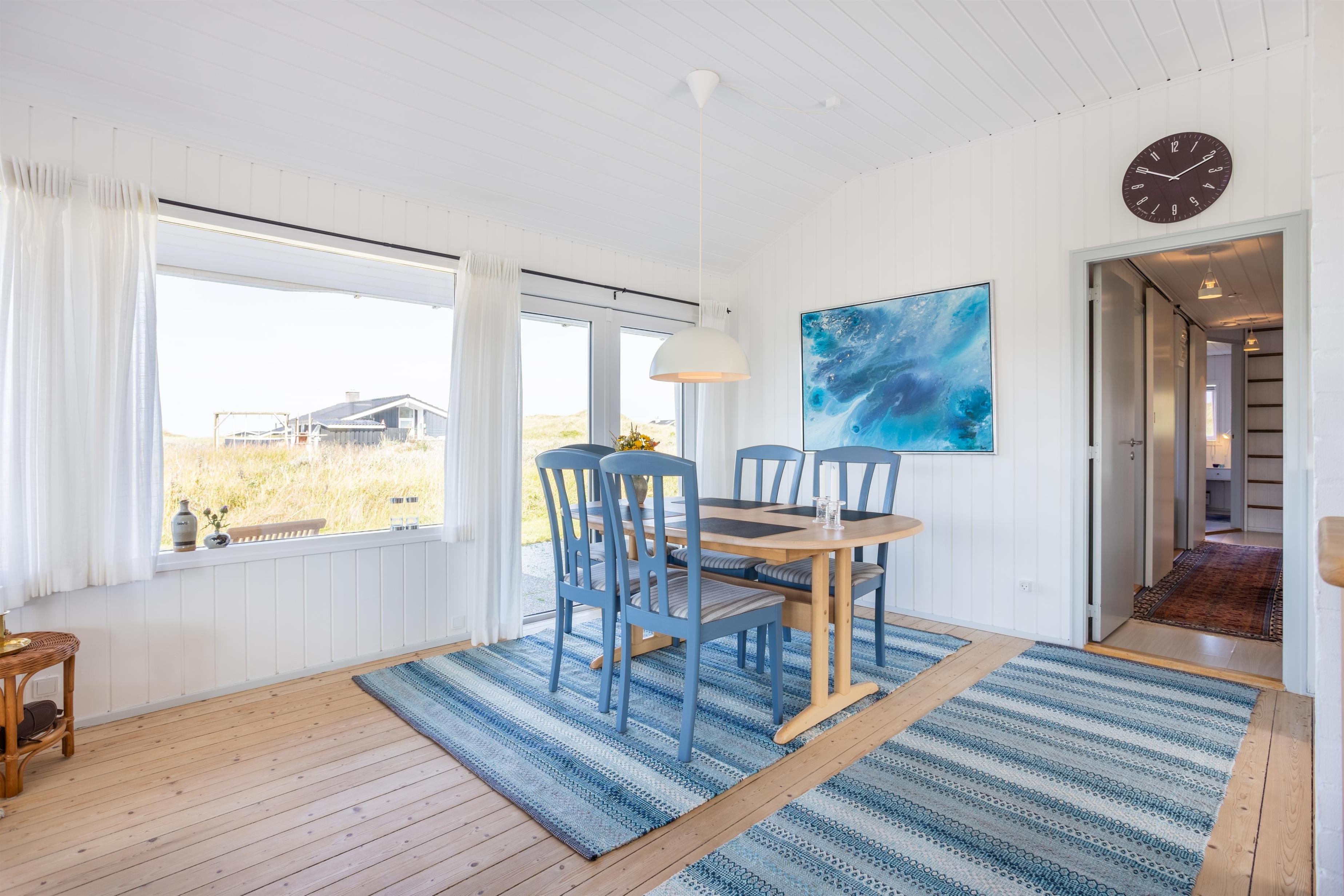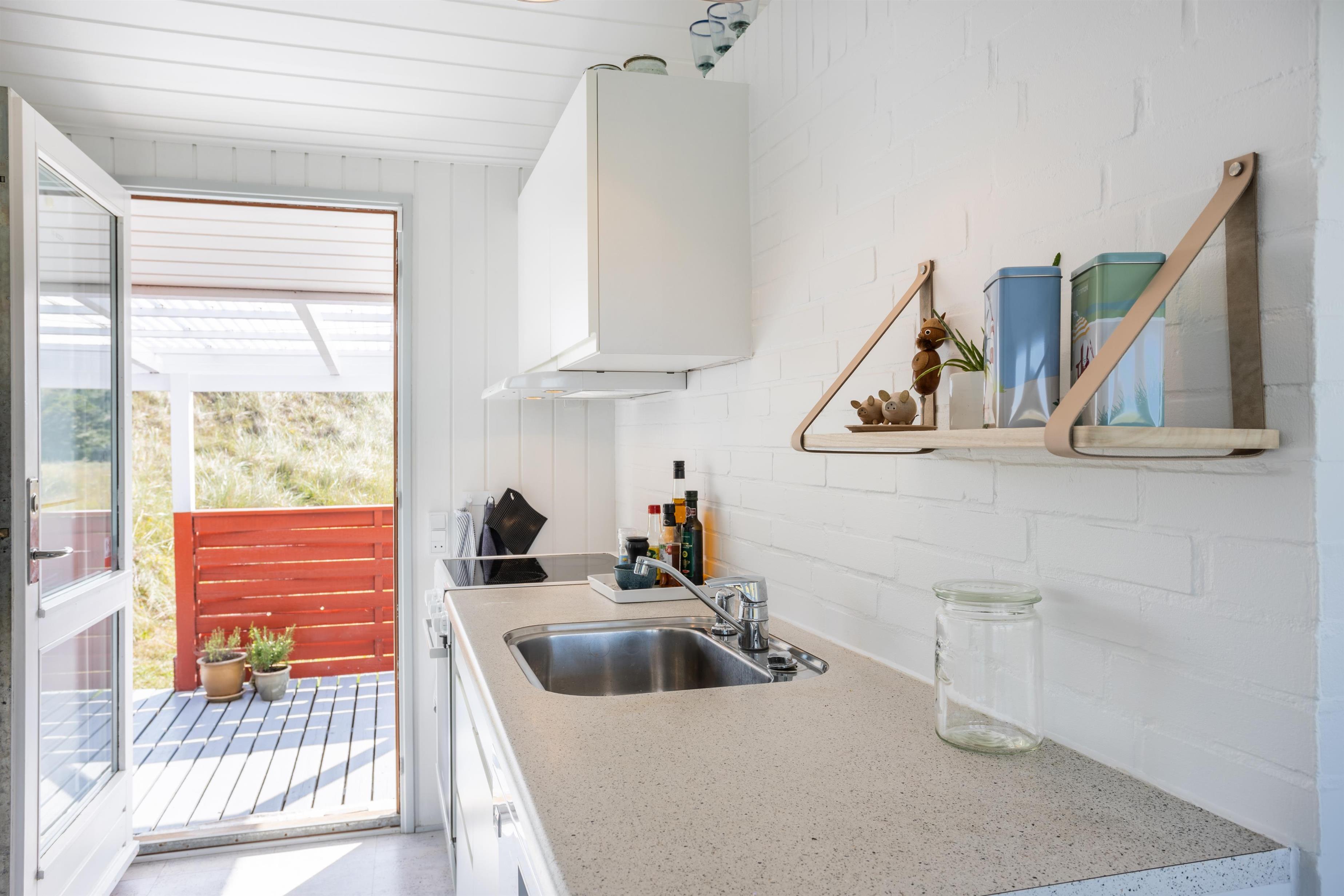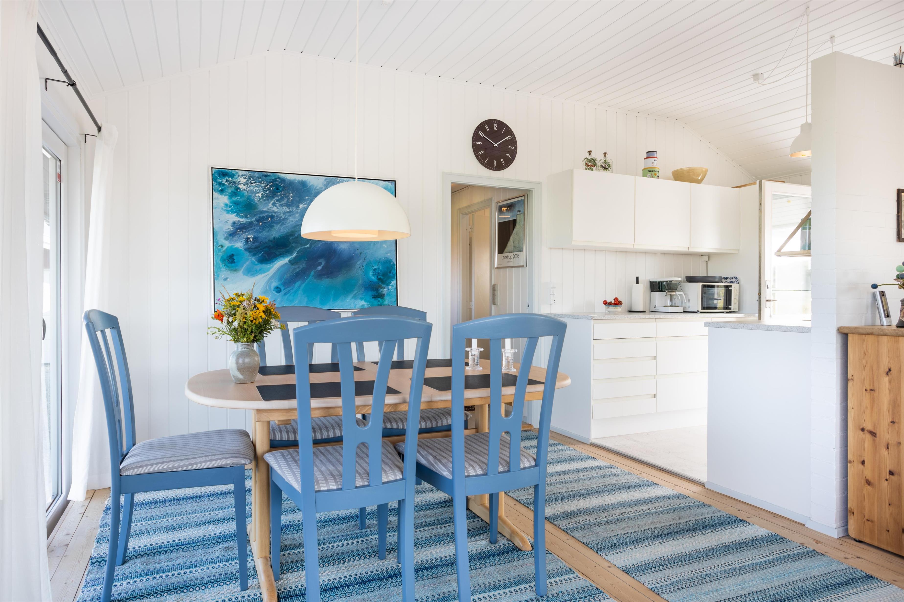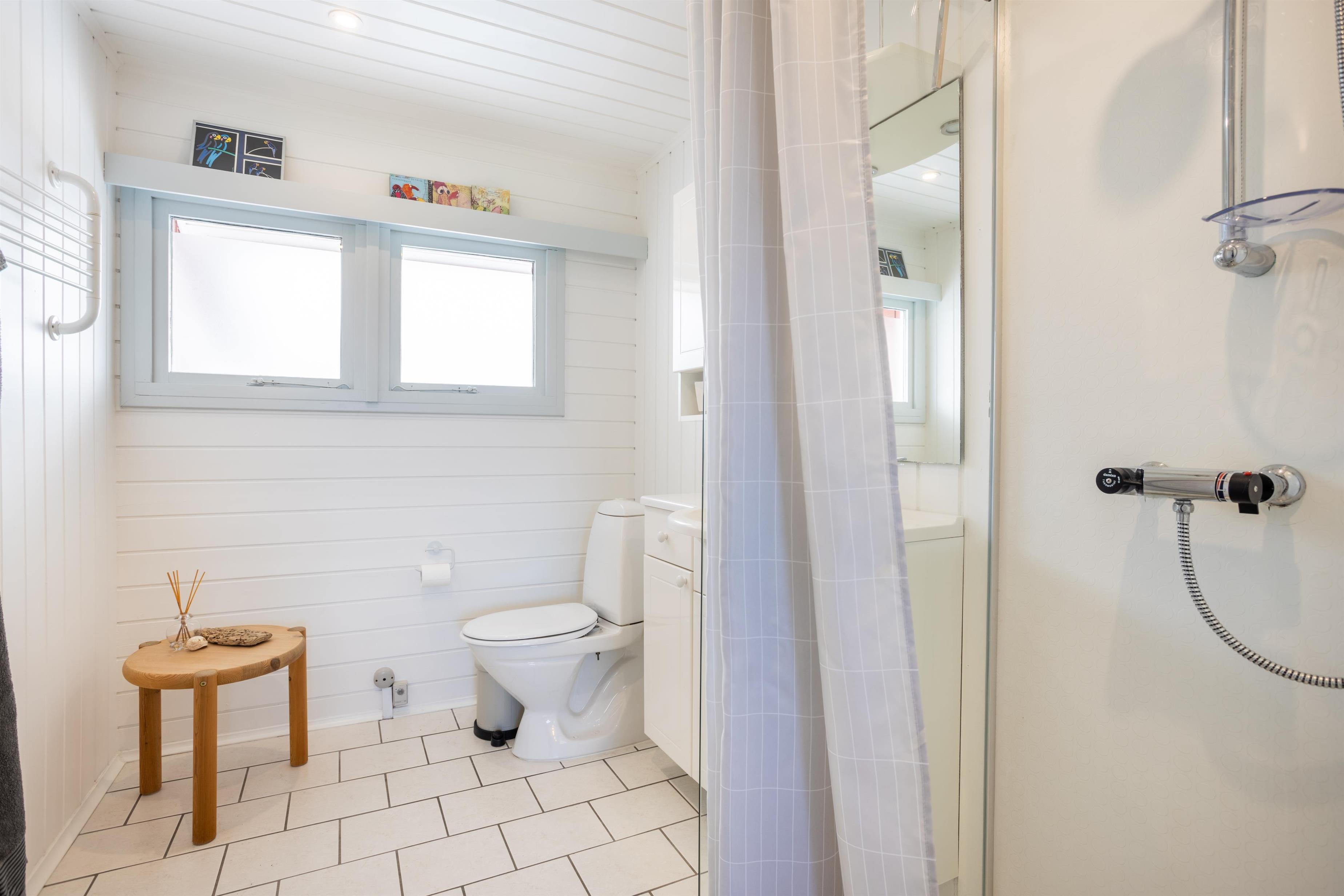 Dieses geräumige Ferienhaus bietet Platz für bis zu 6 Personen und überzeugt mit einer hellen und gut erhaltenen Einrichtung. Das Haus verfügt über einen offenen Grundriss, in dem Küche, Essbereich und Wohnzimmer miteinander verschmelzen und eine gemütliche Atmosphäre schaffen. Egal, ob Sie ein Brettspiel spielen, den Tag besprechen oder den Ausblick durch die großen Fenster genießen, hier ist Platz für Gemeinsamkeit. Der Kaminofen sorgt an kühlen Abenden für Wärme und Gemütlichkeit, während die Wärmepumpe das ganze Jahr über für ein angenehmes Raumklima sorgt. Es gibt zwei Badezimmer mit Dusche, was das Haus sowohl für Familien als auch für Freunde, die zusammen reisen, ideal macht. Außerdem gibt es eine praktische Außendusche – perfekt nach einem Strandbesuch. Das Ferienhaus bietet vier schöne Schlafzimmer. Zwei Zimmer haben Etagenbetten, wobei das untere Bett extra breit ist – perfekt für Kinder oder ein entspanntes Nickerchen am Tag.