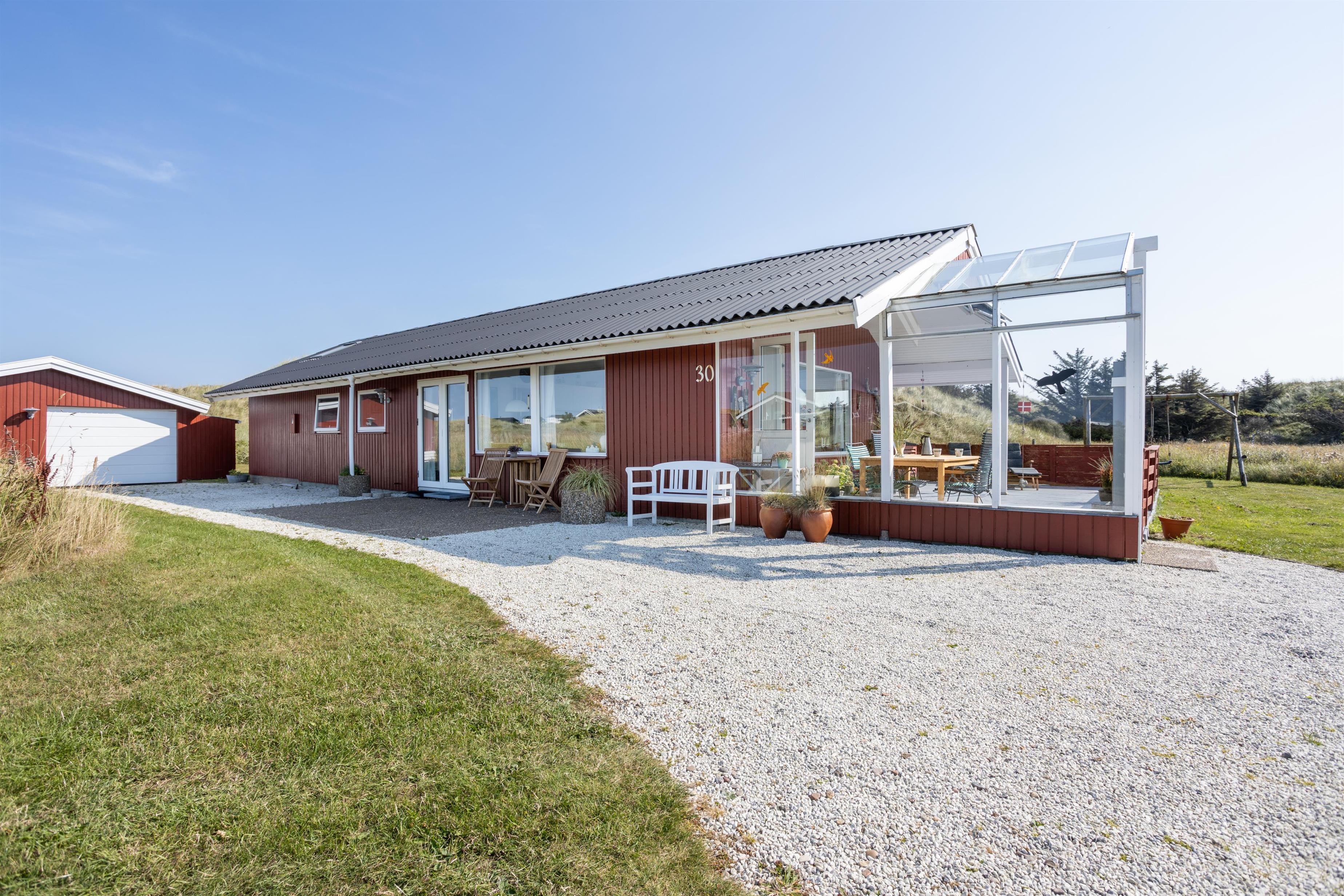 Das Haus liegt auf einem schönen Naturgrundstück, auf dem Sie die Ruhe und den Charme der Umgebung erleben können. Der große Rasen lädt zu Ballspielen und Spielmöglichkeiten ein, während die geräumigen Terrassen den perfekten Rahmen für Entspannung bieten. Hier finden Sie sowohl eine überdachte Terrasse für die Tage, an denen Sie Schatten oder Windschutz wünschen, als auch offene Terrassen, auf denen Sie die Sonne genießen können. Nahe dem Haus führt eine Treppe zu einem fantastischen Aussichtspunkt mit einem Tisch-Bank-Set – der ideale Ort, um den Sonnenuntergang über der Westküste zu genießen, während der Himmel in wunderschönen Farben leuchtet. Die Natur rund um das Ferienhaus ist reich an Wildtieren, und es ist nicht ungewöhnlich, Fasane oder Rehe vorbeiziehen zu sehen.
