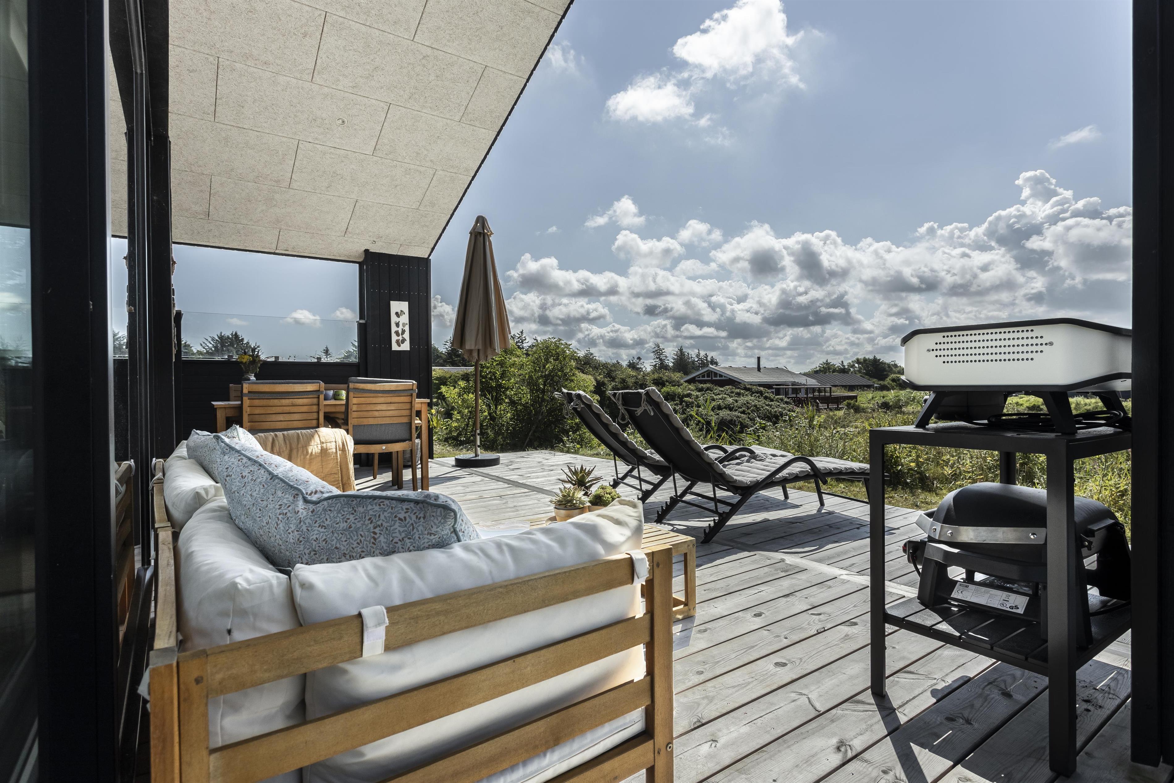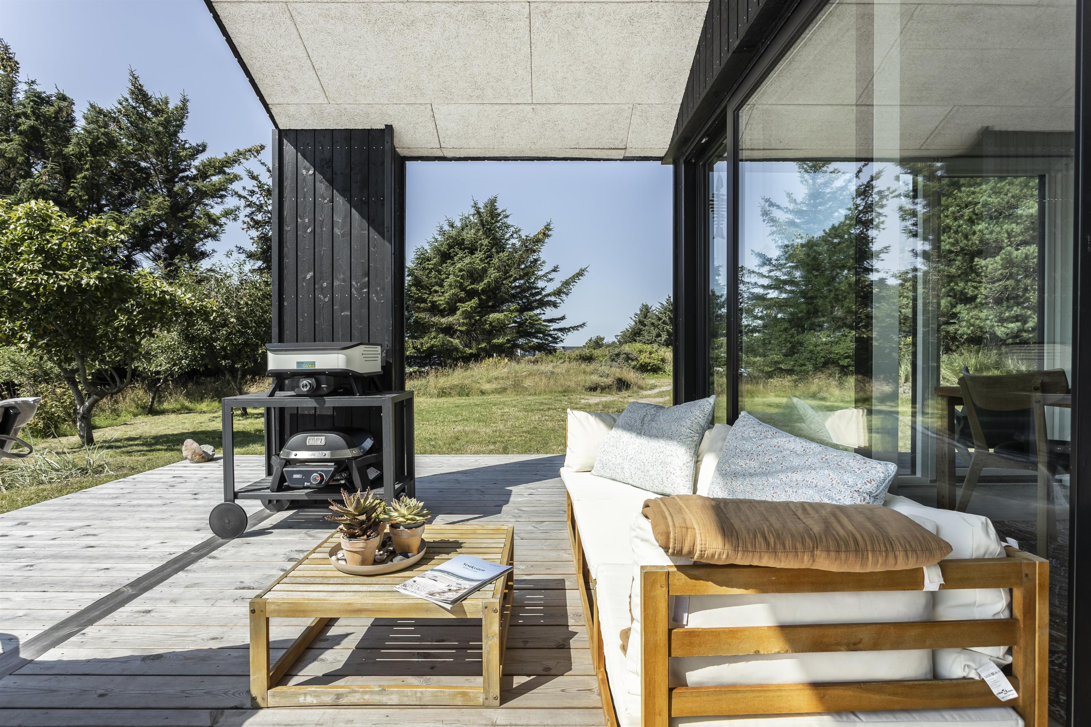 Vom Wohnbereich aus gelangen Sie direkt auf eine schöne, überdachte Terrasse. Hier können Sie viele Sommerabende in Ruhe genießen, während Sie den Blick über die Tornby-Schlucht schweifen lassen. Zünden Sie den Elektrogrill an und genießen Sie ein Glas Wein, während das Fleisch fertig gart. Rund um das Haus gibt es kleine gemütliche Ecken, in die Sie sich je nach Sonnenstand zurückziehen können – oder Schutz vor dem manchmal frischen Westwind finden. Auf dem Grundstück gibt es viel Platz für Ballspiele, eine Runde Kubb oder eine erfrischende Wasserschlacht.
