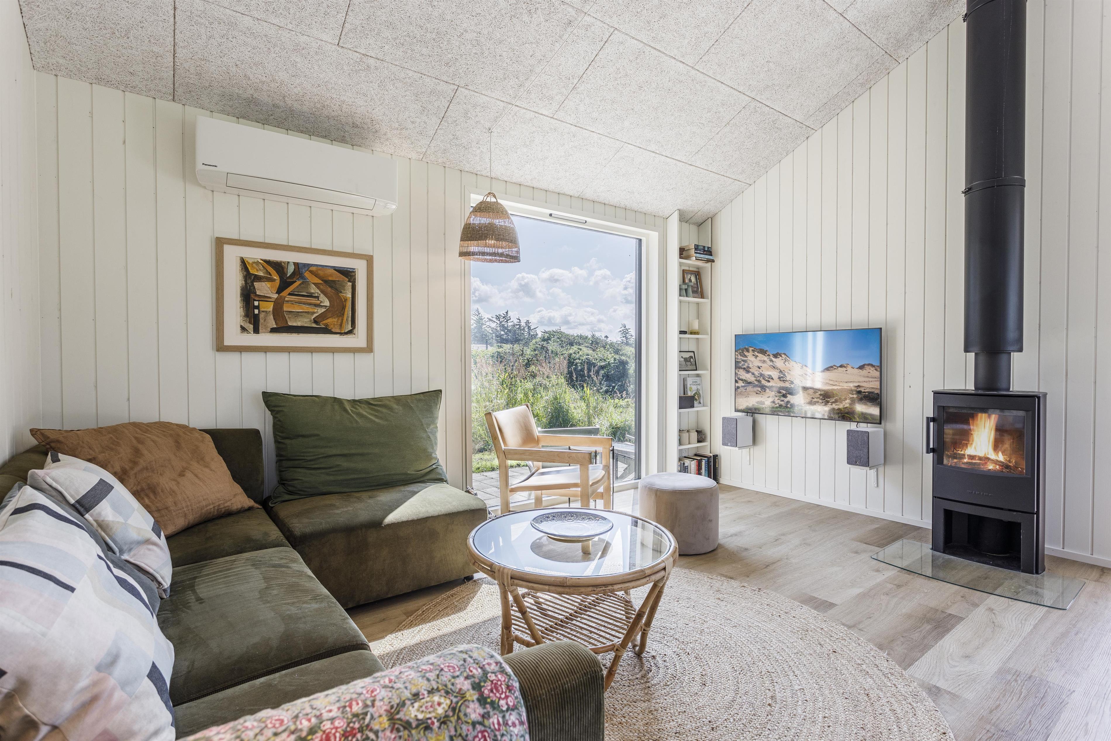 Der Wohnbereich verfügt über große Fenster, die die Natur und die Sonne ins Haus holen. Die hohe Decke schafft ein wunderbares Raumgefühl. Eine Wärmepumpe sorgt für ein angenehmes Raumklima im gesamten Haus, während ein Kamin an kühleren Abenden für Behaglichkeit sorgt.