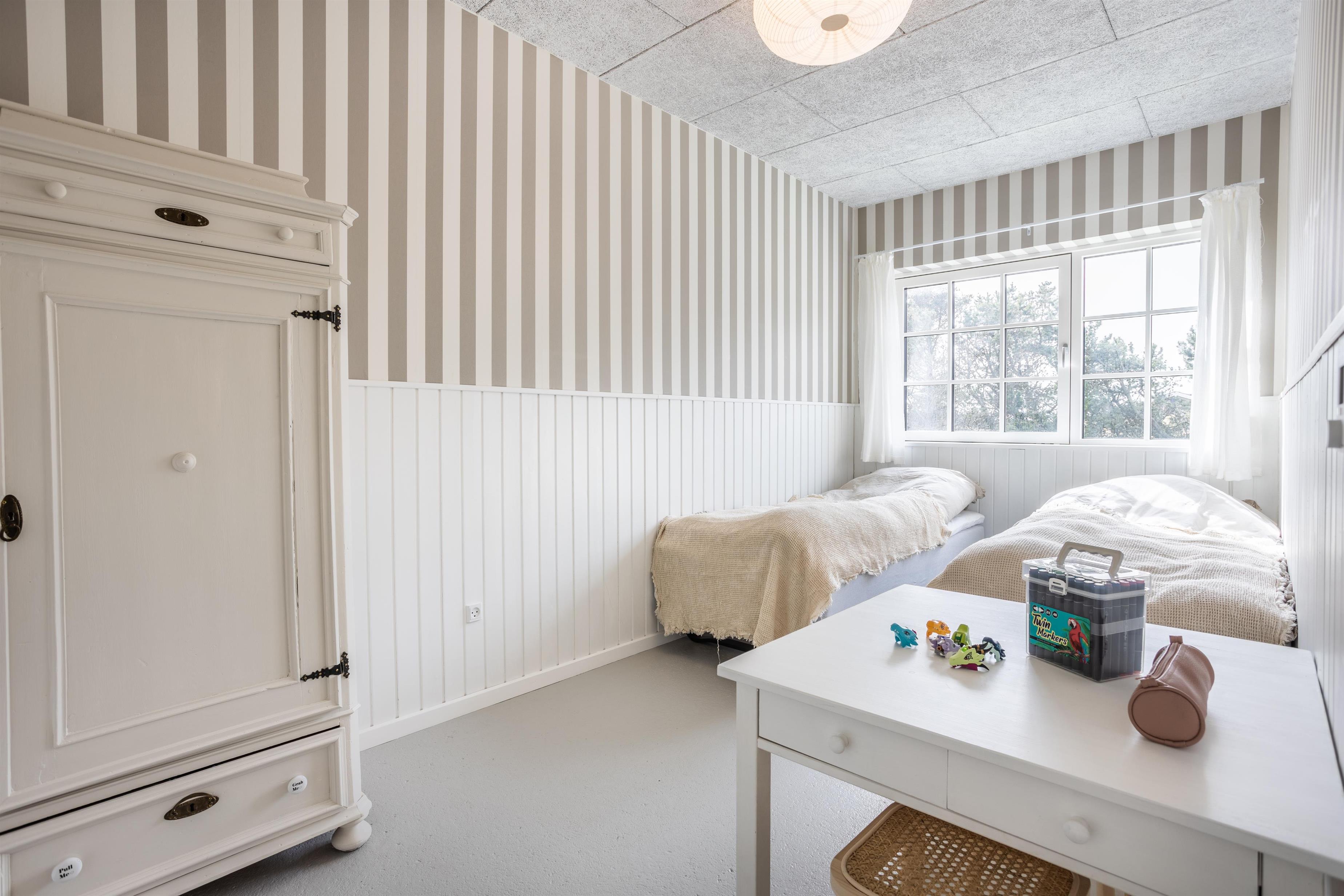 Die geschmackvoll eingerichteten Schlafzimmer im klassischen "Badehotel-Look" mit gestreiften Tapeten, hohen Paneelen und leichten Vorhängen schaffen eine ruhige und gemütliche Atmosphäre. Das Ferienhaus verfügt über ein modernes Badezimmer mit Dusche sowie ein zusätzliches Gäste-WC – ideal für größere Familien. Durch die clevere Raumnutzung bietet das Haus komfortablen Platz für bis zu sechs Personen.