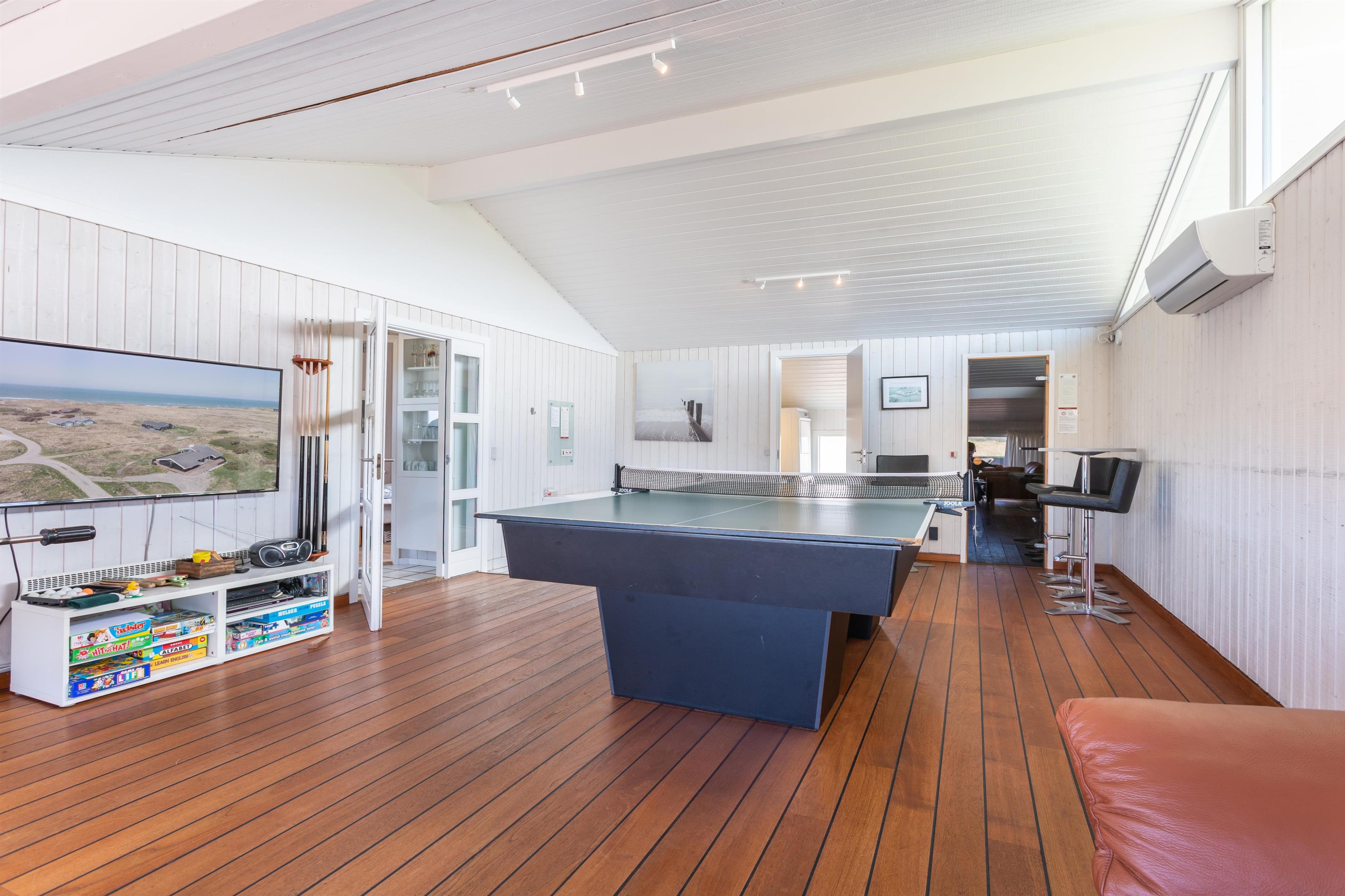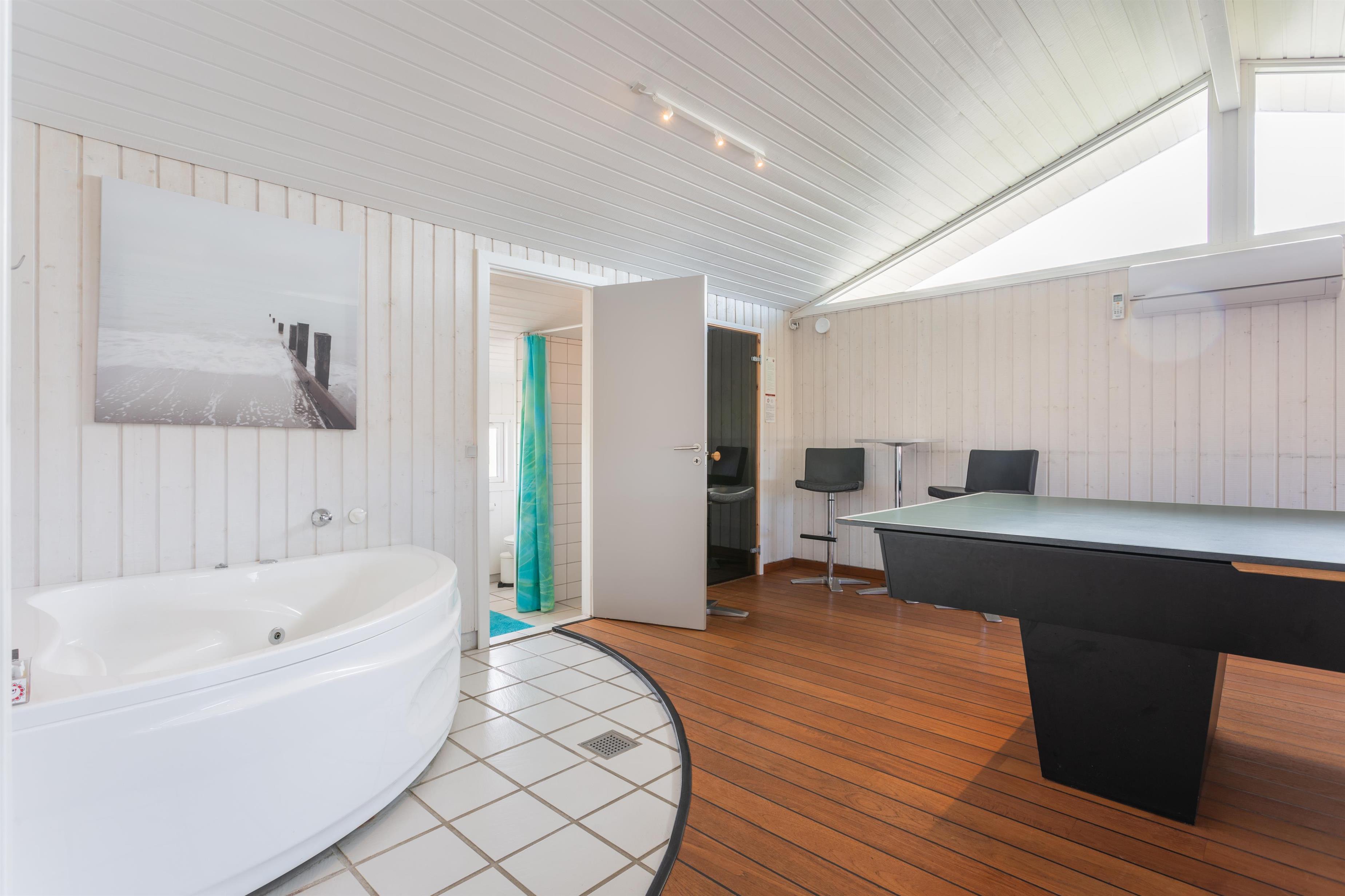 Für die aktiven Gäste bietet das Ferienhaus einen aufregenden Aktivitätsraum mit Tischtennis und Tischfußball – perfekt für Regentage, kühlere Monate oder einen gemütlichen Abend. Für entspannendere Momente könnt ihr sowohl die Sauna als auch den Whirlpool genießen, die dem Urlaubserlebnis eine Extraportion Luxus verleihen.