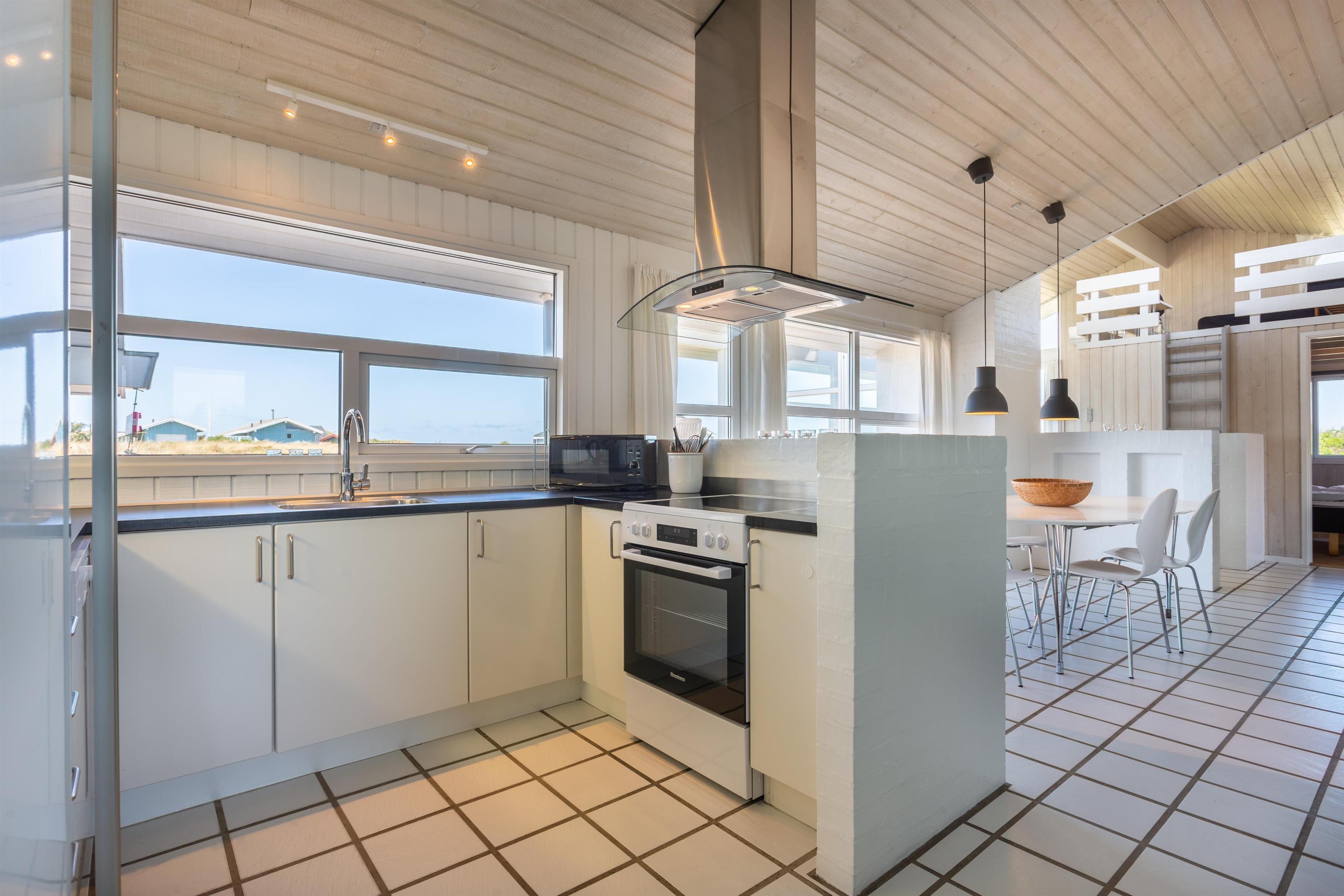 Dieses moderne Ferienhaus ist stilvoll eingerichtet und bietet alles, was man für einen angenehmen und erholsamen Urlaub braucht. Das Herzstück des Hauses ist der offene Wohnbereich, der im Jahr 2025 mit neuen Esszimmerstühlen ausgestattet wurde – hier gehen Küche und Wohnzimmer harmonisch ineinander über und sind lediglich durch ein paar Stufen getrennt, die eine natürliche Abgrenzung zwischen Kochen und Entspannen schaffen. Hier kann man gemeinsam kochen, essen, Brettspiele spielen oder einen guten Film vor dem Kaminofen genießen.
