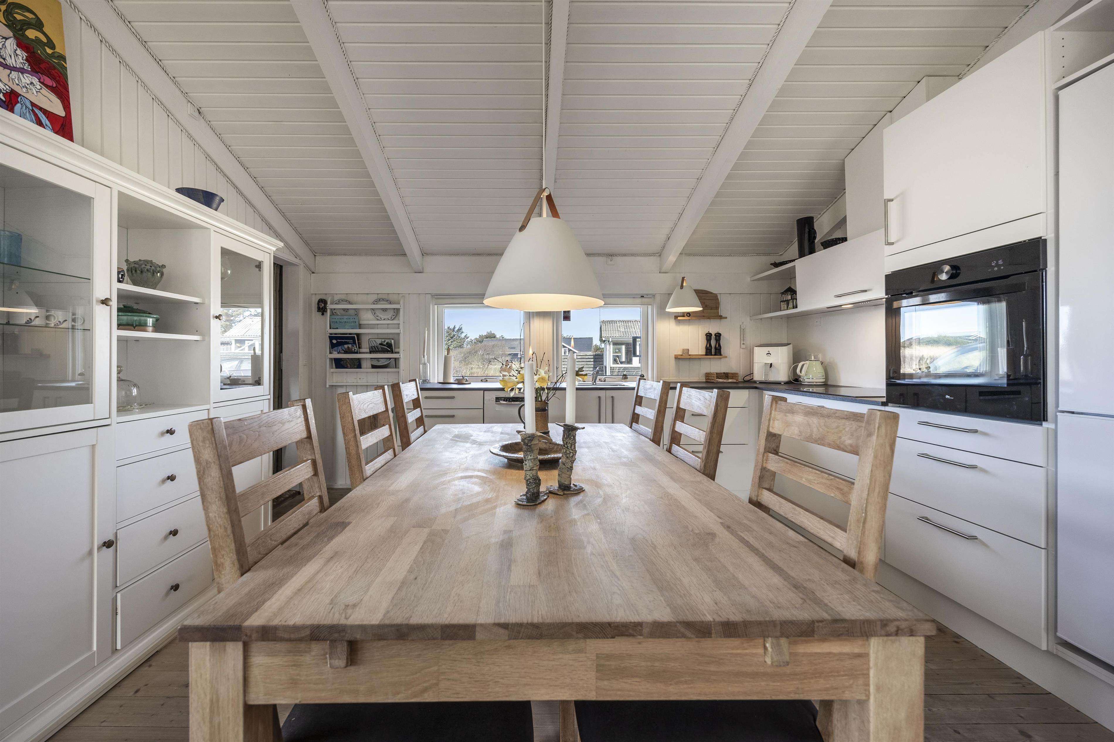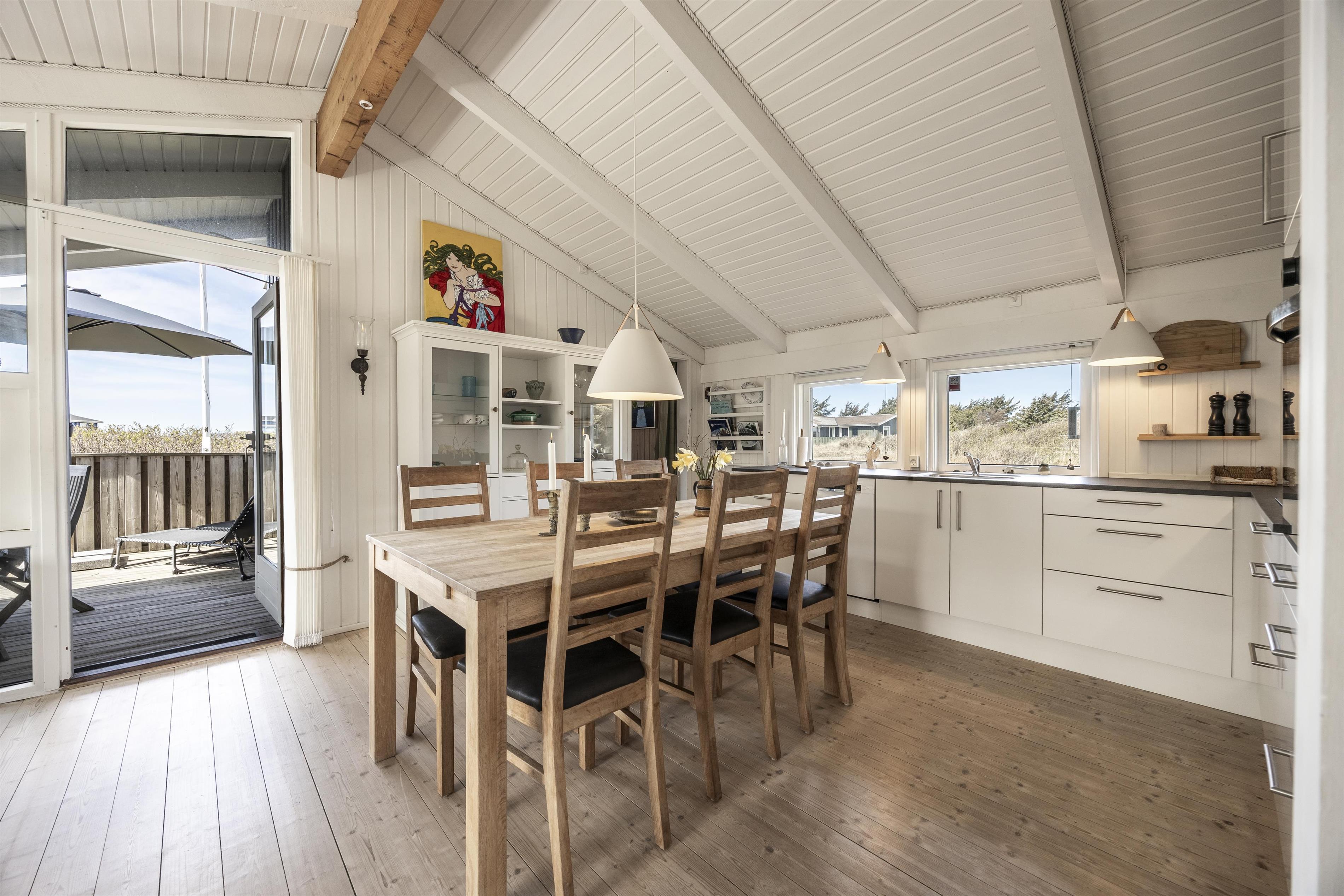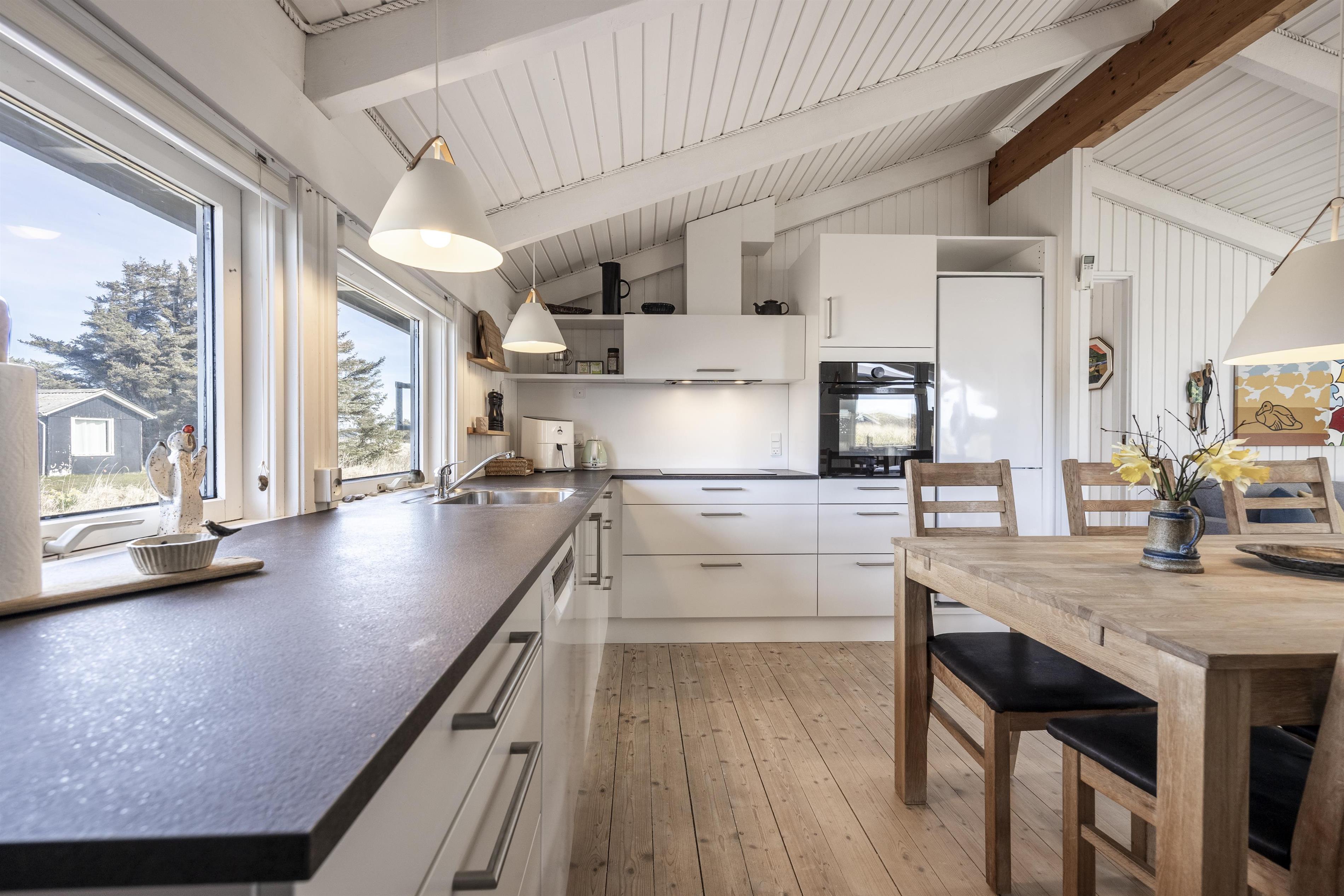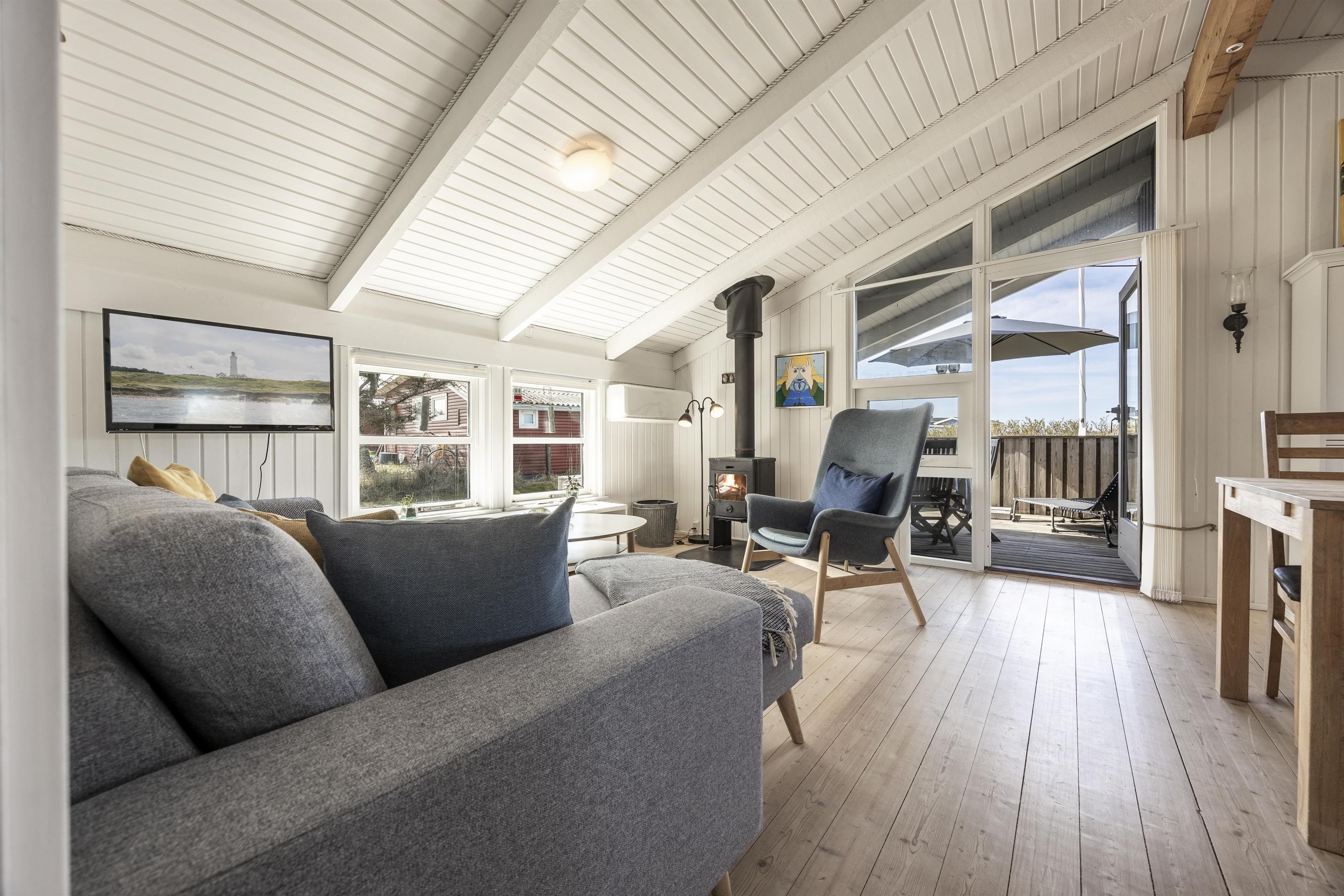 Willkommen in diesem charmanten Ferienhaus im schönen Tornby an der dänischen Westküste, nur wenige Kilometer südlich von Hirtshals. Das Haus bietet Platz für bis zu 4 Personen und empfängt Sie mit einem hellen und einladenden Wohnbereich, in dem große Fenster für eine natürliche Lichtdurchflutung sorgen. In der Sofaecke im Wohnzimmer sorgt ein Kaminofen an kühleren Tagen und Abenden für wohlige Wärme und eine gemütliche Atmosphäre. Das offene Dachgebälk verleiht dem Raum zusätzlich ein wunderbares Gefühl von Weite. Die Einrichtung ist funktional und heimelig mit komfortablen Möbeln und einer entspannten Atmosphäre, die zu gemeinsamen Stunden und Entspannung einlädt.
