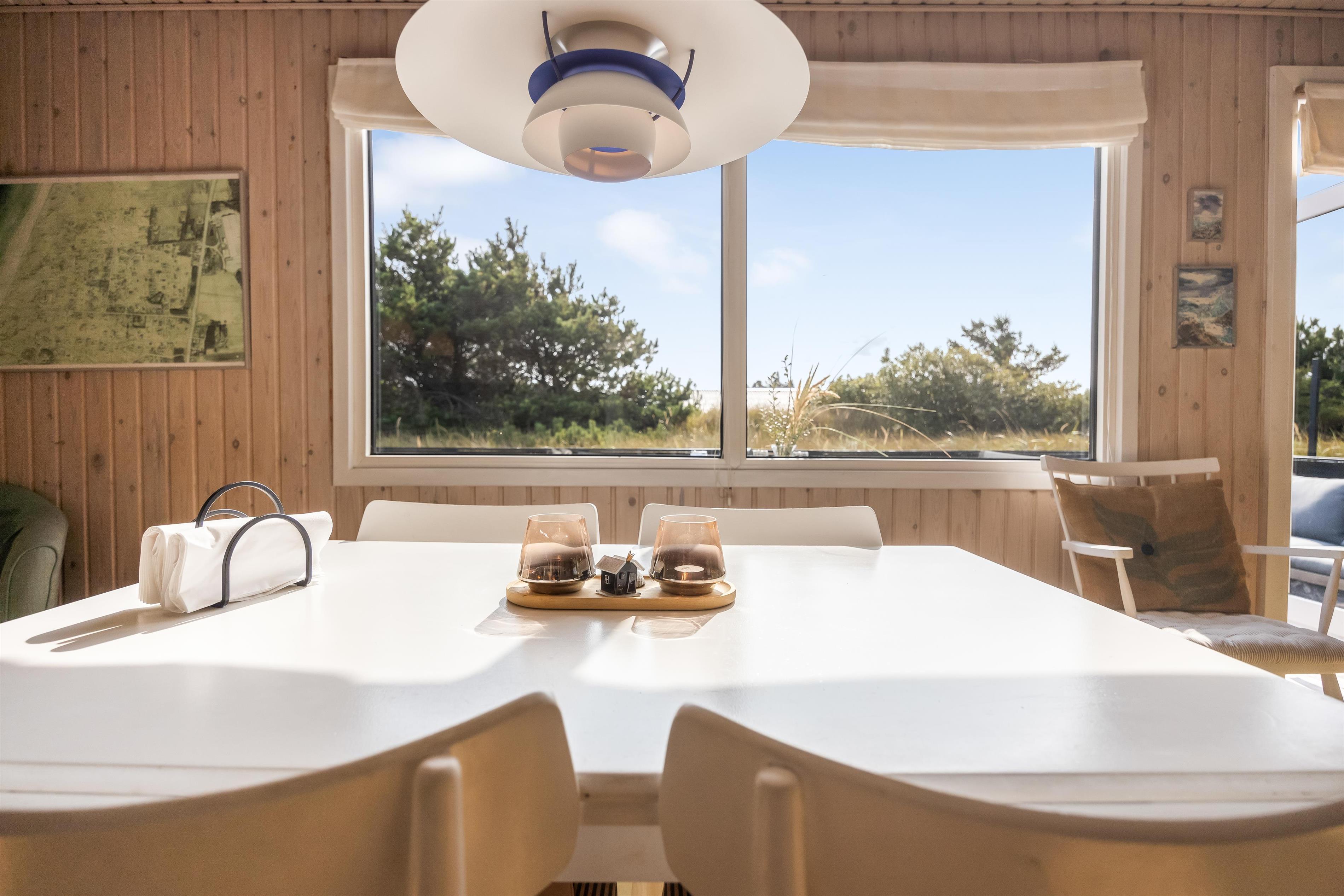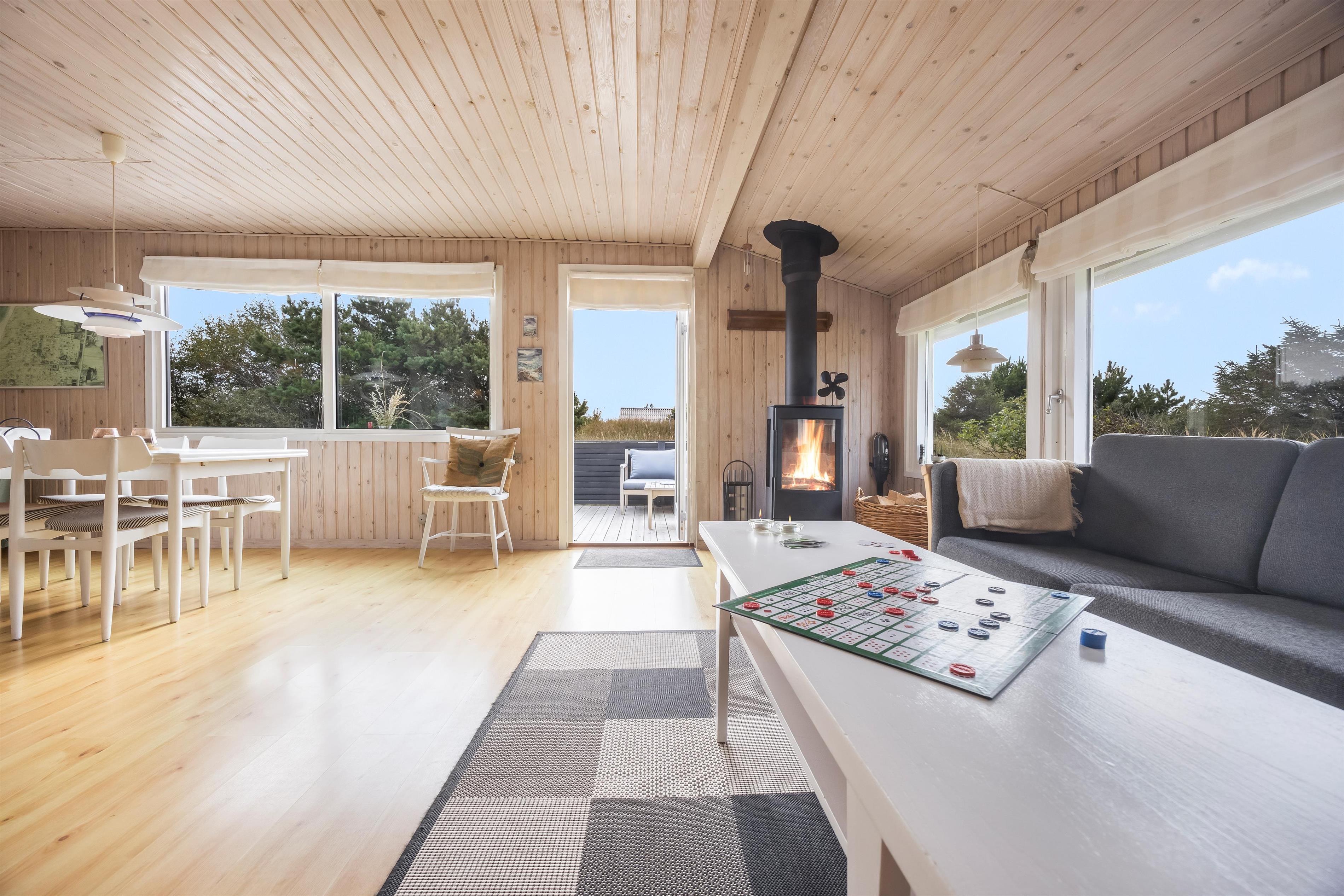 Im Wohnzimmer können Sie sich zu Brettspielen oder einem gemütlichen Abend vor dem Kaminofen versammeln, während sich die Wärme ausbreitet und der Blick in die Natur draußen zur Ruhe einlädt. Ein Ort, an dem Nähe und Familienzeit wirklich Platz haben. Hier ist genügend Raum für Familien oder Freunde, die gemeinsam Ferien im Sommerhaus in Strand- und Naturnähe verbringen möchten.