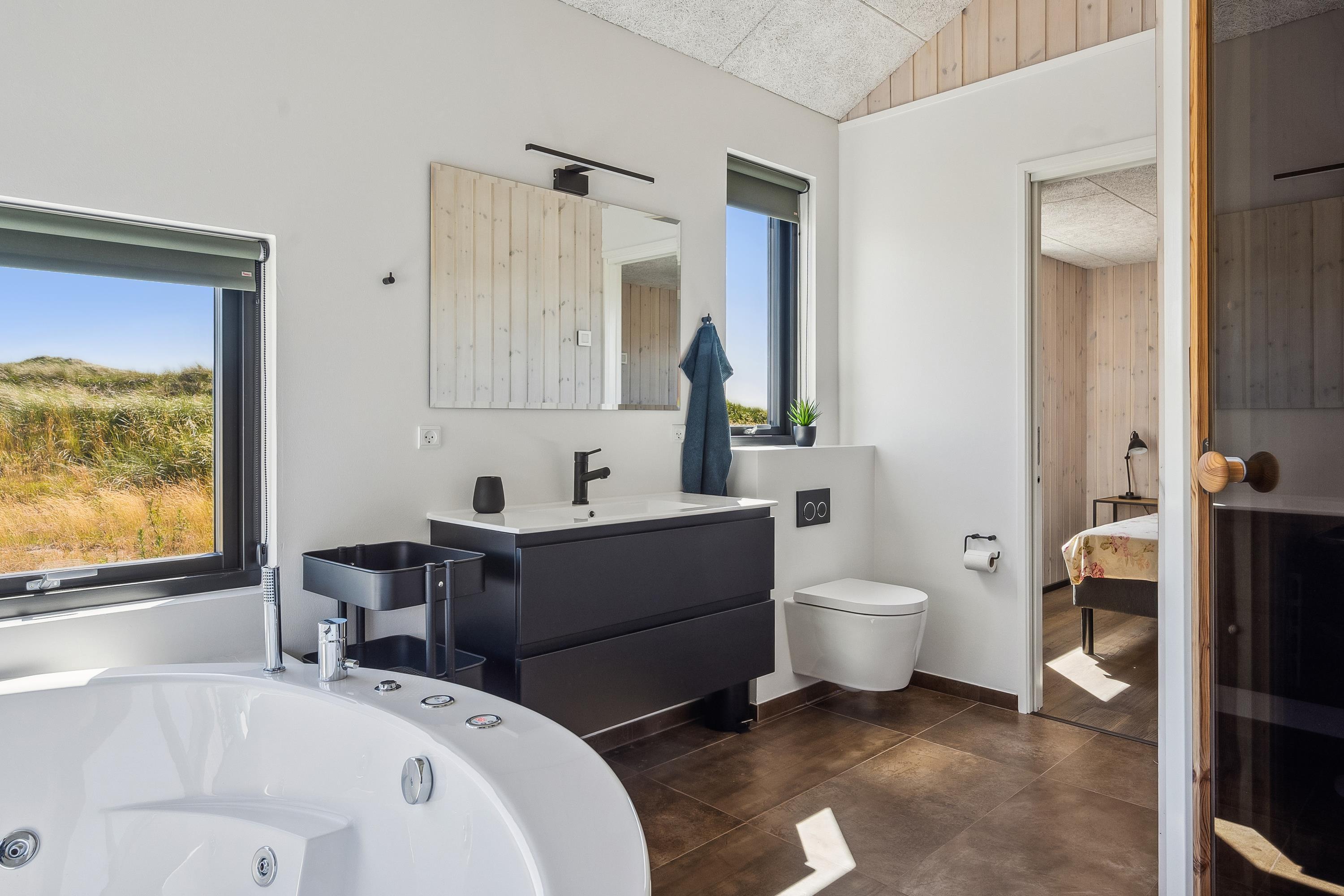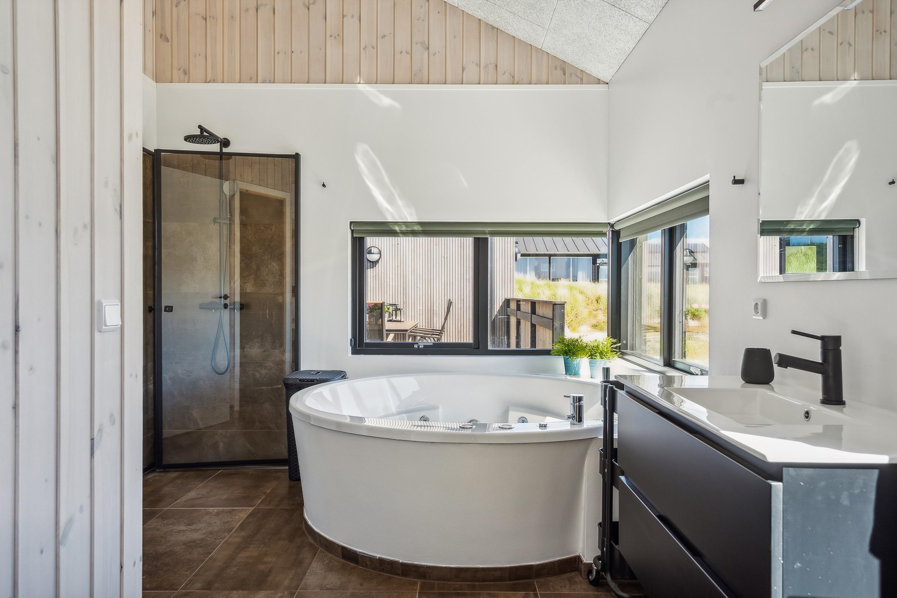 Das große Badezimmer bietet sowohl einen Whirlpool für sechs Personen als auch eine Sauna – die ideale Kombination aus Wellness und Entspannung. Im Hauptschlafzimmer können Sie in einem verstellbaren Bett liegen und durch das Fenster den Blick auf die blaue Horizontlinie der Nordsee genießen – sogar aus der Badewanne des angeschlossenen Badezimmers.