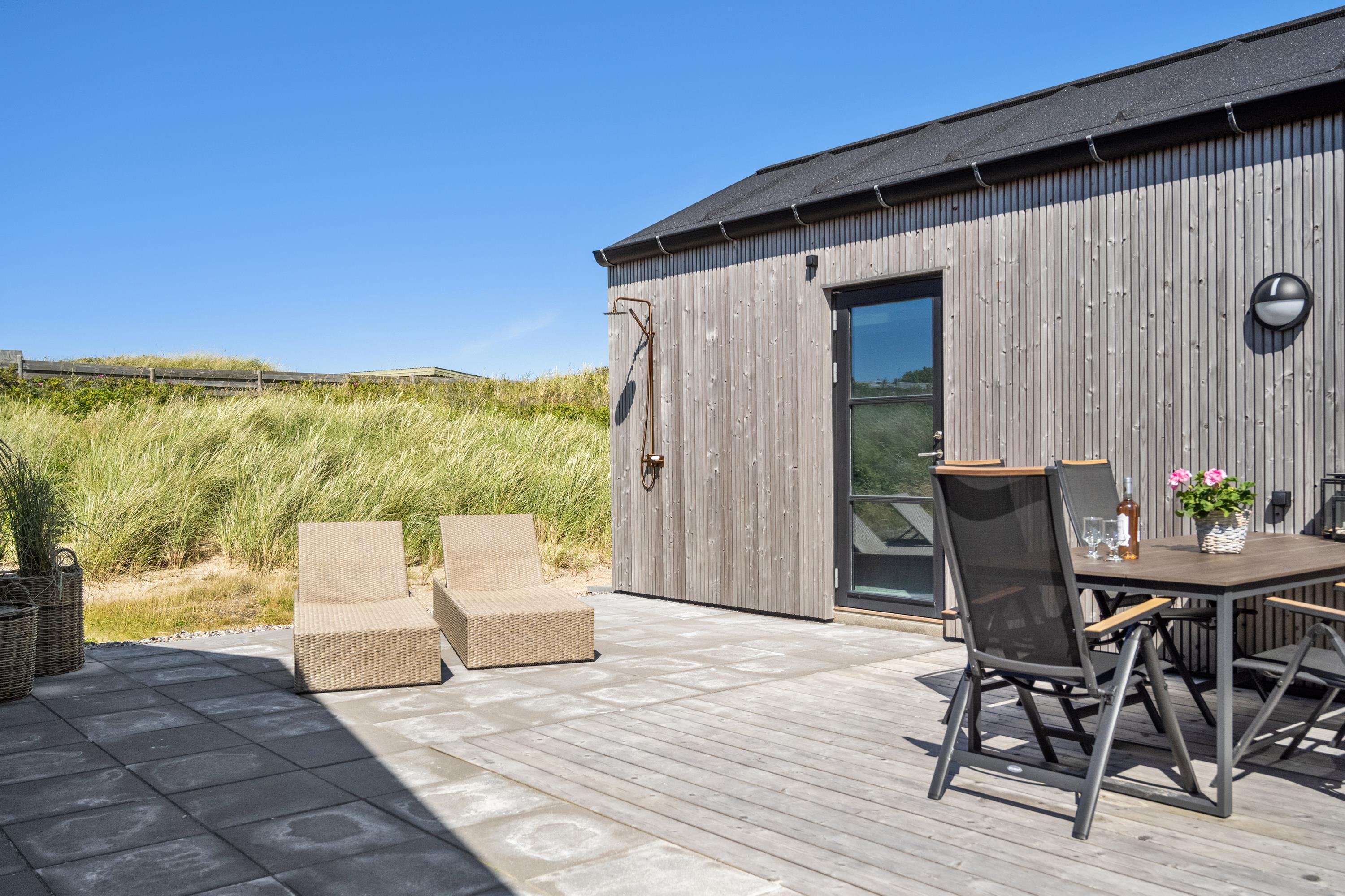 Draußen erwarten Sie mehrere fantastische Terrassen, auf denen Sie sowohl Sonne als auch Windschutz finden. Auf der Ostseite liegt ein geschlossener Innenhof mit Sonnenliegen – ideal für ruhige Vormittage und Entspannung im Windschatten. Auf der Westseite befindet sich eine überdachte Terrasse mit Blick auf die Dünen und die unvergesslichen Sonnenuntergänge über der Nordsee.