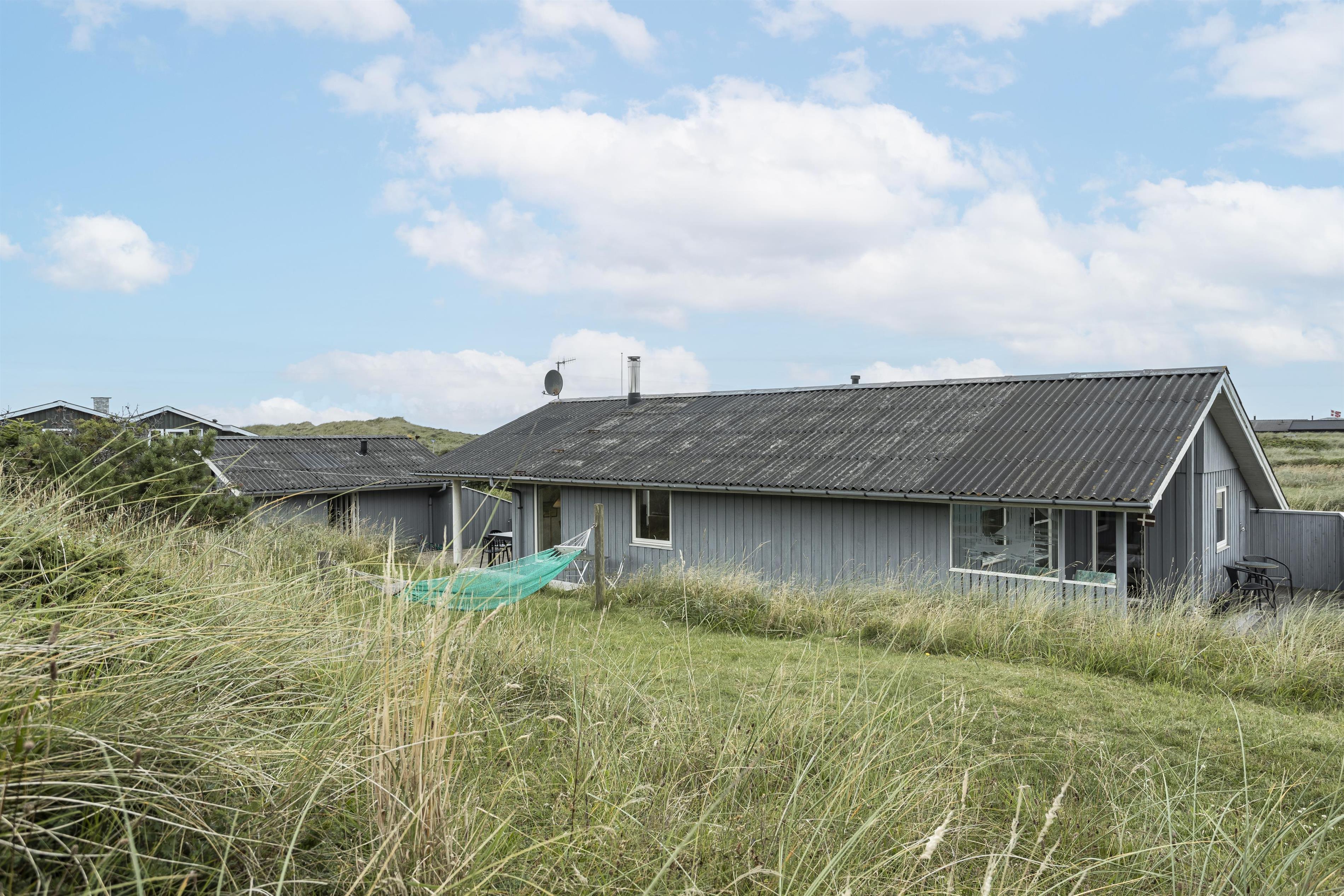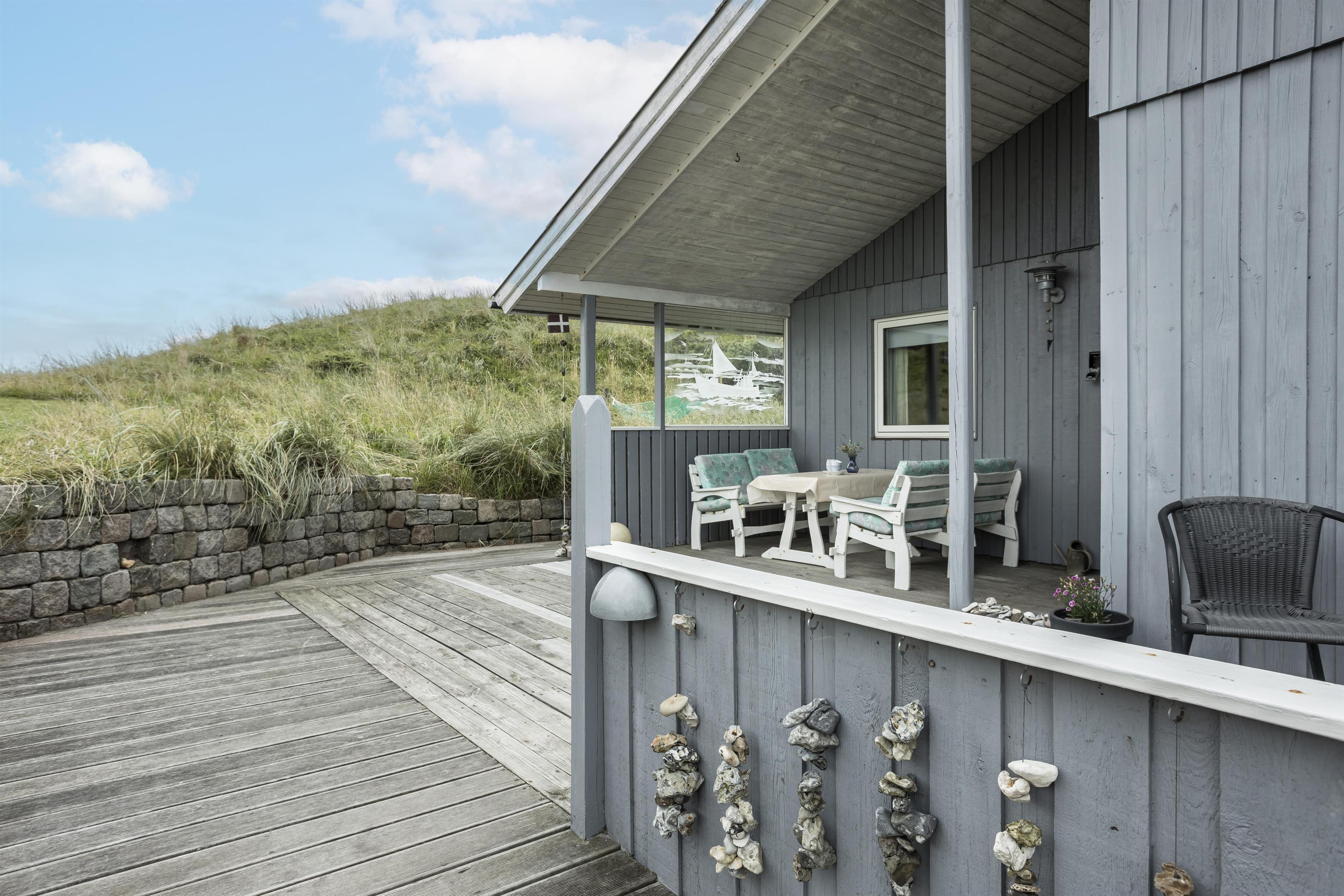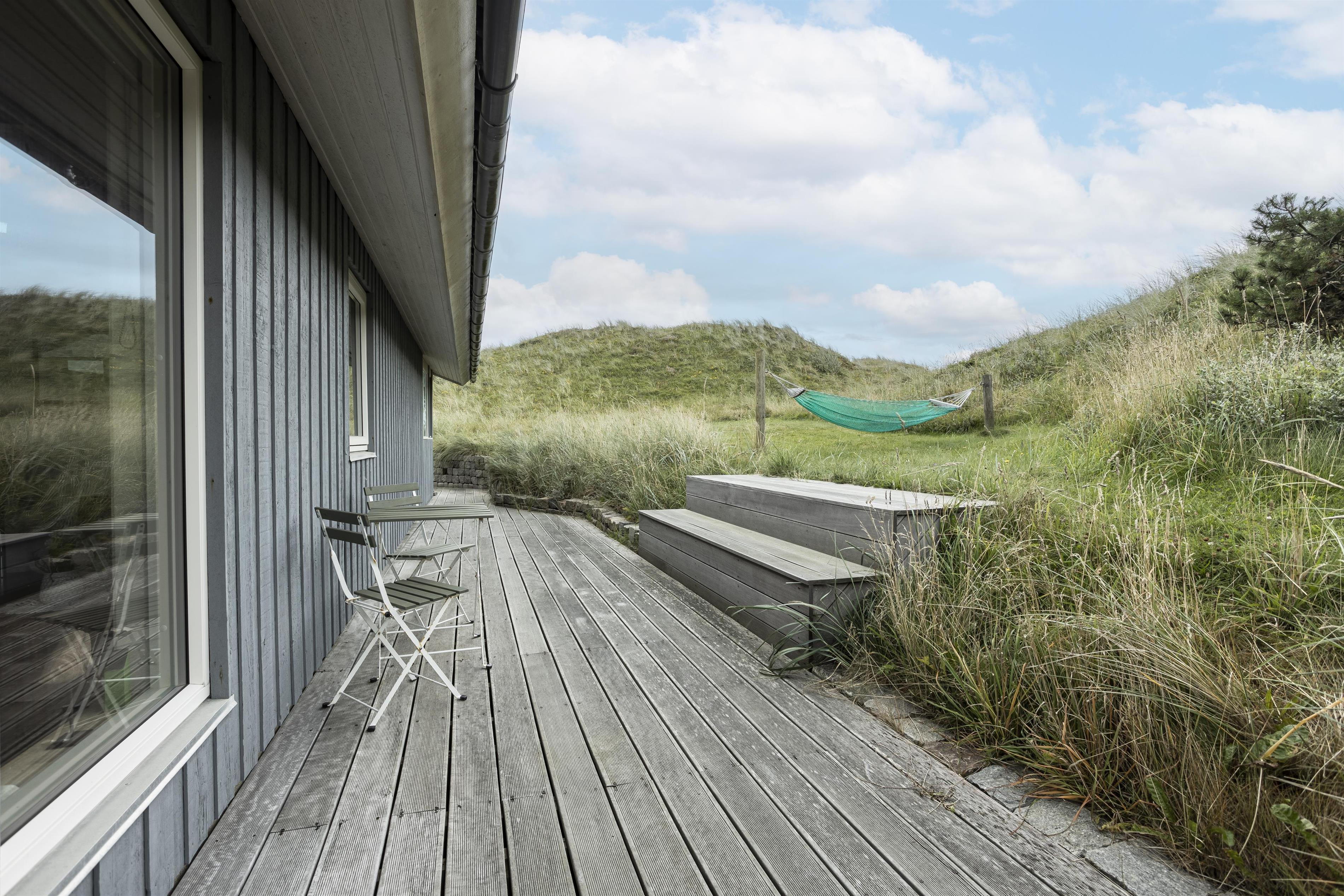 Das Ferienhaus liegt auf einem großen Naturgrundstück mitten in der welligen Dünenlandschaft von Tornby, nur 300 Meter vom Strand entfernt. Mehrere Terrassen und geschützte Ecken bieten die Möglichkeit, die Sonne von morgens bis abends zu genießen. An heißen Sommertagen können Sie sich auf die überdachten Terrassen zurückziehen.