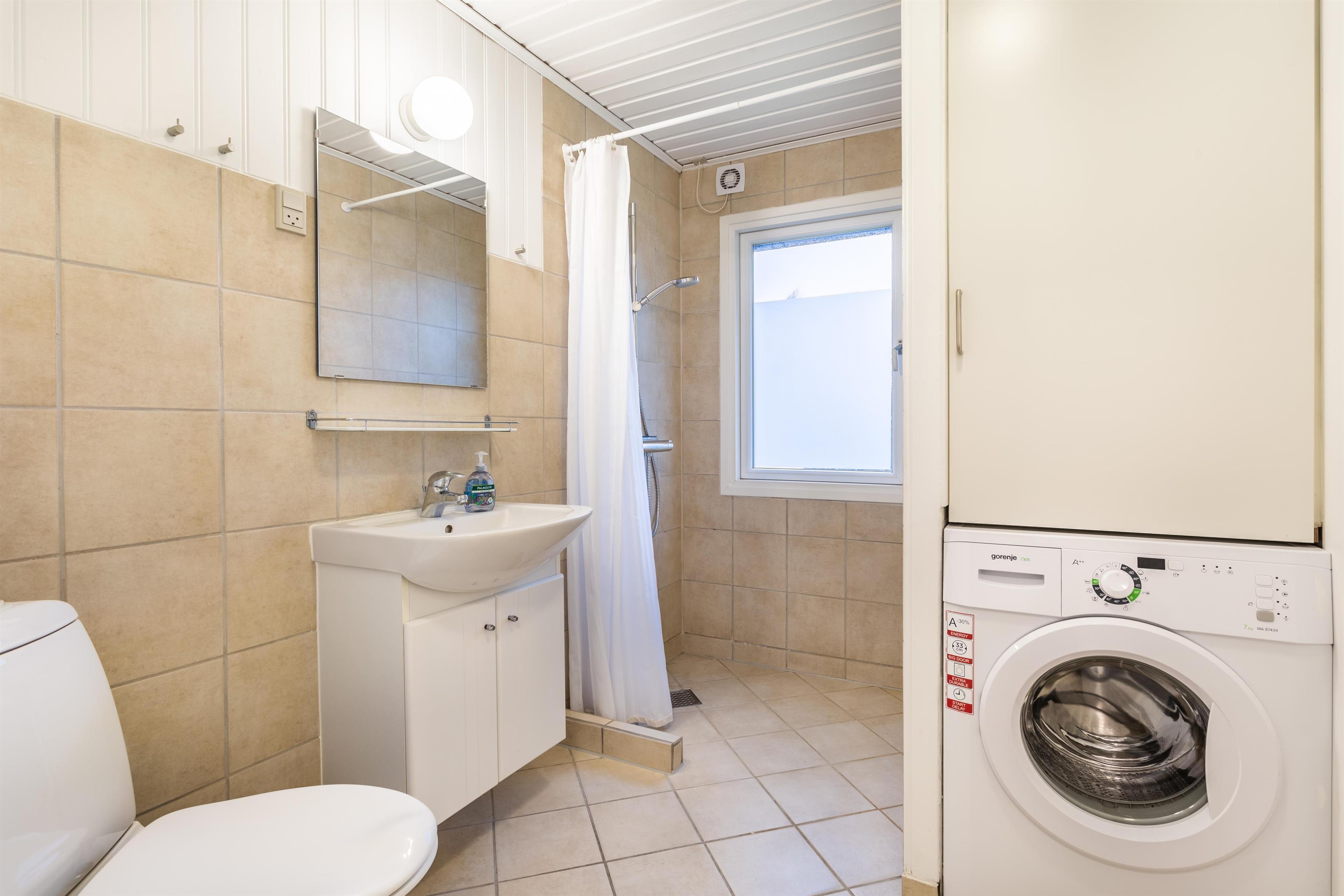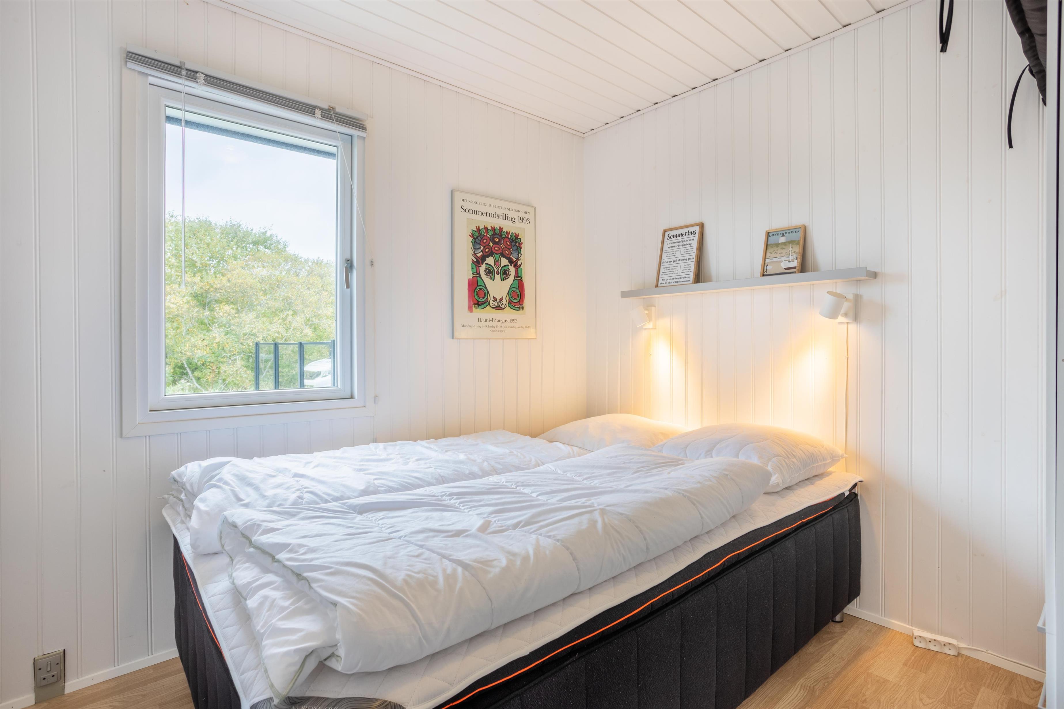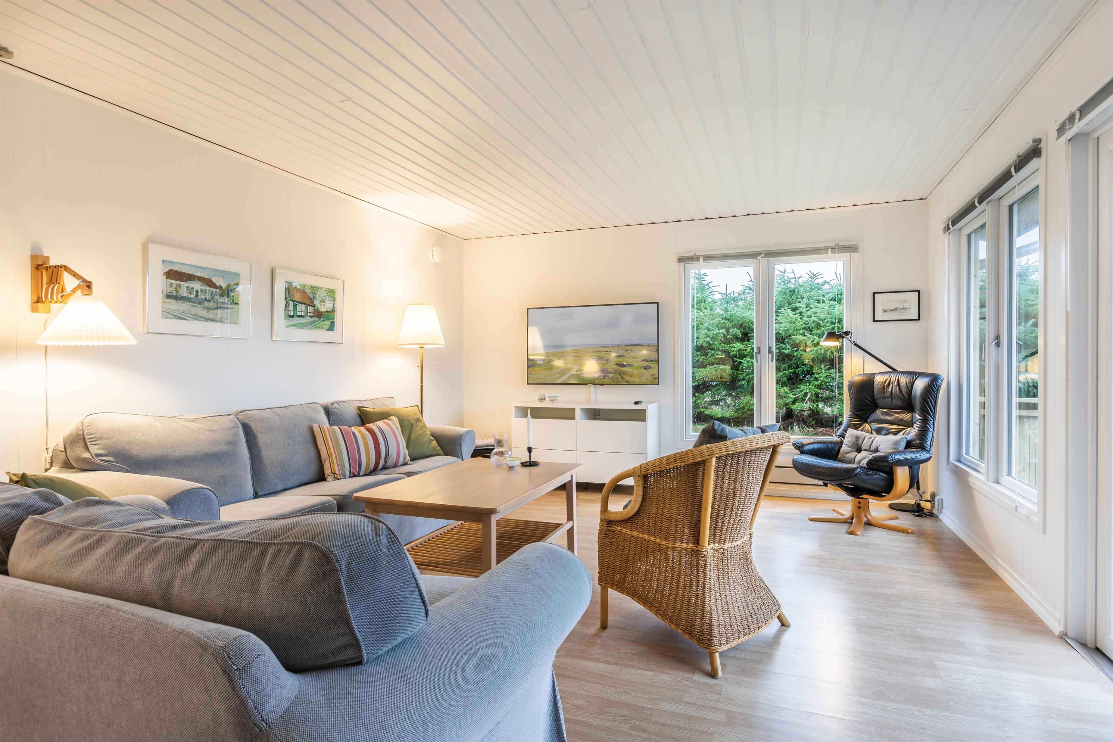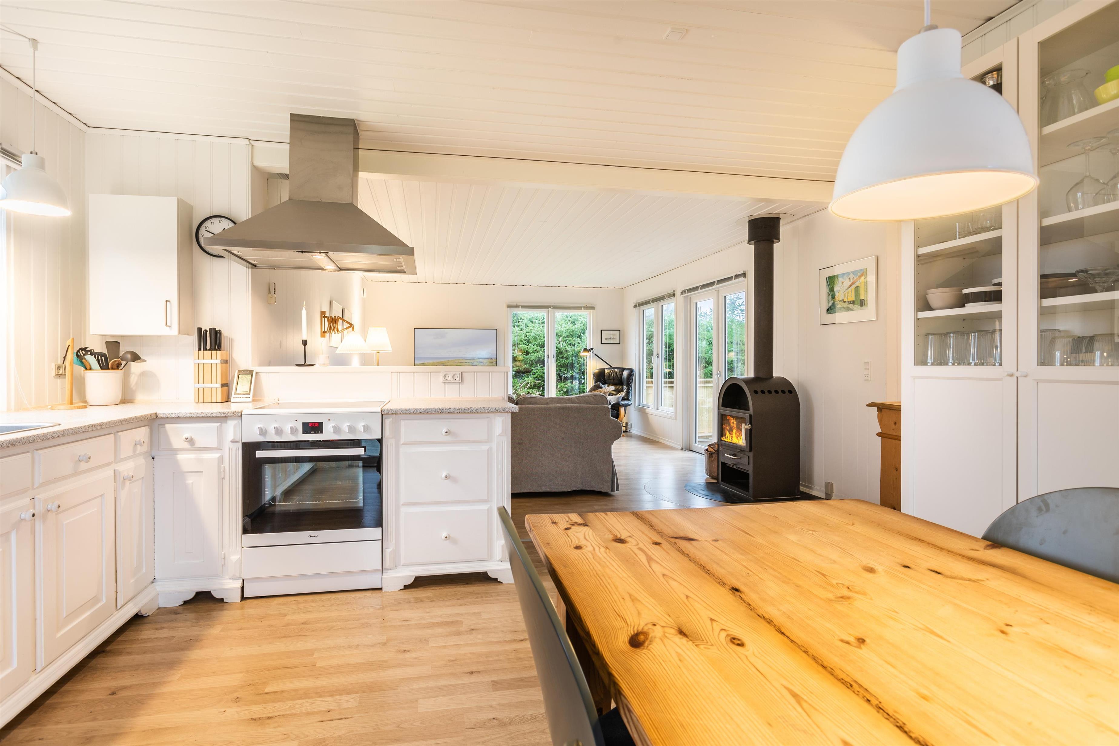 Das Ferienhaus ist sowohl außen als auch innen hell und gut gepflegt. Das Haus ist mit zwei schönen Schlafzimmern, einem schönen Badezimmer und einer großen, hellen Küche in offener Verbindung mit dem Wohnzimmer ausgestattet. Im offenen Wohnbereich finden Sie sowohl einen Essbereich als auch eine gemütliche TV-Ecke mit Sofa. An kühlen Abenden können Sie den Kamin im Haus anzünden und die Wärme genießen, während Sie zusammen entspannen. Das Sommerhaus ist mit guten Möbeln und einer gut ausgestatteten Küche mit allen notwendigen Geräten eingerichtet.
