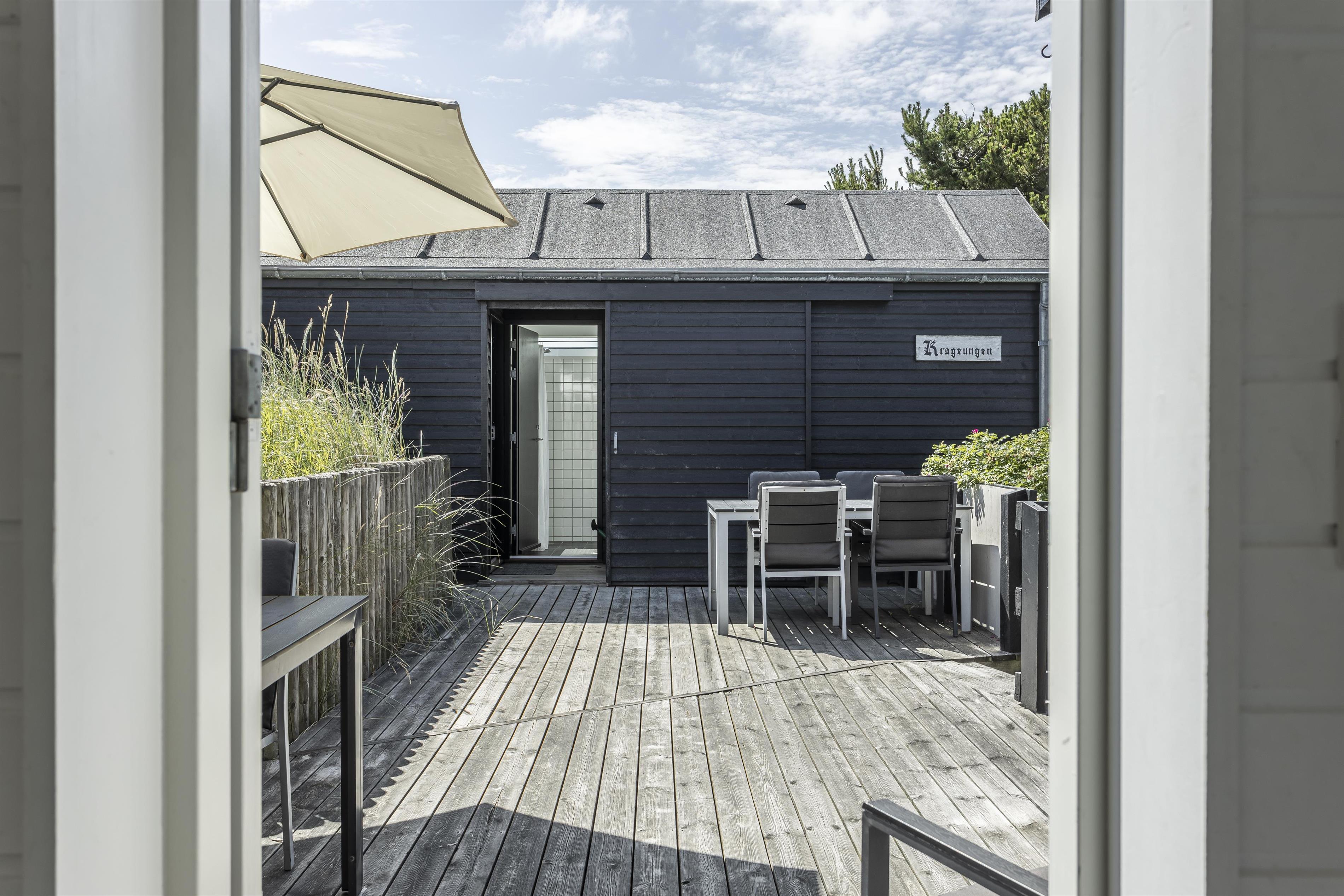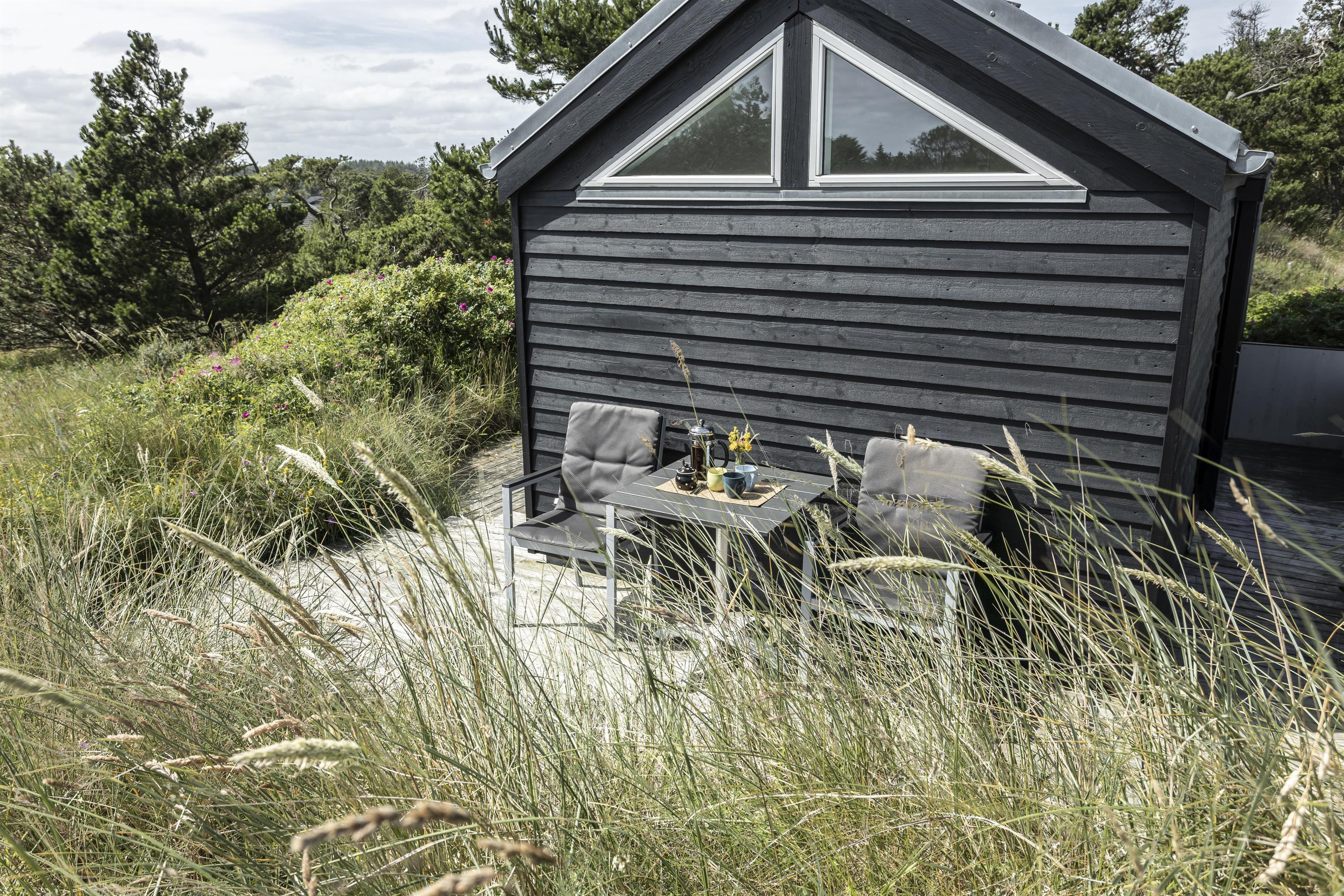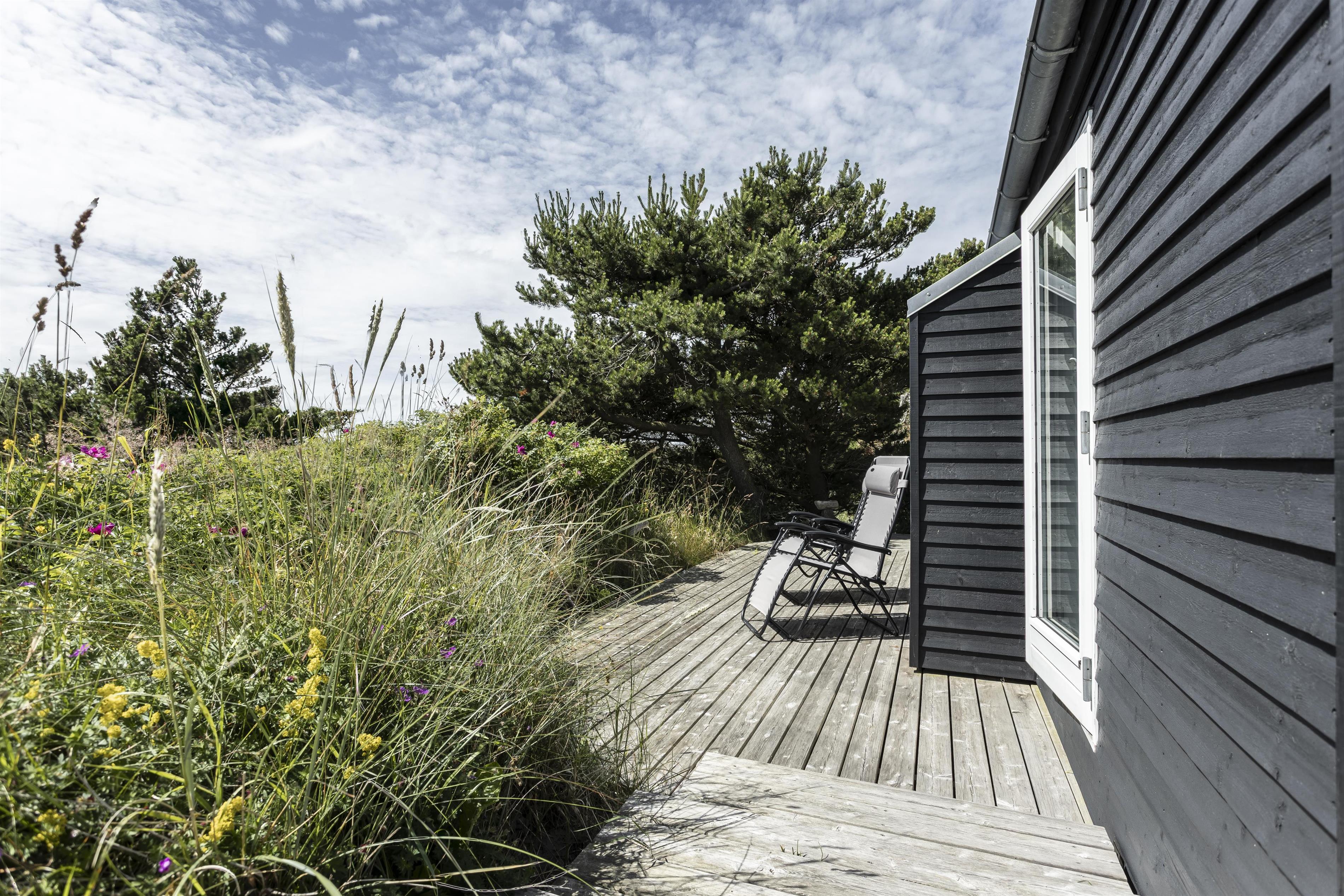 Das Ferienhaus liegt auf einem spannenden Naturgrundstück, auf dem das hügelige Gelände genutzt und mehrere gemütliche Außenbereiche eingerichtet wurden. Genießen Sie die große Holzterrasse, die das Ferienhaus und das Nebengebäude verbindet. Hier gibt es reichlich Gelegenheit, einen sonnigen Platz im Windschatten zu finden, während Sie die Ruhe und die frische Meeresluft genießen.