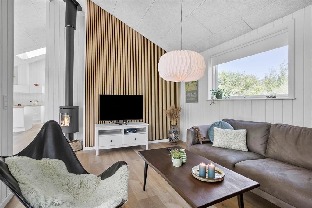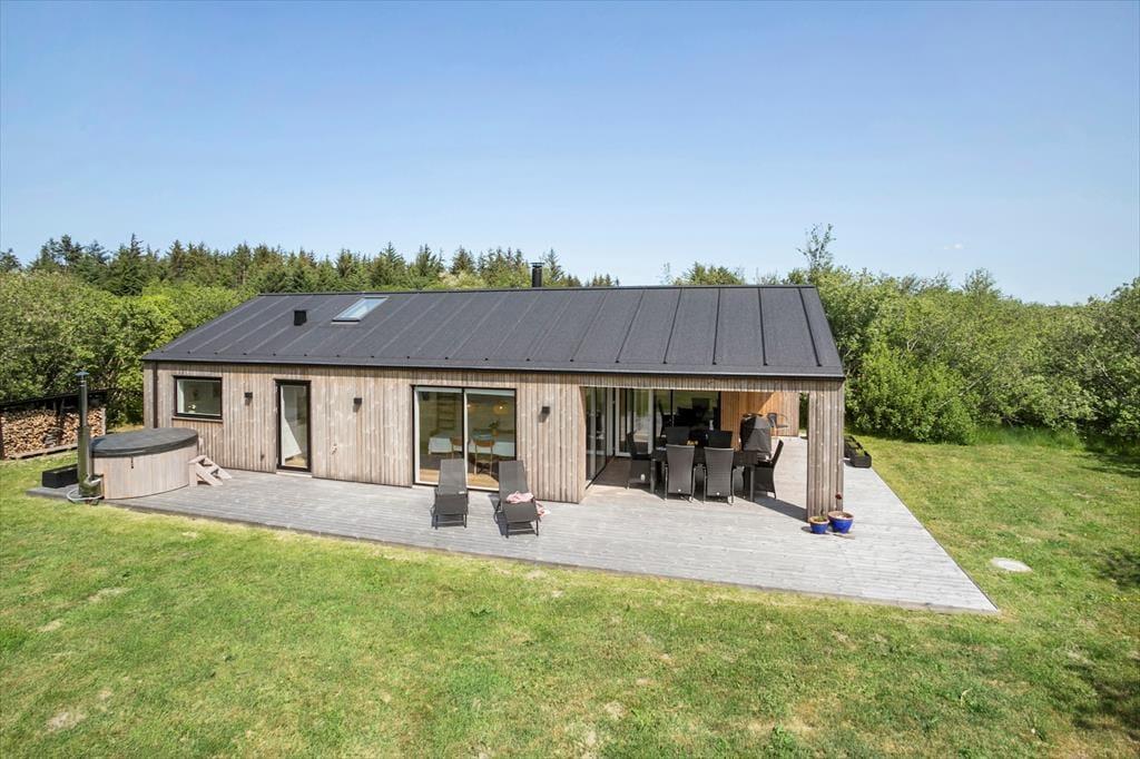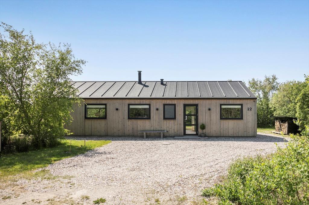Das 87 m² große Ferienhaus empfängt Sie mit einem stilreinen Äußeren, das durch die ungestrichene Holzverkleidung, das schwarze Satteldach und die großen Fensterpartien, die im Hausinneren für einen guten Tageslichteinfall sorgen, geprägt wird. Das Hausinnere präsentiert sich hell und freundlich. Eine schöne Wohnatmosphäre erwartet Sie im Wohnraum mit hohen Decken, einem Kaminofen, einer integrierten Küche und einem Schlafboden. Zwei der Schlafzimmer beinhalten ein Doppelbett. Im dritten Schlafzimmer steht ein doppeltes Schlafsofa bereit. Die hohe Qualität des Hauses wird auch im geräumigen Duschbadezimmer ersichtlich und selbst im Eingangsbereich, bei dem es sich um einen schönen und gut eingerichteten Raum mit einer Waschmaschine und einem Wäschetrockner handelt.