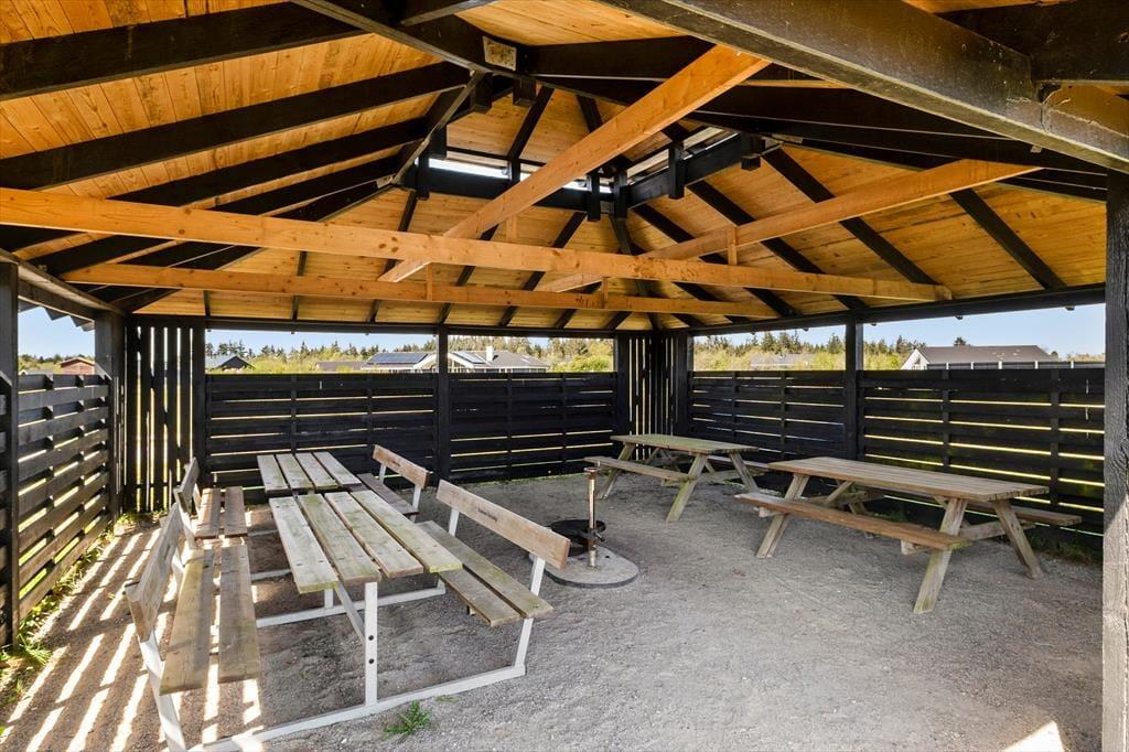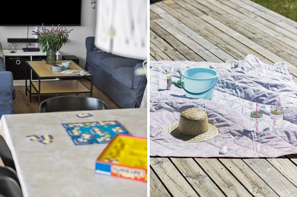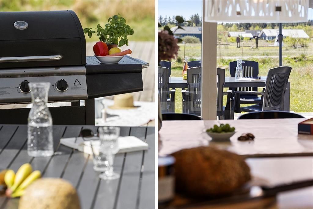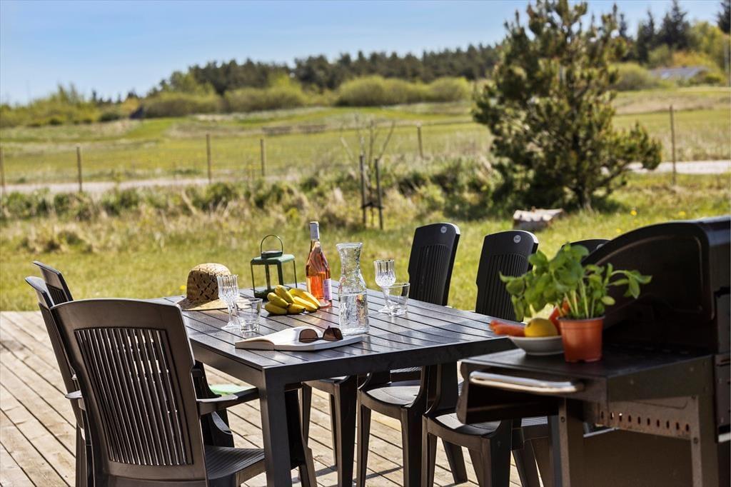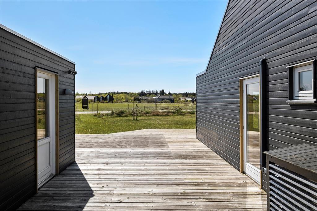 Vom Wohnzimmer und allen Schlafzimmern haben Sie direkten Ausgang zu der grossen Holzterrasse, welche sich um das ganze Ferienhaus und den Anbau herumzieht. Dieses macht es einfach die Außen Areale zu benutzen, ungeachtet, ob Sie das Frühstück in der Sonne genießen wollen, sich ein Mittagsschläfchen im Schatten gönnen möchten, oder sich es beim Grillen und Gartenspielen am Abend gemütlich machen möchten. Die Kinder können auf dem 1998 m2 grossen Grundstück spielen, aber es gibt noch mehr Platz für Entfaltungsmöglichkeiten auf dem riesigen Gemeinschaftsareal, welches sich auf der anderen Seite des Weges ausbreitet.