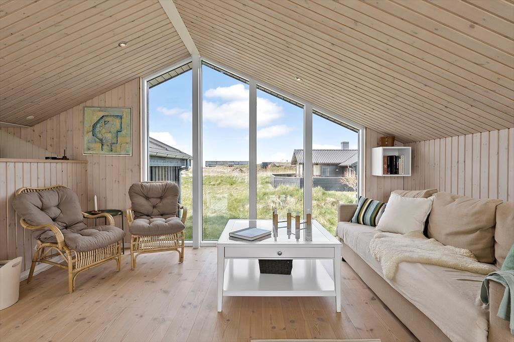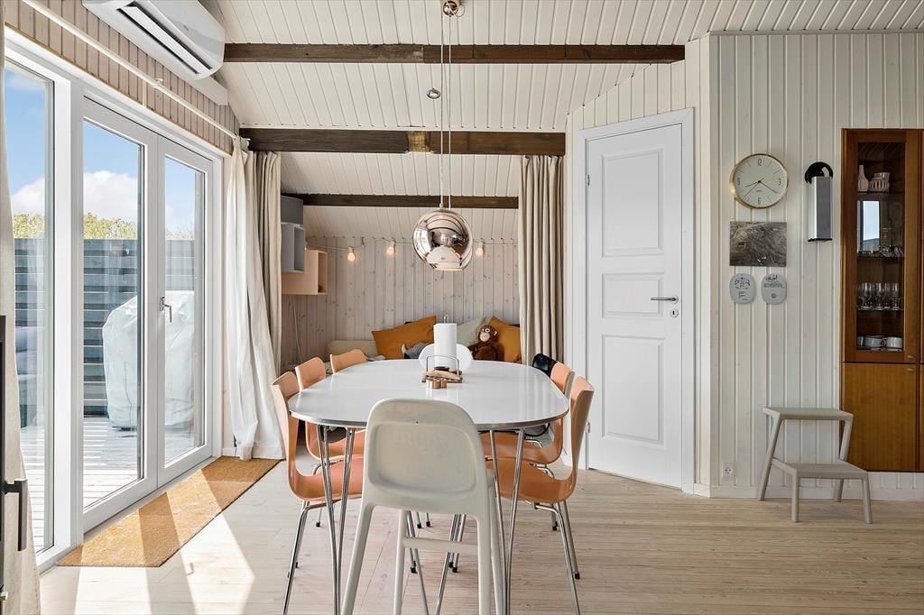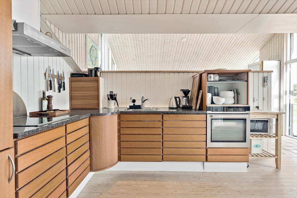Nach einer umfassenden Renovierung im Jahr 2022 präsentiert sich dieses Ferienhaus hell, einladend und äußerst gut durchdacht. Hier wurde auf jedes Detail geachtet, und der ideale Grundriss schafft einen angenehmen Rahmen für das Ferienleben. Der Wohnbereich des Hauses ist auf verschiedenen Ebenen gestaltet, was nicht nur einen charmanten architektonischen Ausdruck verleiht, sondern auch verschiedene Zonen für Entspannung und geselliges Beisammensein schafft. Im geräumigen Wohnzimmer strömt das Licht durch große Fensterfronten, und vom Sofa aus kannst du den Blick auf die wunderschöne Natur genießen, die das Haus umgibt. Die offene Küche ist mit dem Wohnzimmer verbunden, sodass ihr gemeinsam kochen und Zeit miteinander verbringen könnt. An warmen Sommerabenden lädt der Essbereich zu langen, gemütlichen Mahlzeiten mit anregenden Gesprächen ein.