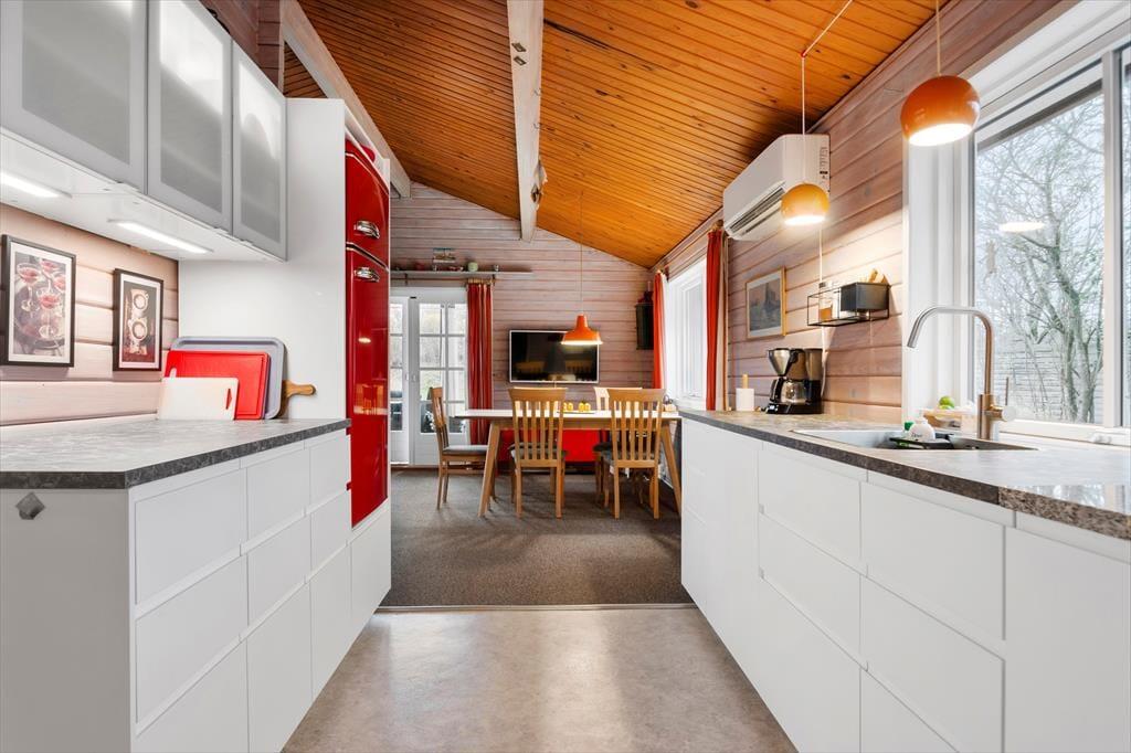 Im Inneren des Ferienhauses empfängt dich eine einladende und wohnliche Atmosphäre, bei der jedes Detail mit Herz gestaltet wurde. Der helle Wohnbereich bildet den Rahmen für gemütliche Urlaubstage und -abende, und der Holzofen sorgt für wohlige Wärme und knisternde Stimmung, wenn die Tage kühler werden. Hier spürst du die besondere Ruhe, die nur ein gut eingerichtetes Ferienhaus inmitten schöner Natur bieten kann. Die offene Küche, die 2021 modernisiert wurde, lädt zu gemeinsamen Kochmomenten ein – ganz gleich, ob du ein selbstgemachtes Frühstück zubereiten oder die Familie mit einem einfachen, aber schmackhaften Abendessen verwöhnen möchtest. Die Küche ist offen in das Wohnzimmer integriert, sodass ihr euch weiterhin unterhalten könnt, während das Essen köchelt und sich die gute Stimmung im ganzen Haus verbreitet. Hier fühlst du dich vom ersten Tag an wie zuhause.