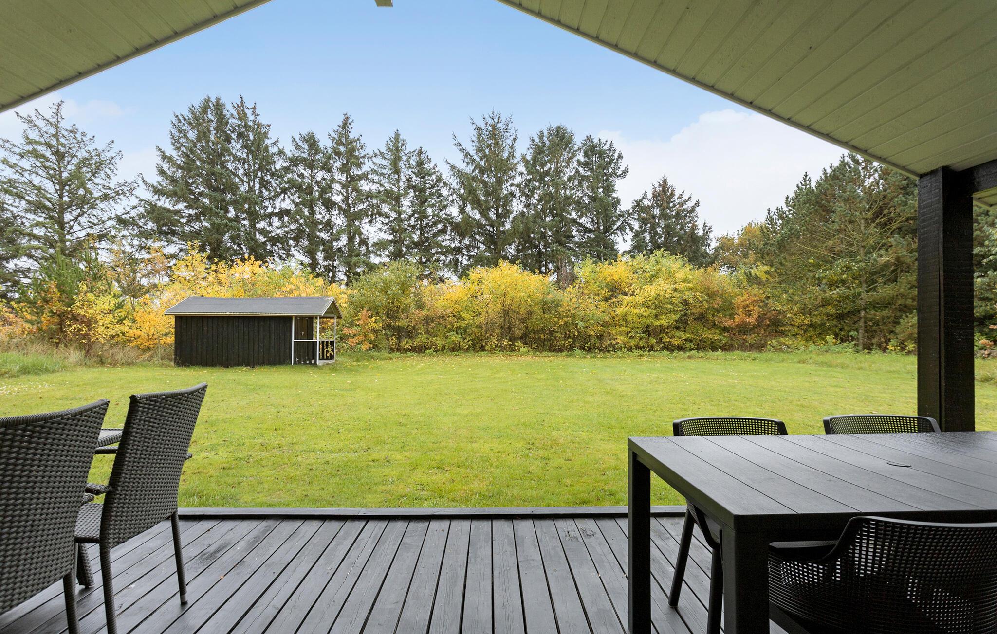 Auf der geräumigen, überdachten Holzterrasse können Sie gemütlich grillen, während Ihre Kinder auf dem Rasen toben. Probieren Sie auch das beliebte Wikingerspiel aus oder spielen Sie Federball und erleben Sie gemeinsamen Spaß unter freiem Himmel.