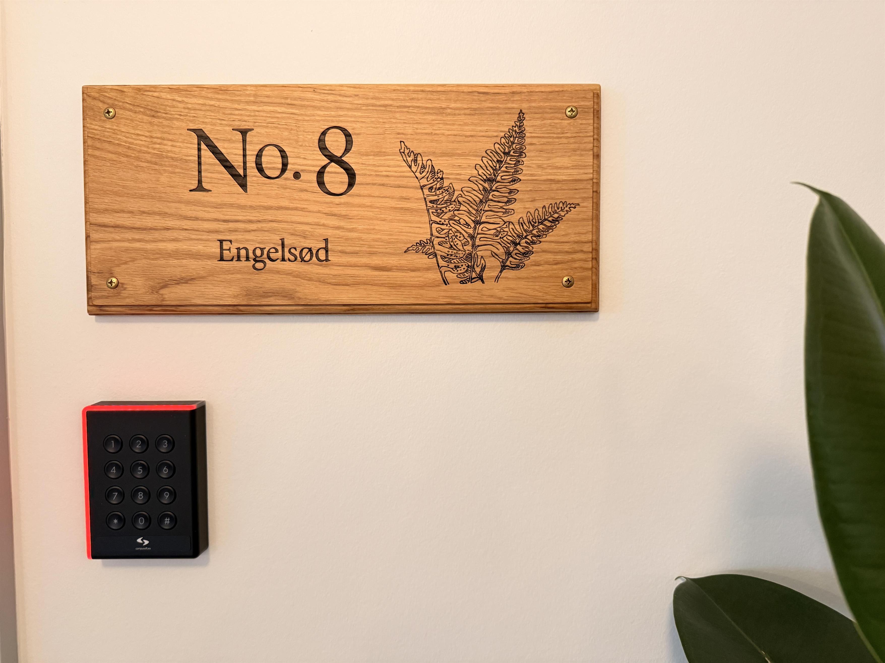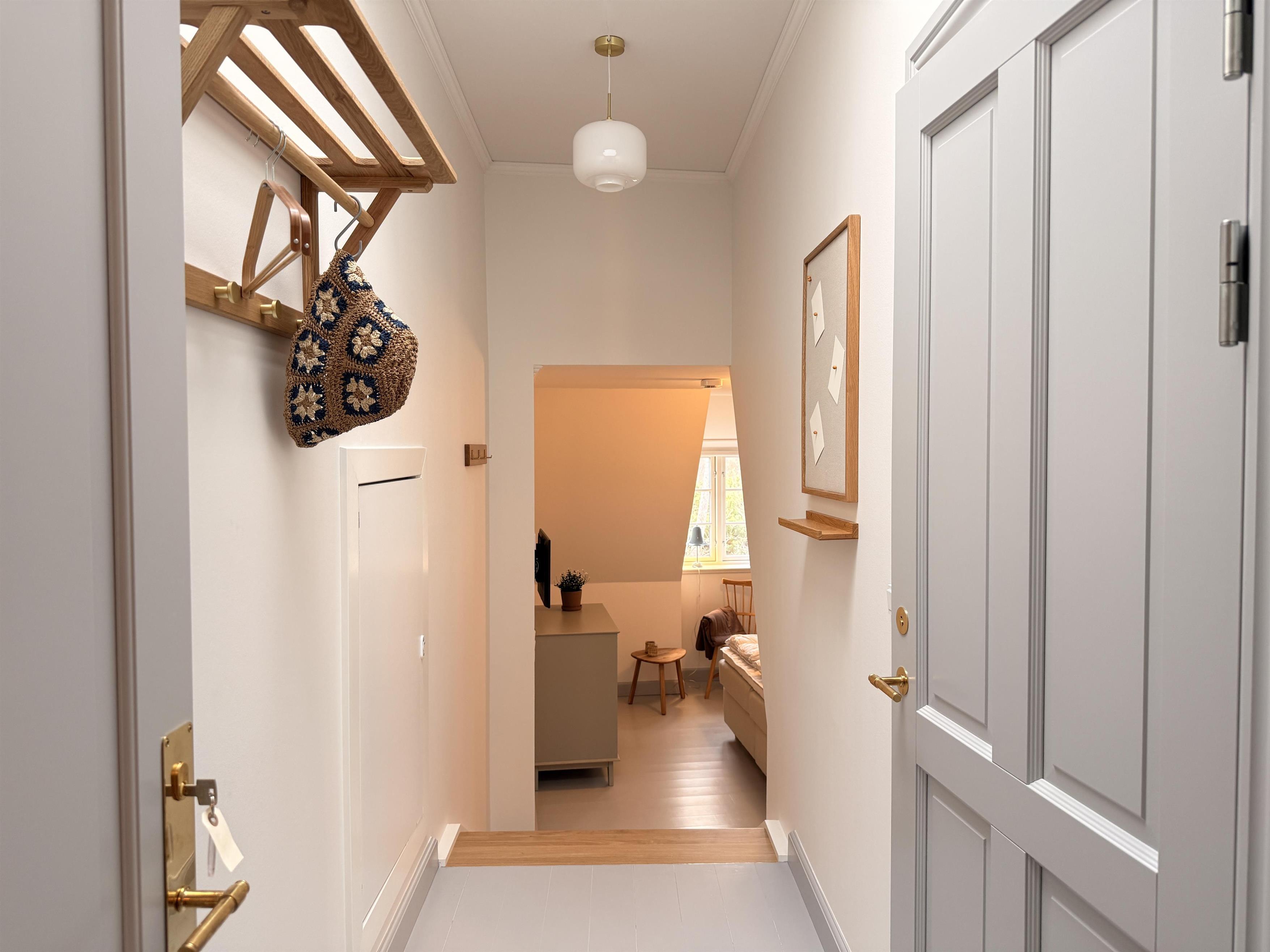 Das Zimmer trägt die Nummer 8 und den Namen „Englesød“. Teil des besonderen Konzepts der Badepension, bei dem alle Zimmer und Ferienwohnungen nach Kräutern und Pflanzen benannt sind. Der Speisesaal und die Aufenthaltsräume sind mit schönen Möbeln aus den ehemaligen Eisbrechern Danbjørn und Isbjørnen eingerichtet.