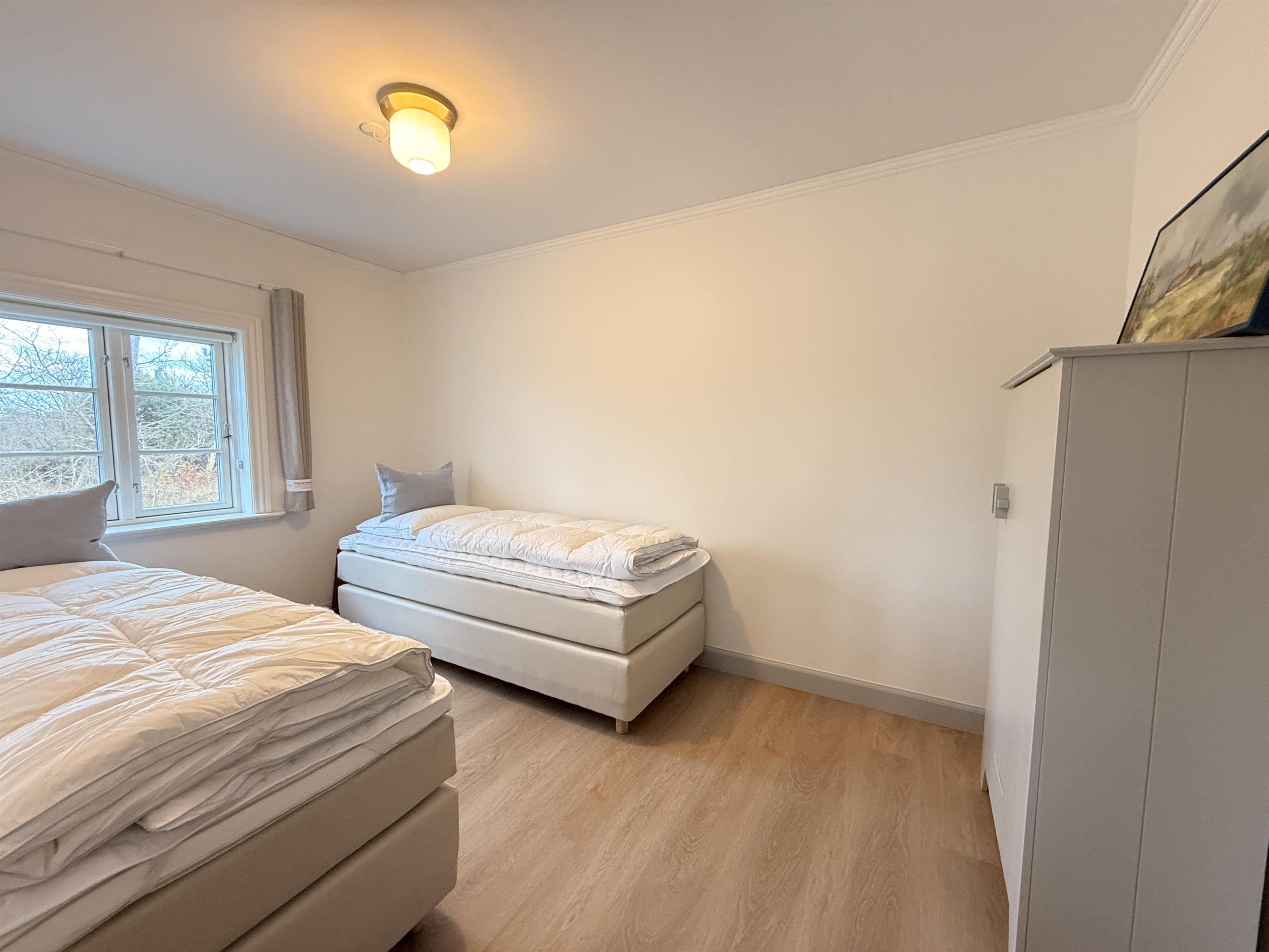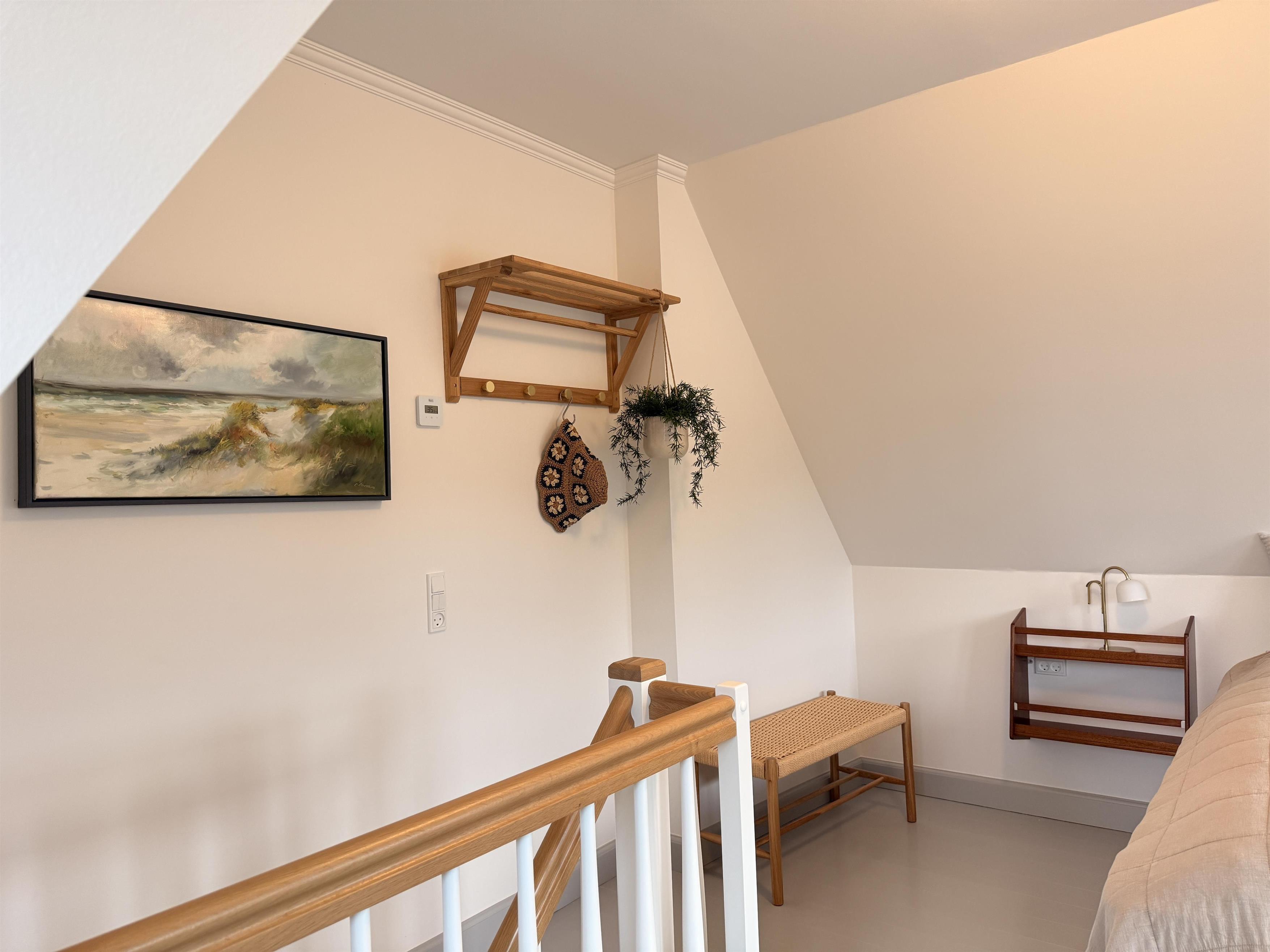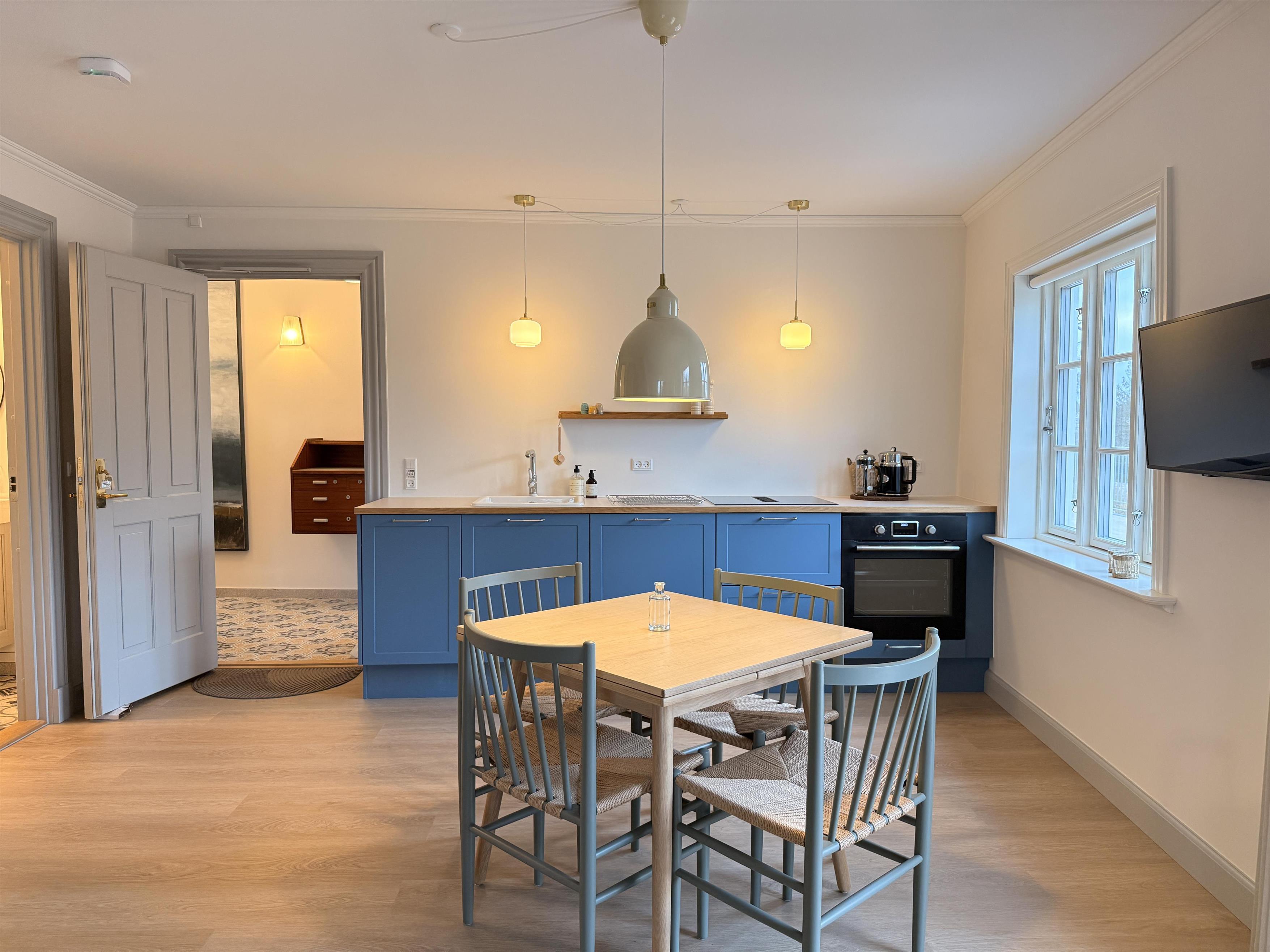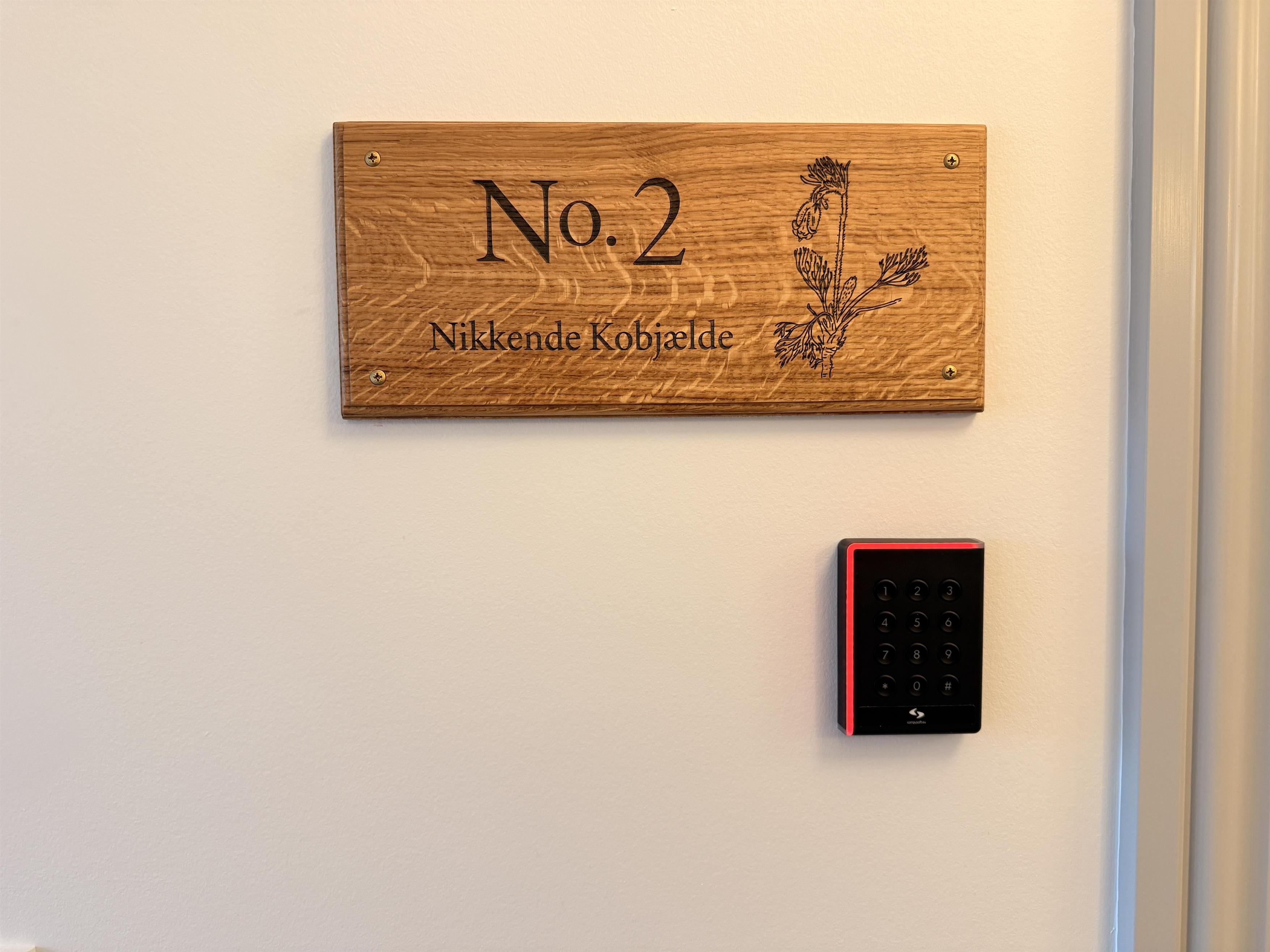 Die Wohnung trägt die Nummer 2, hat aber auch ihren ganz eigenen Namen: „Nikkende Kobjælde“. Alle Zimmer und Apartments der Badepension sind nach Kräutern und Pflanzen benannt – ein liebevolles Detail, das Naturverbundenheit, Ruhe und die persönliche Atmosphäre der klassischen Badepensionen unterstreicht.