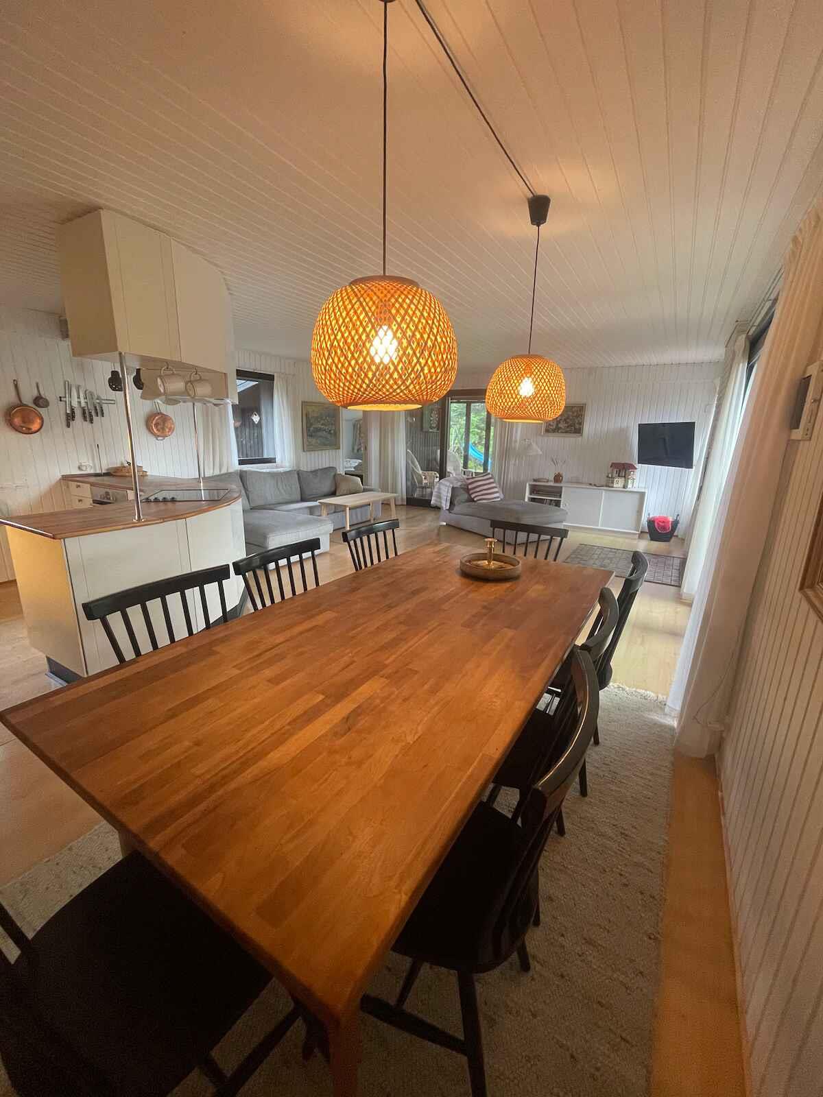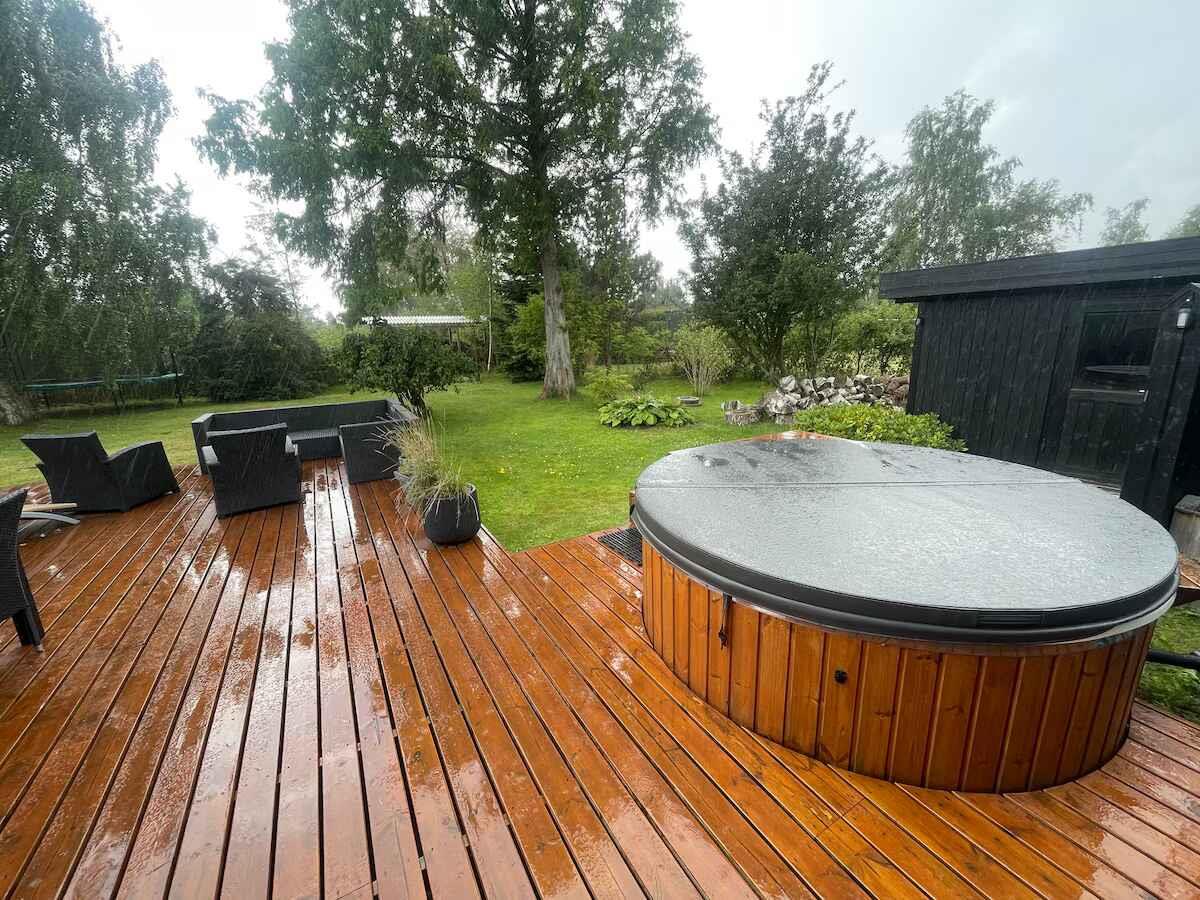 Ferienhaus im Lupinerkvarteret mit großem Kamin, geräumigem Wohnbereich und Ost- und Westterrassen sowie überdachter Terrasse. Outdoor-Whirlpool für 8 Personen. Nähe zu Wasser, Geschäft, Spiel- und Sportplätzen. Spiele und PS4.