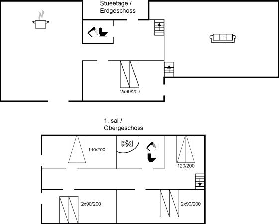 Die Schlafplätze verteilen sich auf 4 Schlafräume. 6 Schlafplätze in Doppelbetten. 4 Schlafplätze in Einzelbetten. 2 von diesen Schlafplätzen befinden sich in einem Vorraum.