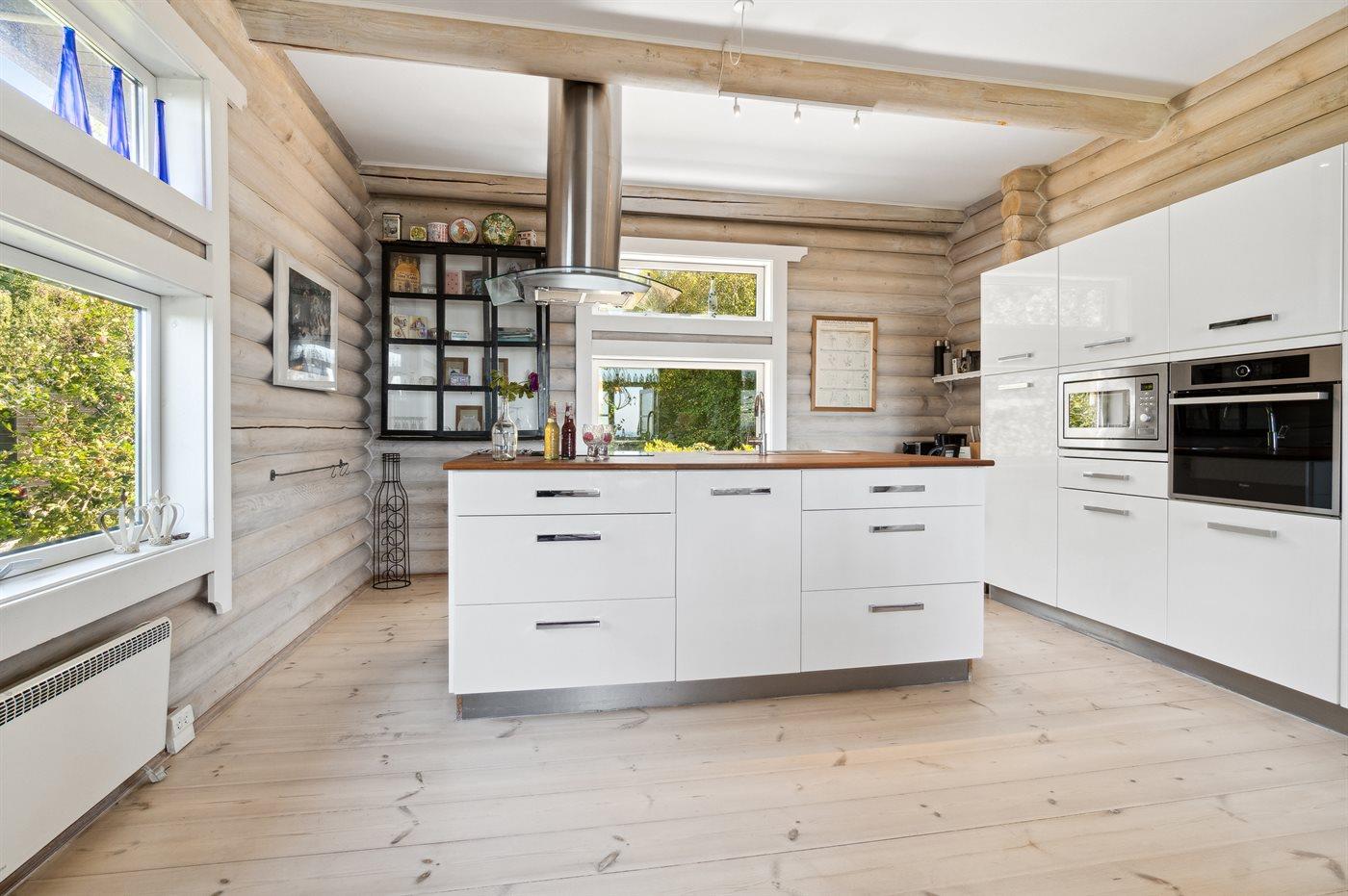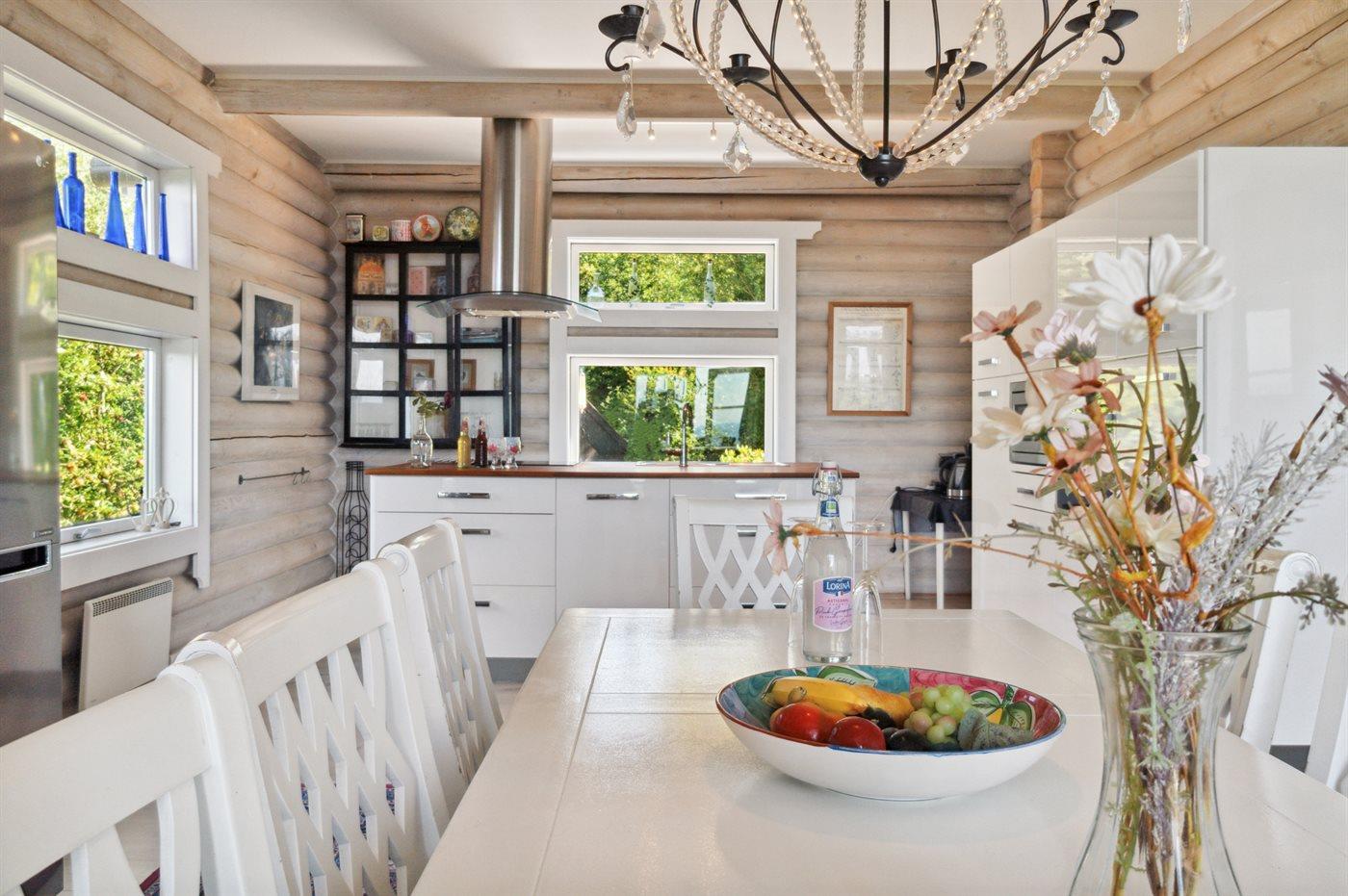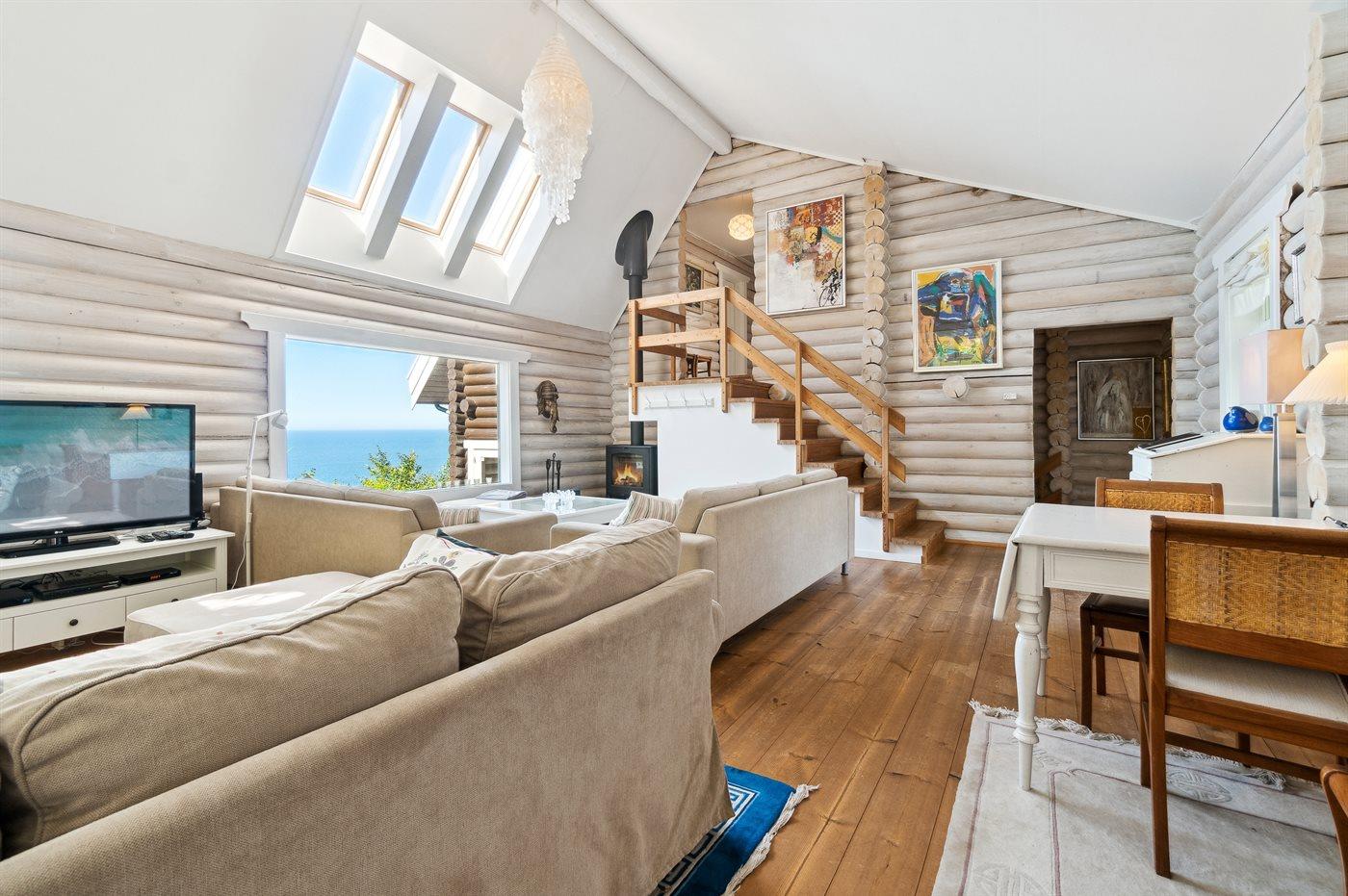 Hoch über dem alten Fischerdorf Vang liegt diese Perle von einem Ferienhaus auf einem Naturgrundstück, das einen besonders schönen und idyllischen Blick über die kleine Stadt, den Sonnenuntergang und natürlich einen fantastischen Meerblick bietet.
