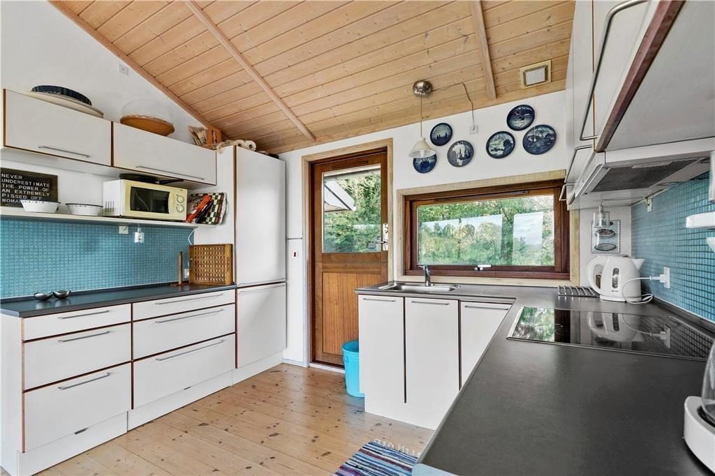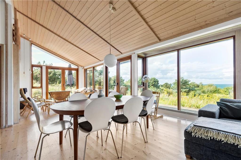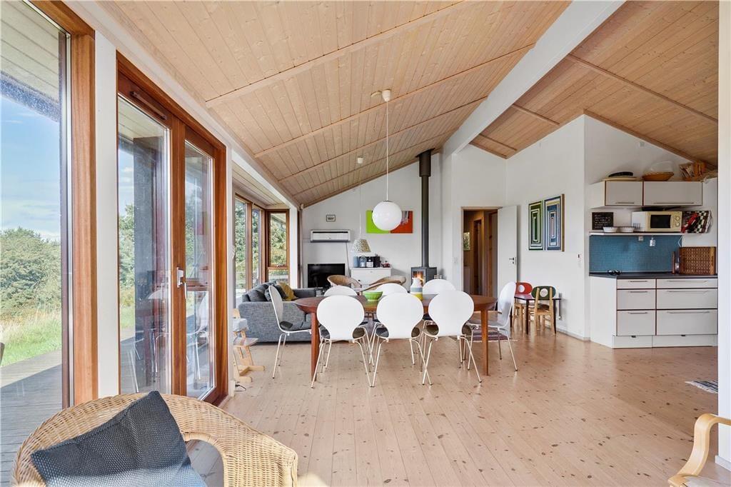 Das geräumige Wohnzimmer mit hohen Decken verfügt über Panoramafenster vom Boden bis zur Decke. Du wirst schwerlich die Augen von der Aussicht auf das Meer abwenden können - egal wo du dich gerade aufhältst; denn selbst wenn das Haus nicht in erster Reihe zum Meer liegt, so gibt es trotzdem eine berauschende Aussicht über die Landschaft. In der offenen Küche mitten im Wohnzimmer kannst du ein schönes Mittagessen zubereiten - vielleicht sogar mit selbst gefangenem Fisch. An einem Ende des Wohnzimmers könnt ihr es euch in der Sofaecke am Kamin mit einer Tasse Kaffee oder einem Spiel gemütlich machen.
