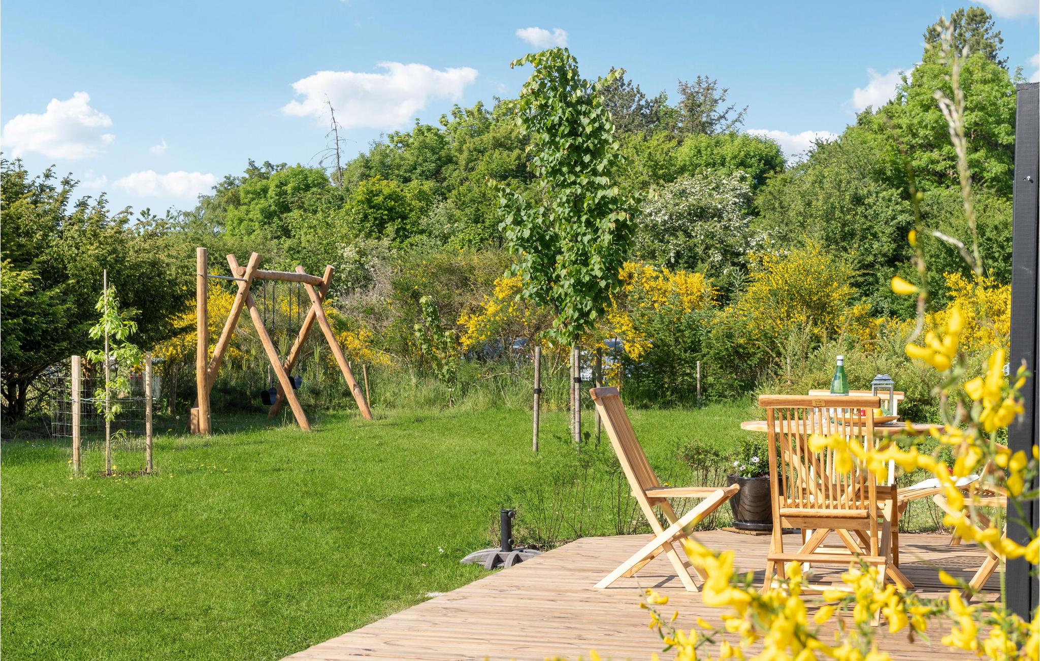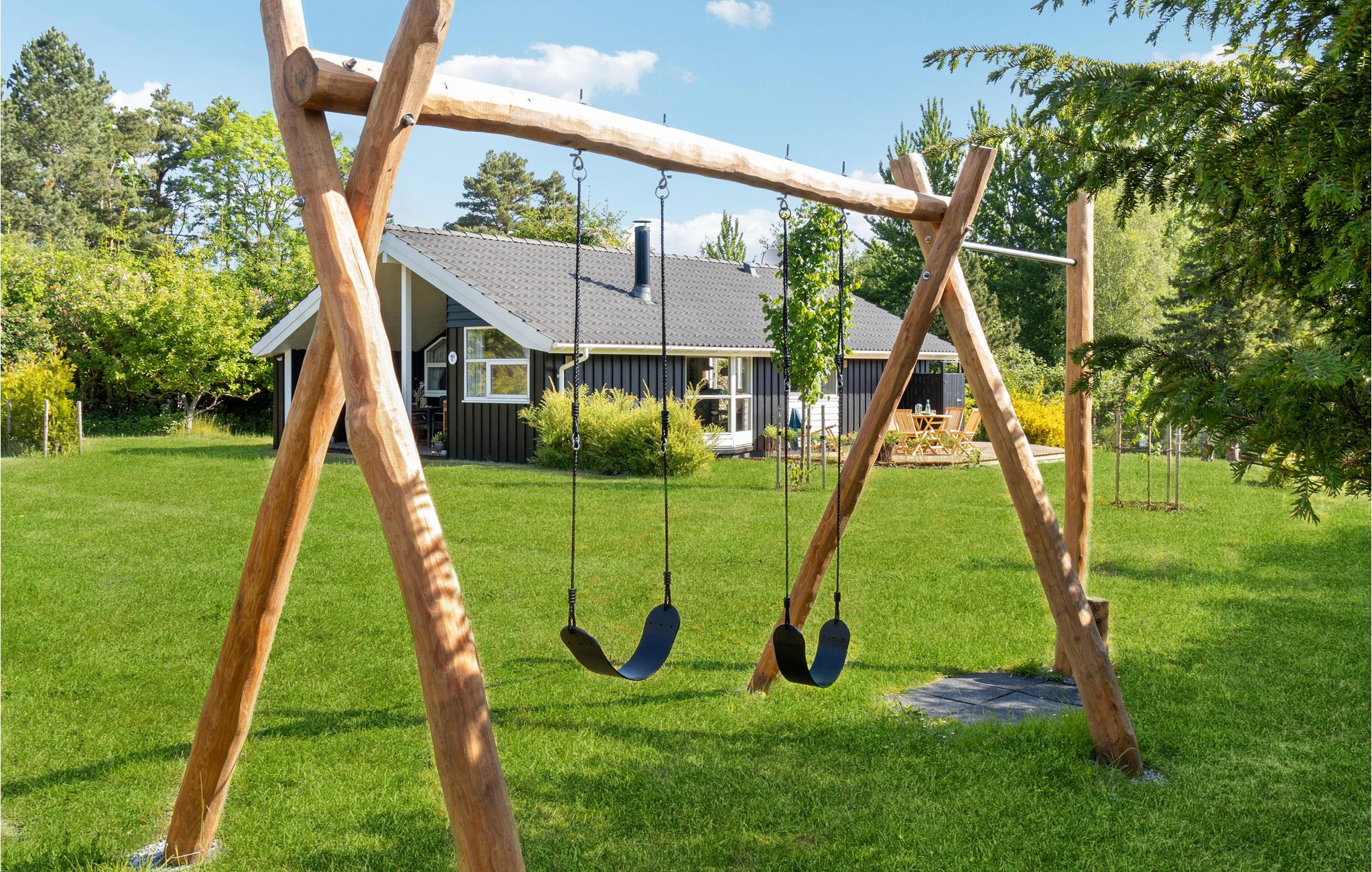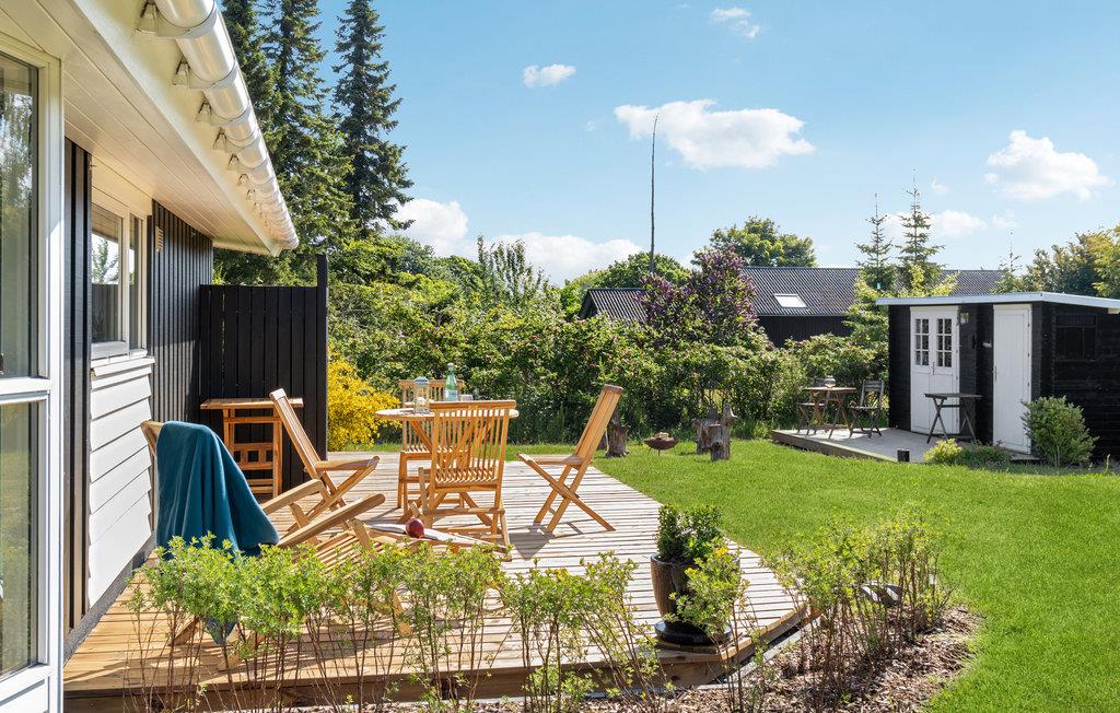 Das Haus liegt in der Nähe von Wald und Strand und das Grundstück ist groß und hält Platz für Ballspiele bereit.