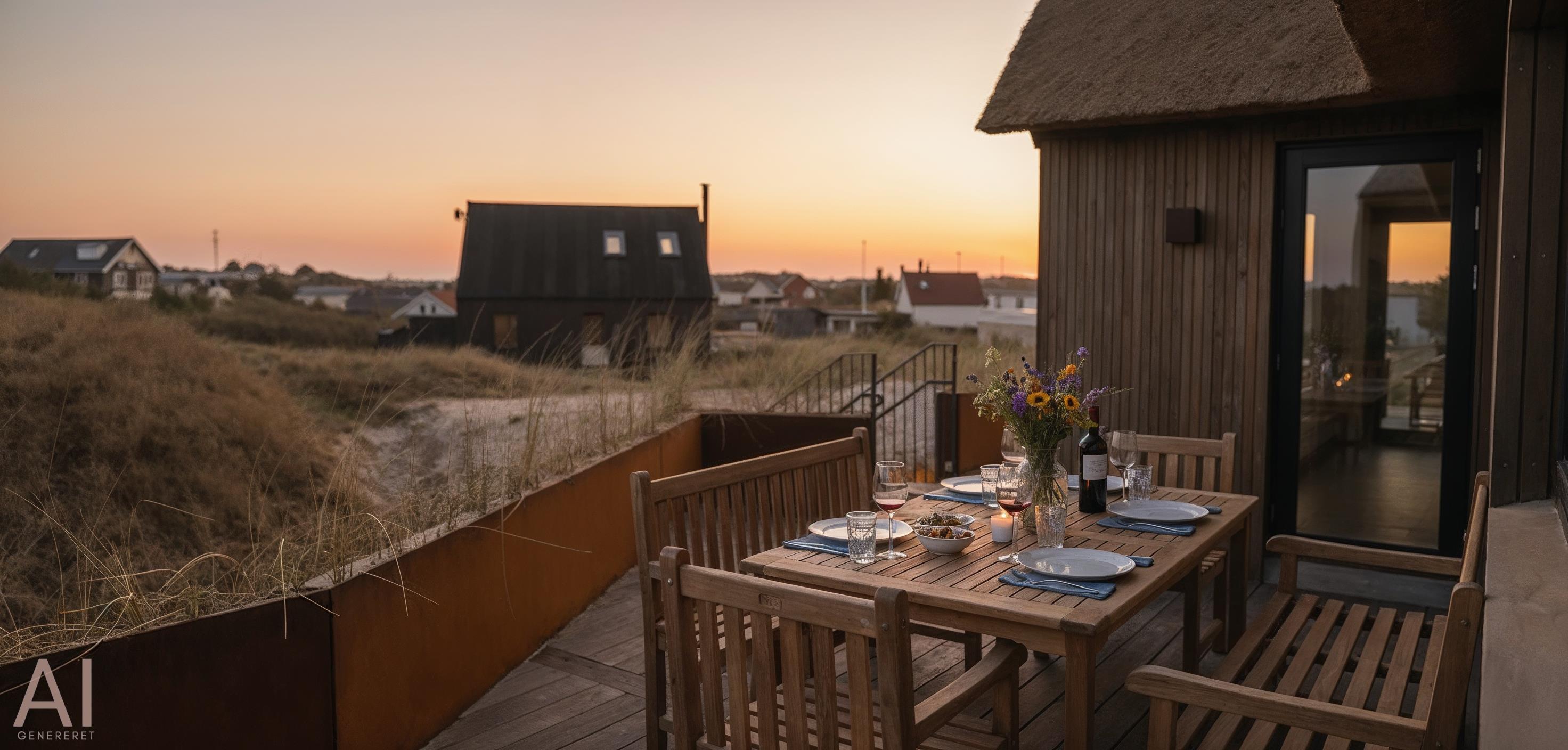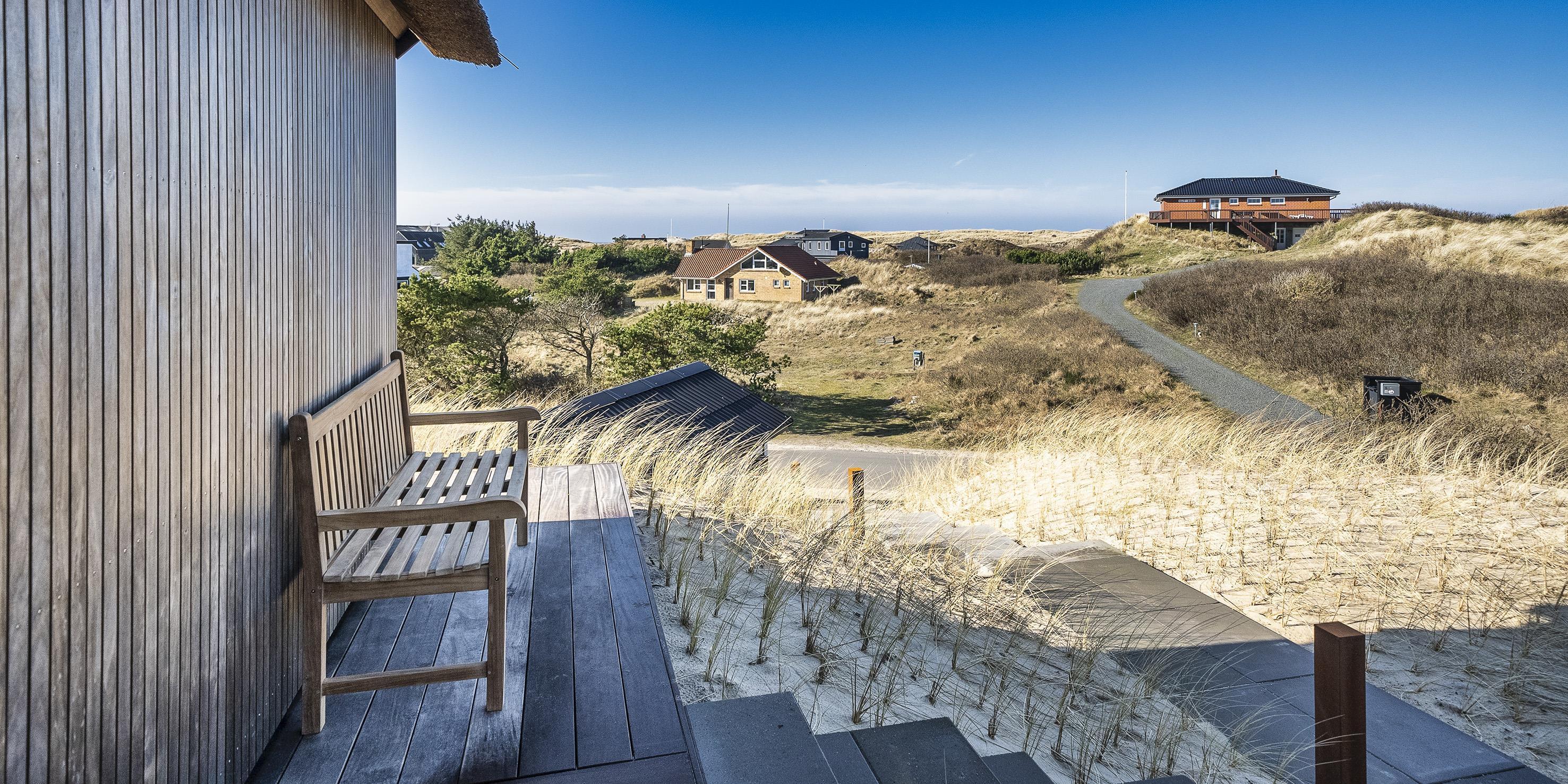 Die Außenanlagen bieten wunderschöne Sonnenuntergänge, die von der großen umlaufenden Holzterrasse aus genossen werden können. Das Ferienhaus liegt auf einem hohen Dünengrundstück, ca. 200 Meter vom Strand entfernt und in kurzer Entfernung zu Einkaufsmöglichkeiten und Restaurants.