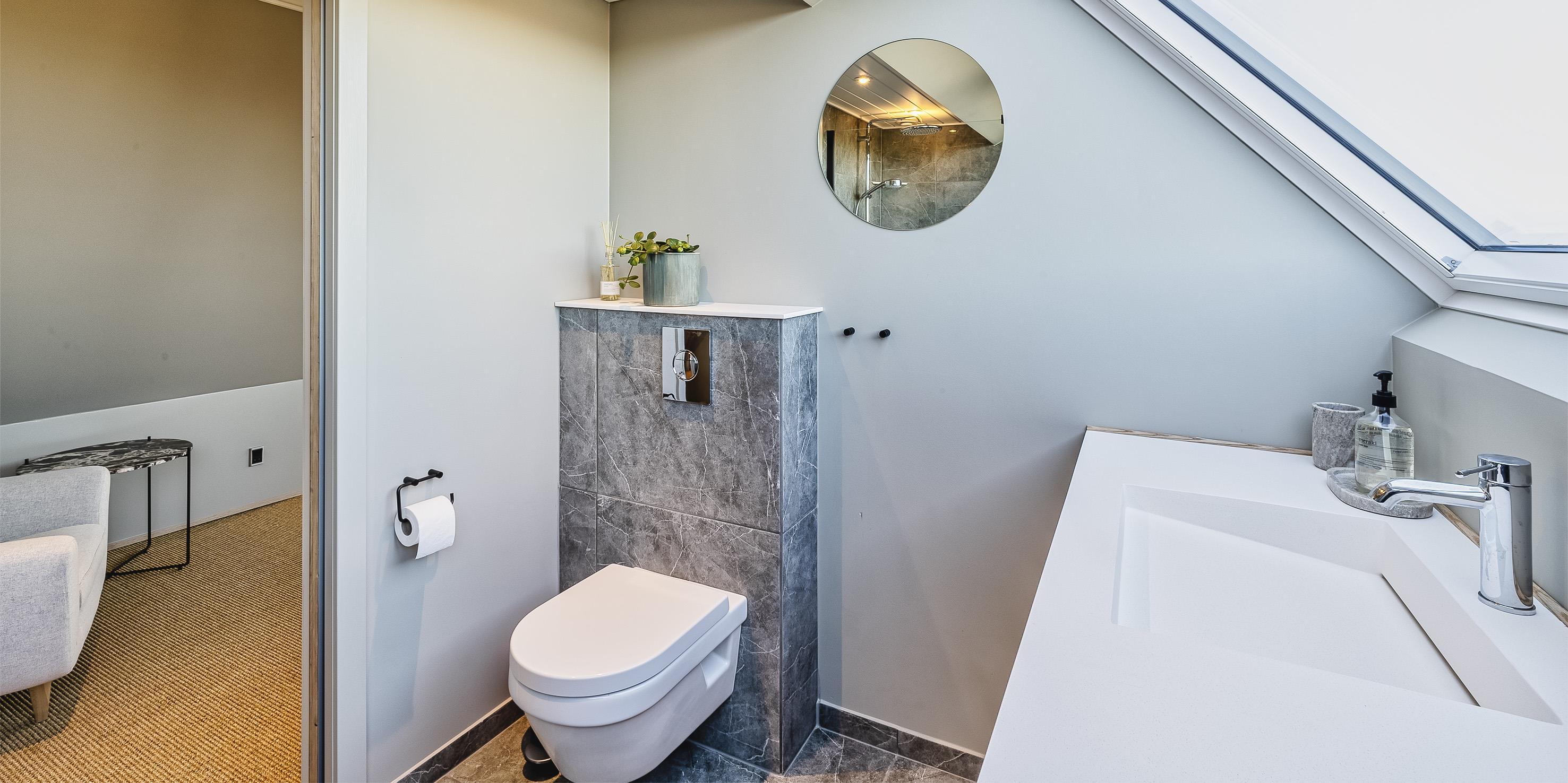 Badezimmer mit Toilette, Dusche und Waschbecken