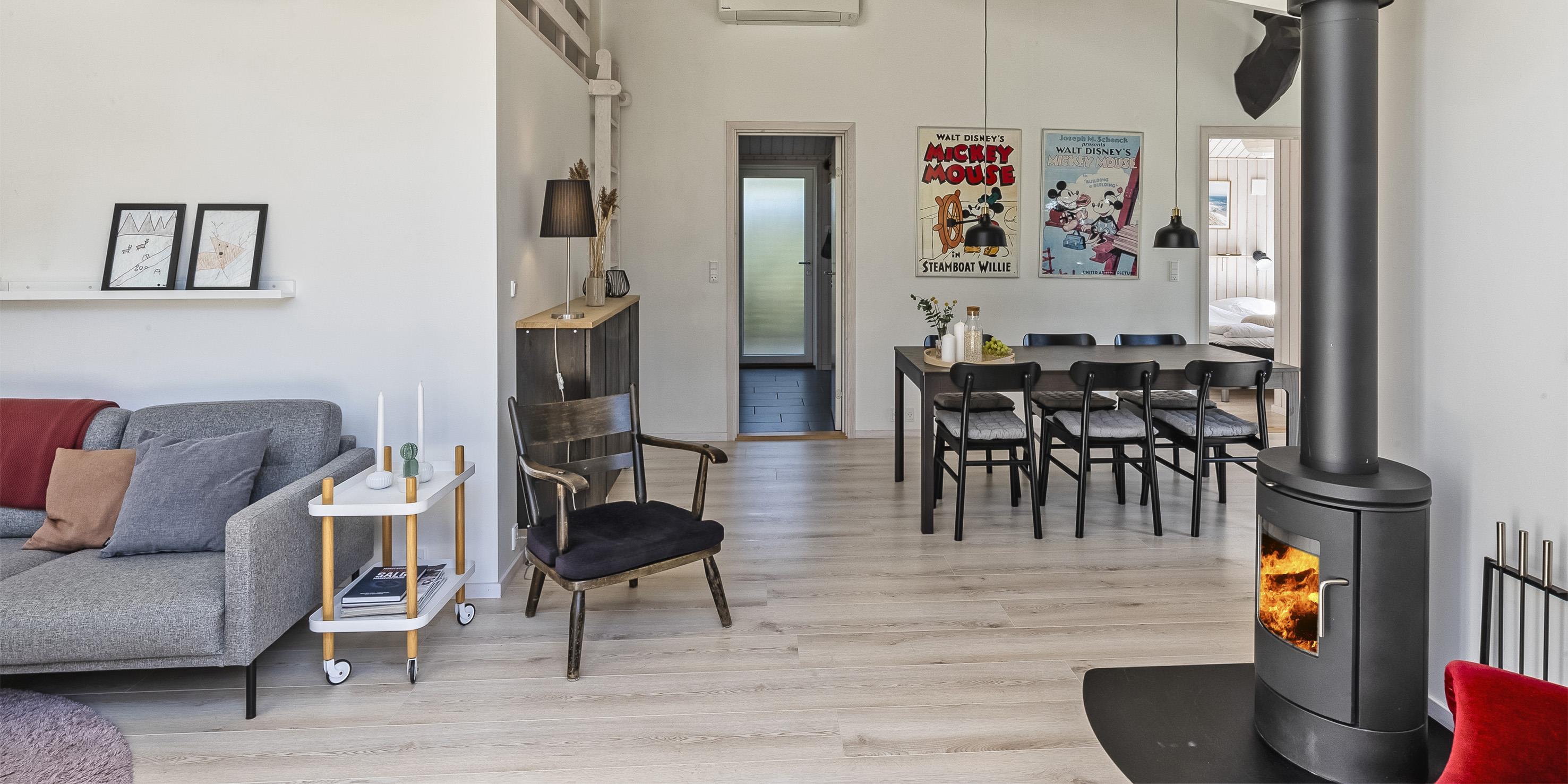 Das Innere des Hauses ist hell und einladend eingerichtet. Alles ist aufeinander abgestimmt. Der Wohnbereich ist offen mit dem Essbereich und der Küche. Ein Kamin spendet eine wohlige Wärme und befindet sich direkt gegenüber der Sofagarnitur. Desweiteren ist dieses Haus mit einer Wärmepumpe ausgestattet. Mit dieser Wärmepumpe haben Sie die Möglichkeit die Stromkosten zu senken, da sie energiesparend ist. Das Fernsehprogramm empfangen Sie über Chrome Cast. Ein Internetzugang befindet sich ebenfalls im Ferienhaus zur freien Verfügung. Das Ferienhaus ist mit einer schönen und gut ausgestatteten Küche eingerichtet, diese verfügt über einen Herd mit Cerankochfeld, einem Backofen in arbeitshöhe, einer Geschirrspülmaschine, einem Kühlschrank, einem Gefrierschrank und einer Mikrowelle. Es gibt zwei Badezimmer im Haus, ausgestattet mit je einer Fußbodenheizung, einem WC, einem Waschbecken und einer Dusche. Es stehen den Gästen drei schöne gute Schlafzimmer mit je einem Doppelbetten (DB + DB + DB) zur Verfügung. Haustiere sind nicht erlaub und auch das Rauchen im Ferienhaus ist untersagt.
