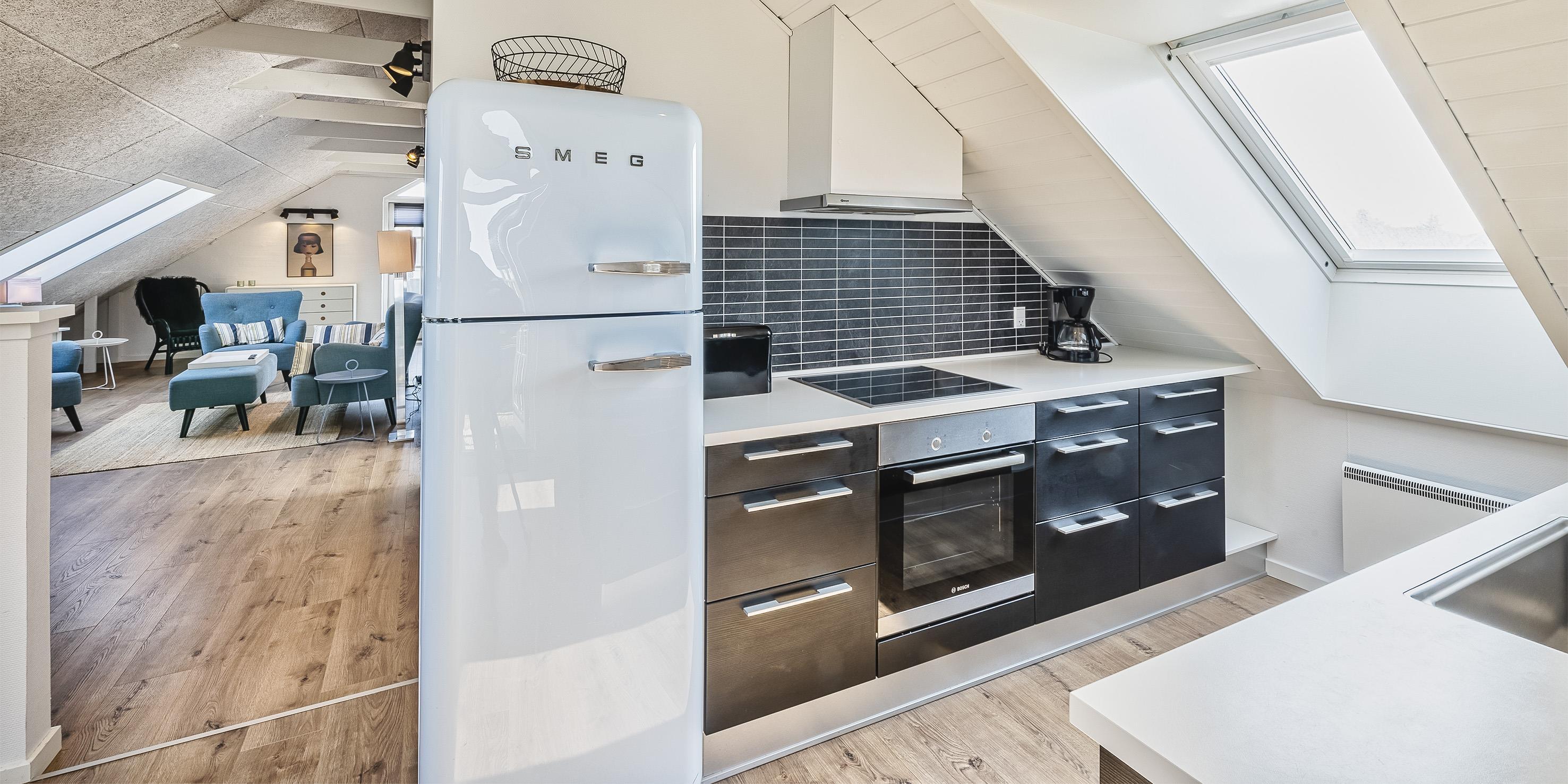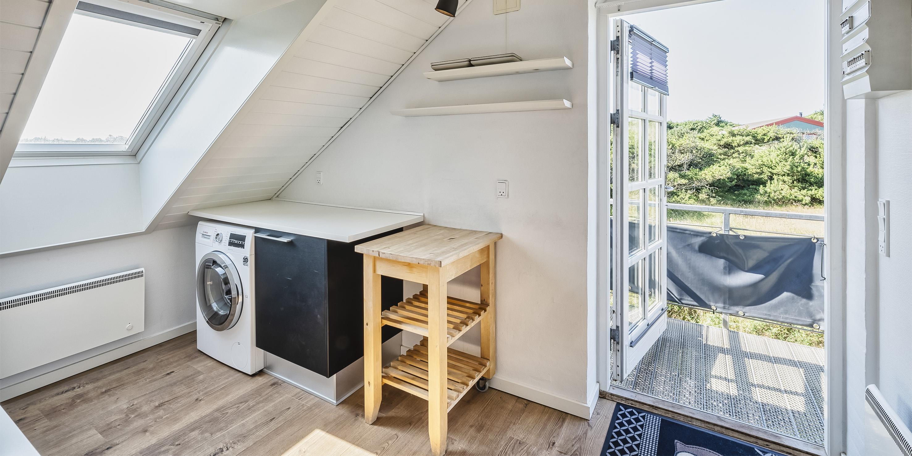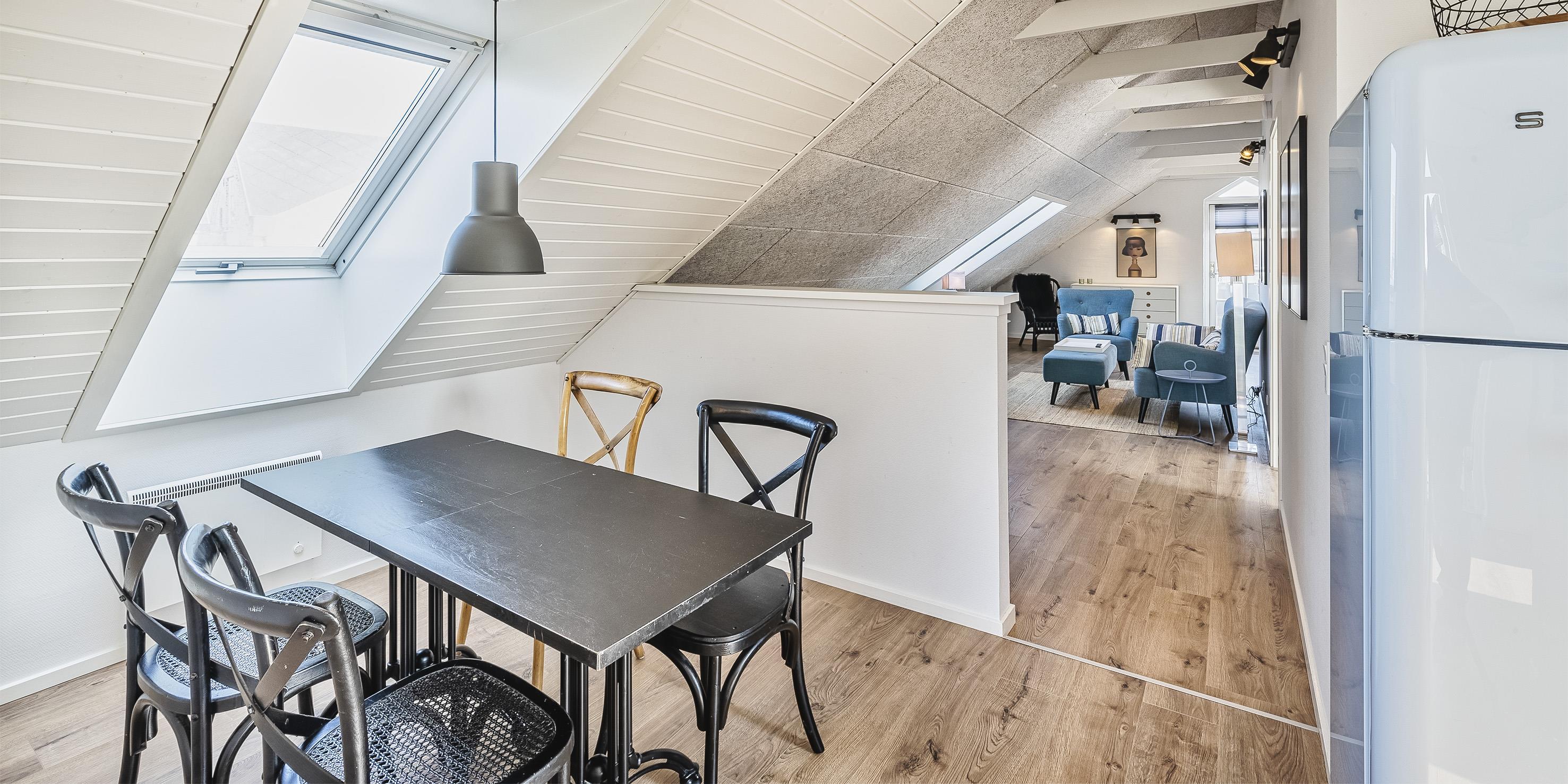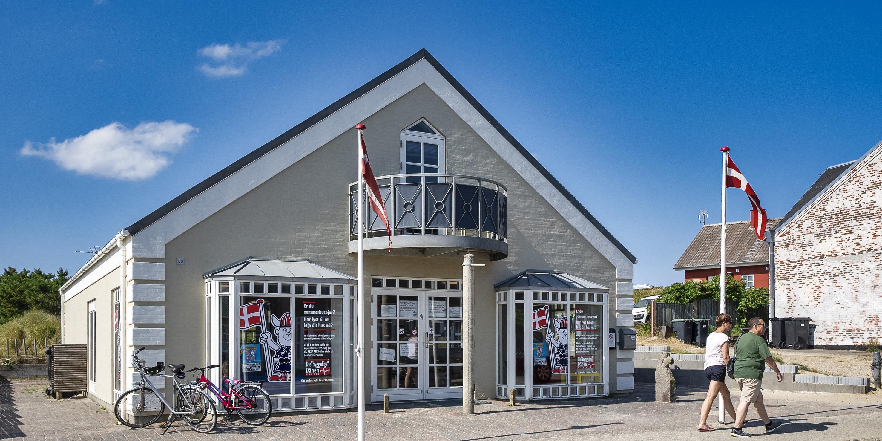 Diese helle und freundliche Ferienwohnung liegt Mitten im Herzen von Vejers Strand über der ehemalige Butik "Vivi". Sie ist geschmackvoll eingerichtet und bietet für 4 Personen genügend Platz. Die Wohnung erreichen Sie über eine Metalltreppe, die sich auf der Rückseite des Gebäudes befindet. Die Treppe ist mit großen Löchern versehen und weniger geeignet beim Aufstieg von Hunden. Die Wohnung befindet sich über dem Spiele-Land, daher kann es tagsüber zu Lärmbelätigung durch spielende Kinder kommen. Vom Balkon, der zum Ortsinneren zeigt, sind Sie hautnah am Geschehen von Vejers Strand dabei. Der Wohn- und Essbereich ist mit Laminat verlegt. Die Sofagarnitur ist sehr gemütlich und hat seinen gewissen Stil. Das deutsche Fernsehprogramm empfangen Sie über Parabol-Antenne. Die Küche ist modern eingerichtet und verfügt über einen Herd mit Cerankochfeld, einer Geschirrspülmaschine und einer Kühl- und Gefrierkombination. Das Badezimmer hat ein WC, eine Dusche und ein Handwaschbecken. Im Eingangsbereich sind die Waschmaschine und der Trockner untergebracht. Es gibt zwei Schlafzimmer in der Wohnung: DB + DB. Desweiteren finden Sie einen kleinen geschlossenen Innenhof, wo dann die Terrassenmöbeln aufgestellt sind. Es sind max. zwei Haustiere erlaubt. Es befindet sich eine Parkmöglichkeit direkt am Haus. Ab 01.07.2017 ist ein Internetanschluss (W-Lan) in der Wohnung vorhanden. Das Rauchen ist nicht gestattet. Die Wohnung ist in 2017 neu ausgebaut und renoviert, nur dass Badezimmer ist von 1997.