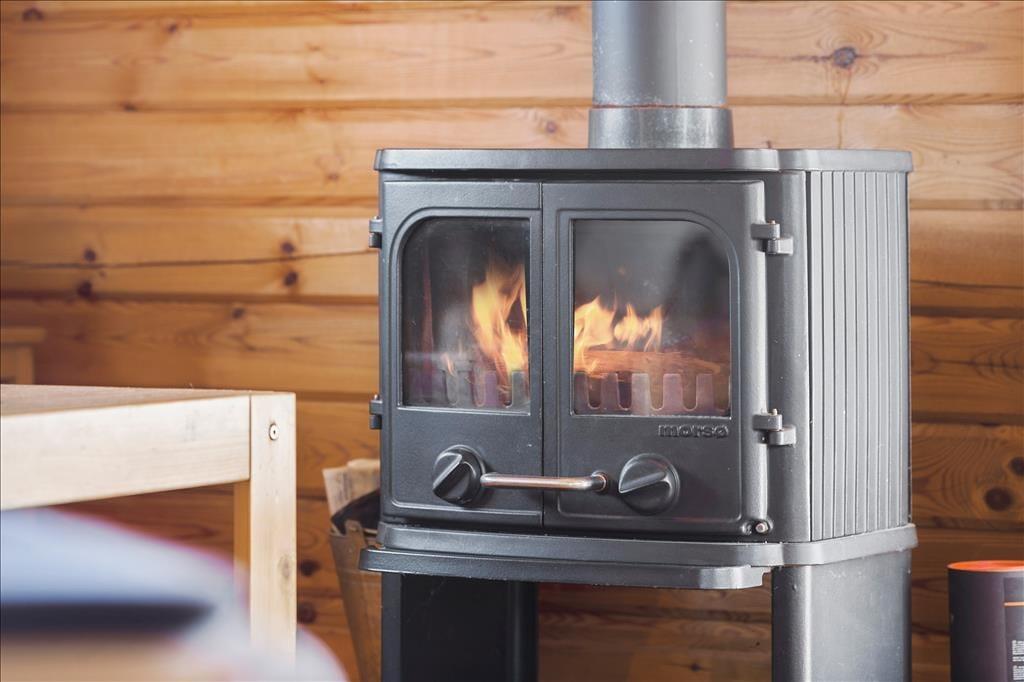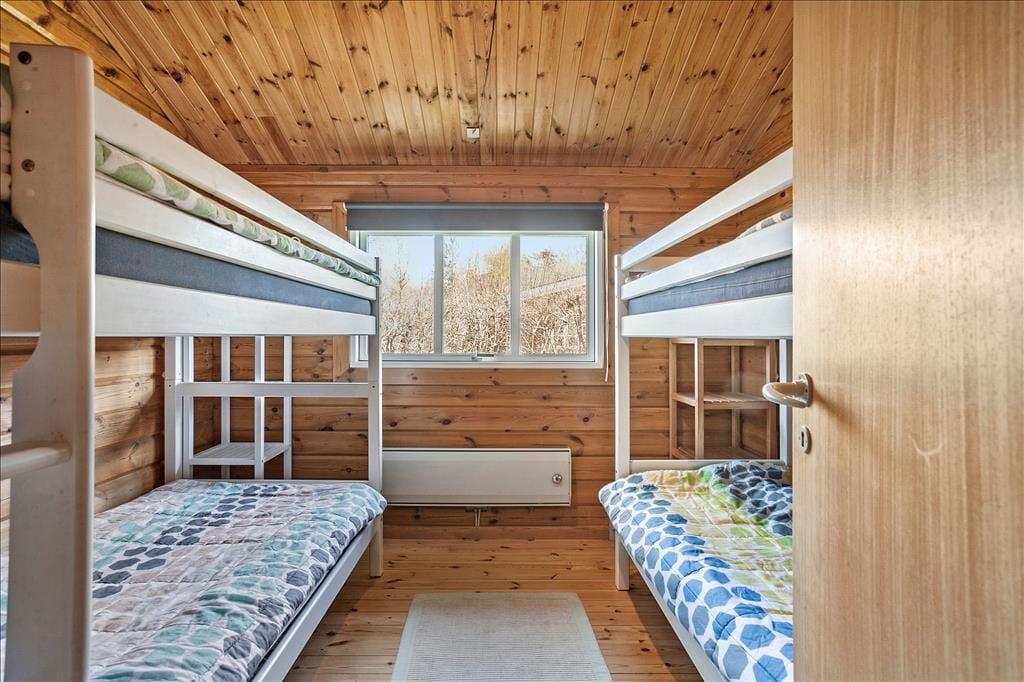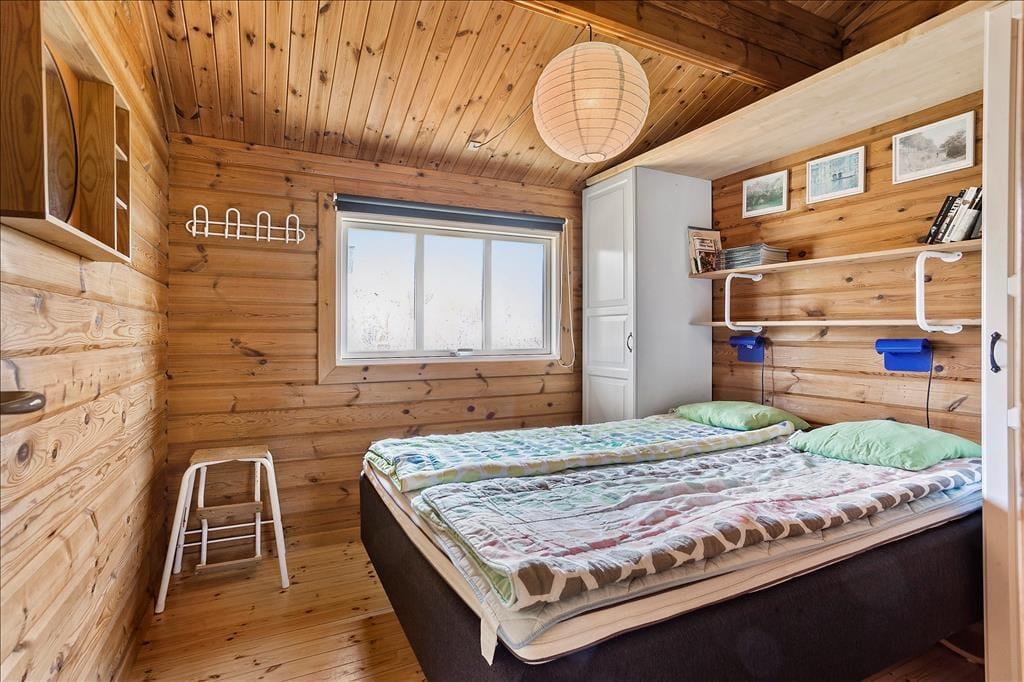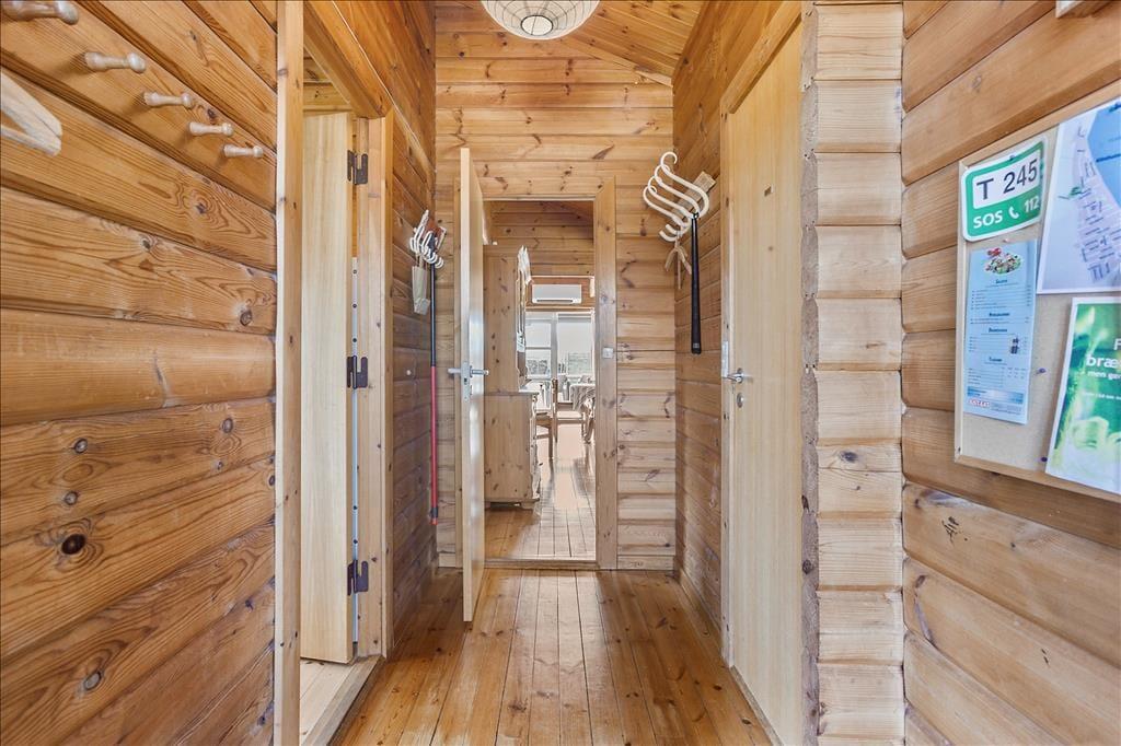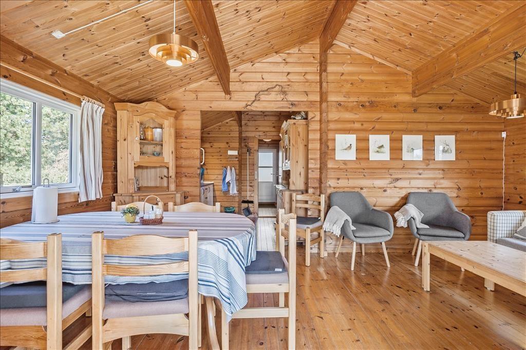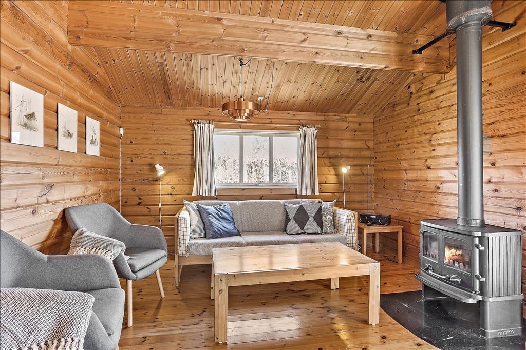 Wenn du das Blockhaus betrittst, wirst du von einer besonderen Gemütlichkeit empfangen, die entsteht, wenn Holz das dominierende Material von Boden bis Decke ist. Die sichtbaren Balken und Holzpaneele schaffen eine warme und einladende Atmosphäre, und es fühlt sich fast an, als würdest du in eine Waldhütte eintreten. Vom offenen Küchenbereich hast du direkten Zugang zum Wohnzimmer, in dem ein Kaminofen und eine Wärmepumpe dafür sorgen, dass es immer angenehm ist – unabhängig von der Jahreszeit. Hier könnt ihr euch zu einer Mahlzeit am Essbereich versammeln oder einen gemütlichen Abend mit Brettspielen vor dem knisternden Kaminofen verbringen. Das Kojen-Zimmer liegt gegenüber dem Badezimmer, das über eine geräumige Duschkabine verfügt.