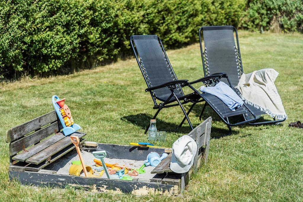Draußen erwartet dich eine große, gepflegte Rasenfläche, die zu Entspannung und Spiel einlädt. Hier kannst du mit den Kindern am Lagerfeuer Marshmallows rösten oder einen ruhigen Nachmittag verbringen, während sie auf der Schaukel spielen oder im Sandkasten buddeln. Wenn du so richtig abschalten möchtest, kannst du dich auf der großen Holzterrasse im Garten sonnen, wo es ausreichend Platz dafür gibt. Am Abend kannst du den Grill anwerfen und eine Mahlzeit unter freiem Himmel genießen, während die letzten Sonnenstrahlen des Tages die Umgebung erhellen. Es gibt auch eine kleinere Terrasse am Haupteingang, auf der du in aller Ruhe deinen Morgenkaffee genießen kannst.