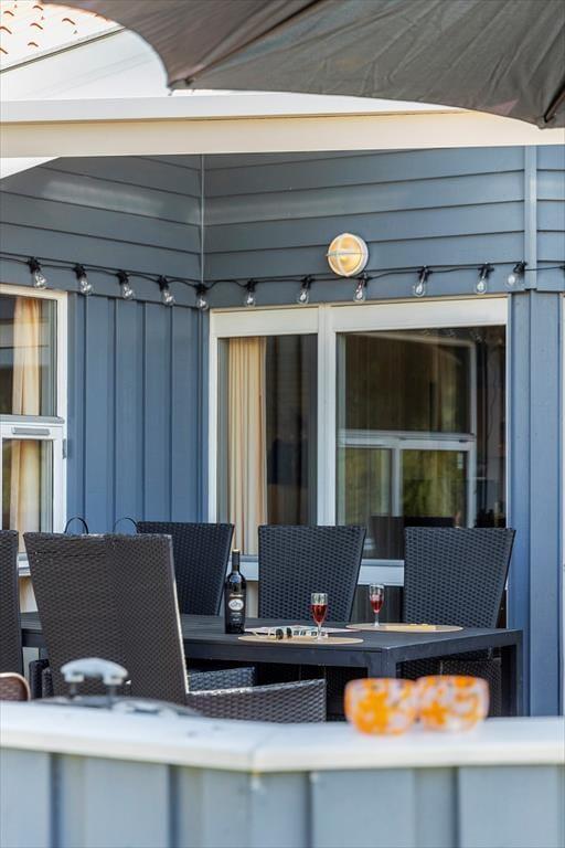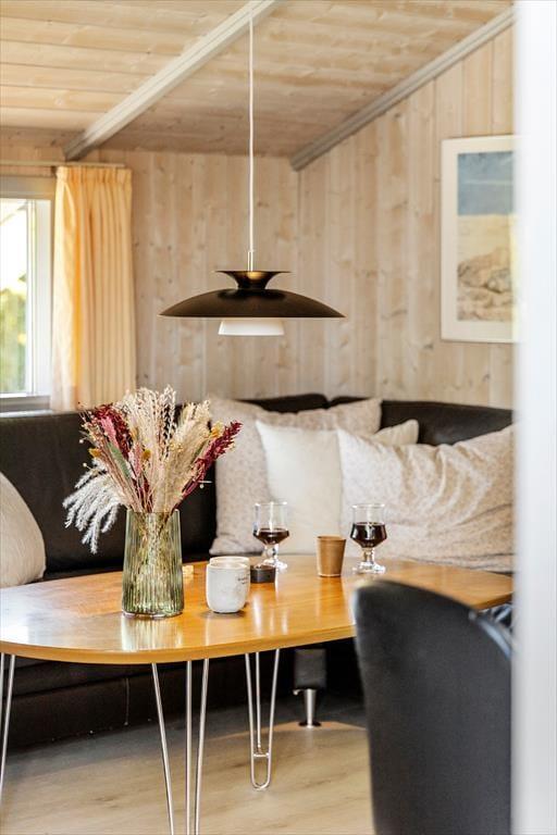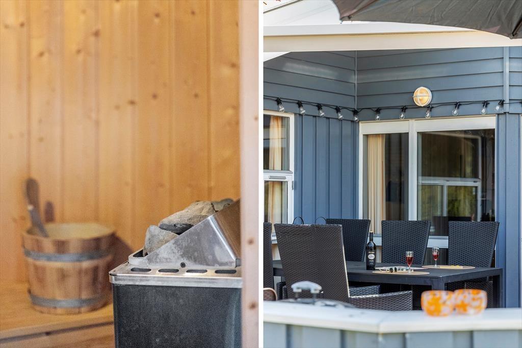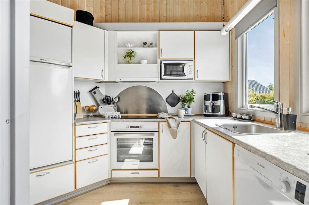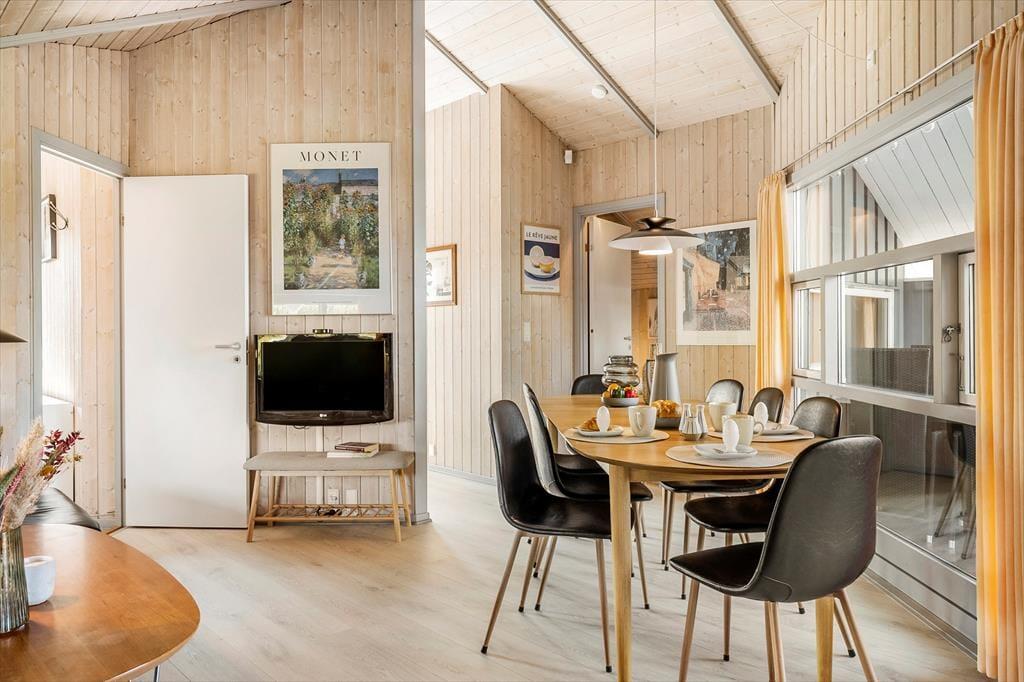 Wenn du das Ferienhaus betrittst, wirst du von einem hellen und geräumigen Wohnzimmer mit einem gemütlichen Kamin empfangen, der zu gemütlichen Abenden an kühleren Tagen einlädt. Hier kannst du mit der Familie einen Filmabend verbringen oder ein gutes Buch genießen, während das Feuer knistert. Die großen Fenster sorgen für viel Tageslicht im Raum, in dem sich auch der Essbereich befindet, wo ihr die Mahlzeiten des Urlaubs gemeinsam genießen könnt. Die Küche ist offen mit dem Wohnzimmer verbunden, und sowohl Küche als auch Wohnzimmer bieten alles, was du für einen angenehmen Urlaub brauchst. Wenn du dich nach zusätzlicher Entspannung sehnst, kannst du dich im hauseigenen Whirlpool oder in der Sauna verwöhnen lassen und die Seele baumeln lassen.