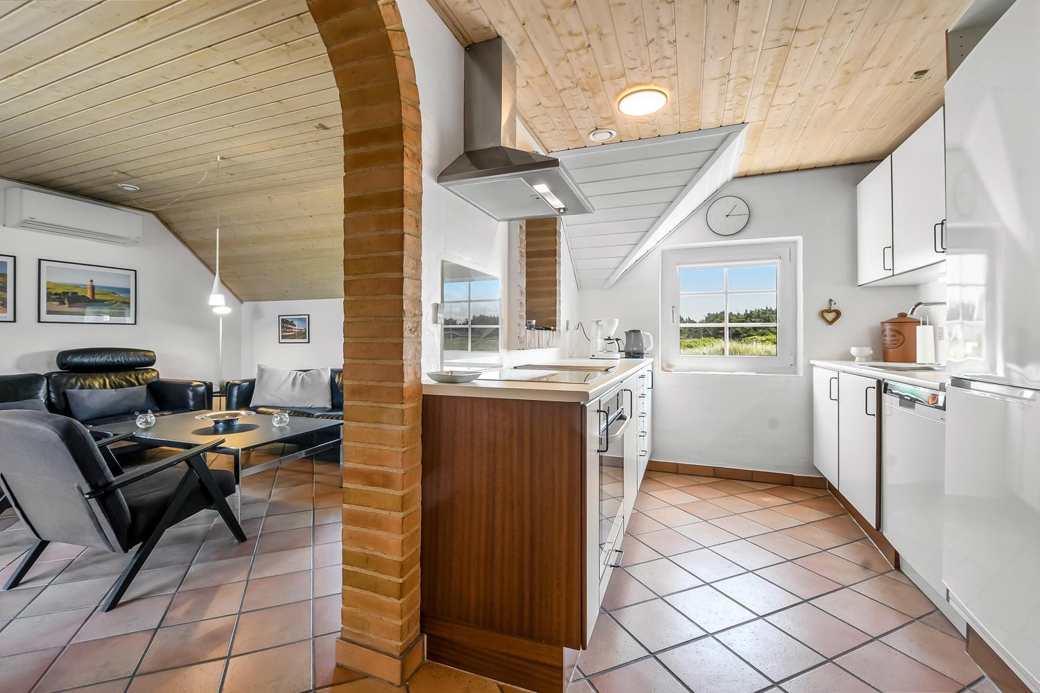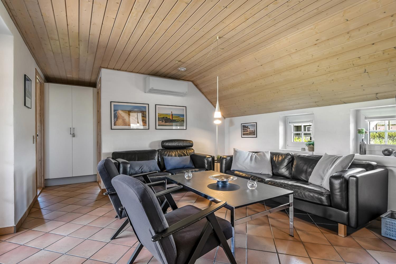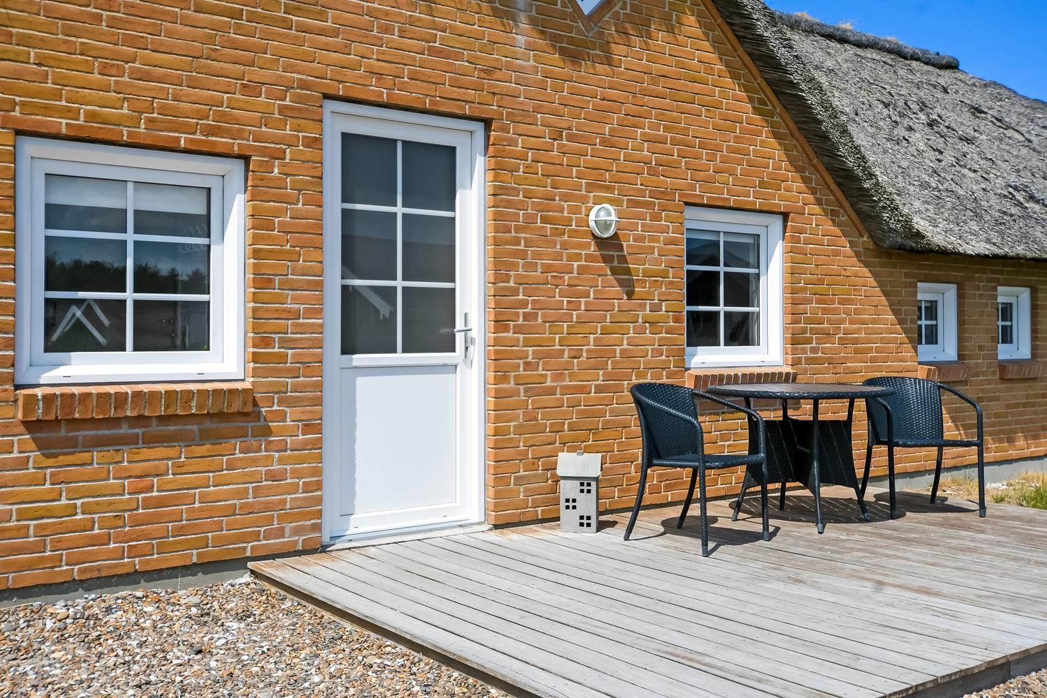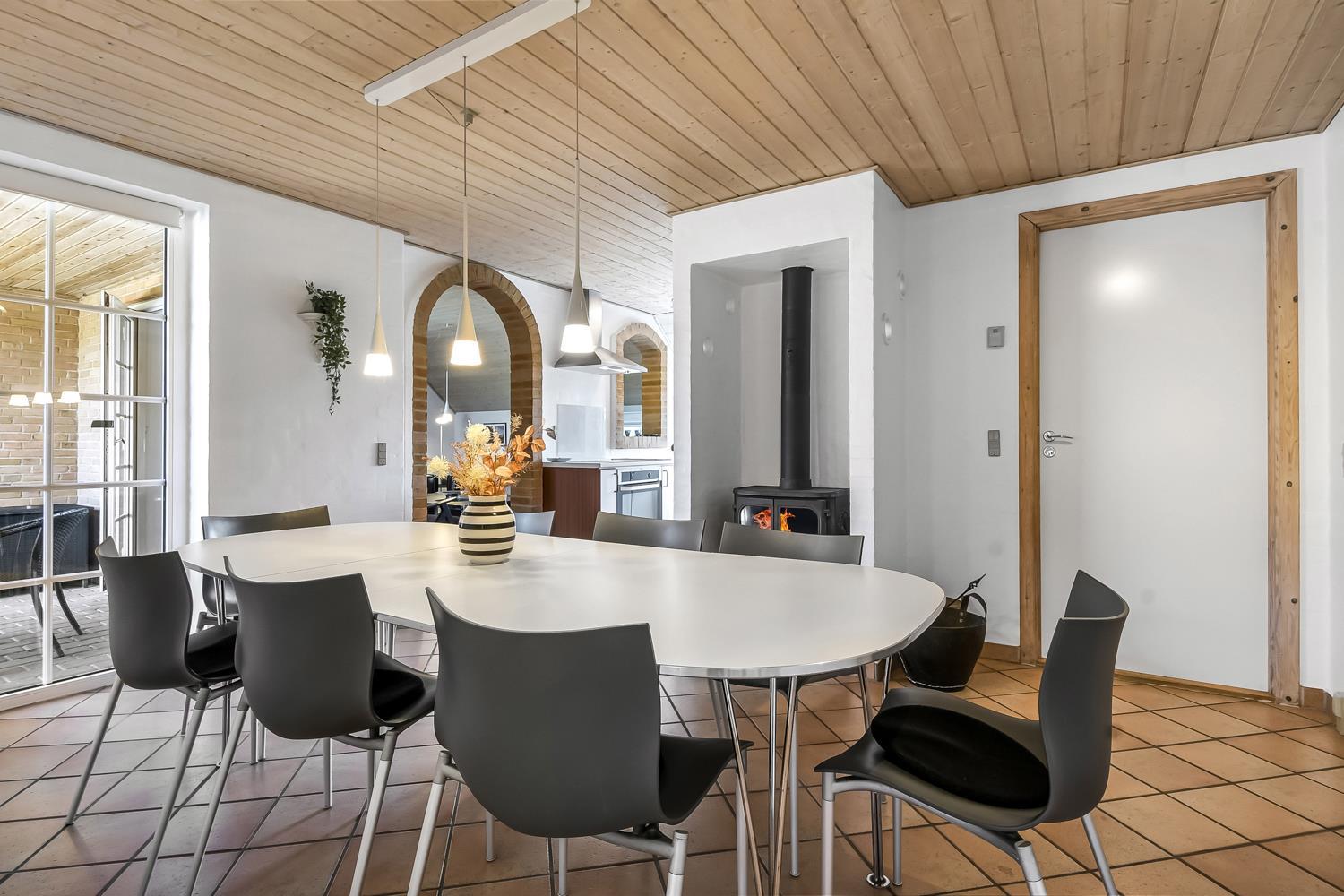 Wenn Sie mit dem Auto den Kiesweg erreichen, werden Sie sehen, dass das Haus und seine Lage etwas ganz Besonderes sind. Nach dem Einbiegen auf das Grundstück parkt das Auto auf dem schön angelegten Hofplatz und der Urlaub beginnt. Ein ansprechender Eingangsbereich mit Waschbecken, Waschmaschine und Trockner heißt Sie willkommen und führt direkt in die neue und moderne Küche. Diese hat alles an Geschirr und Küchengeräten. Die schicke Küche ist zudem mit Mikrowelle, Einbauherd mit Cerankochfeld, Dunstabzugshaube, Kühlschrank mit Gefrierfach und Geschirrspüler ausgestattet. Über eine Durchreiche in einer gemauerten Wand hält man stets Kontakt zum Wohnzimmer. Neben der Küche befindet sich der Esstisch für 8 Personen mit ausreichend Platz für die ganze, hungrige Familie. Das Wohnzimmer hat schöne Ledrmöbeln und einen wandmontierten Flachbildschirm-TV mit dänischem und deutschem Programm. Ein schöner Kaminofen und eine stromsparende Wärmepumpe sorgen dafür, dass Sie das Haus aufwärmen können und die Wärme an kalten Tagen halten können; die moderne Genvexanlage sorgt im Haus für einen Luftaustausch bis zu 92%, schafft ein fantastisches Raumklima und hilft , bei der Stromrechnung zu sparen. Vier große Schlafzimmer mit Doppelbetten (1 DB, 1 DB, 1 DB, 1 DB). Das Badezimmer verfügt über eine Dusche, Toilette, Waschbecken und Fliesenboden mit Fußbodenheizung. Schöner und geräumiger Spa-Bereich mit großem Whirlpool und Zugang zu einem extra Badezimmer mit Dusche, Toilette, Waschbecken und Zugang zur Sauna. Im Wellnessbereich gibt es bequeme Sitzmöglichkeiten sowie einen zusätzlichen Fernseher. Das gesamte Haus hat Fliesenböden mit Fußbodenheizung gegen kalte Füße und ist somit leicht zu reinigen. Nichtraucherhaus. 2 Haustiere erlaubt.