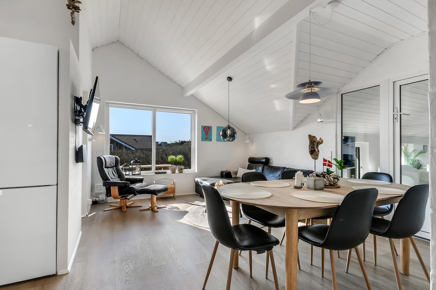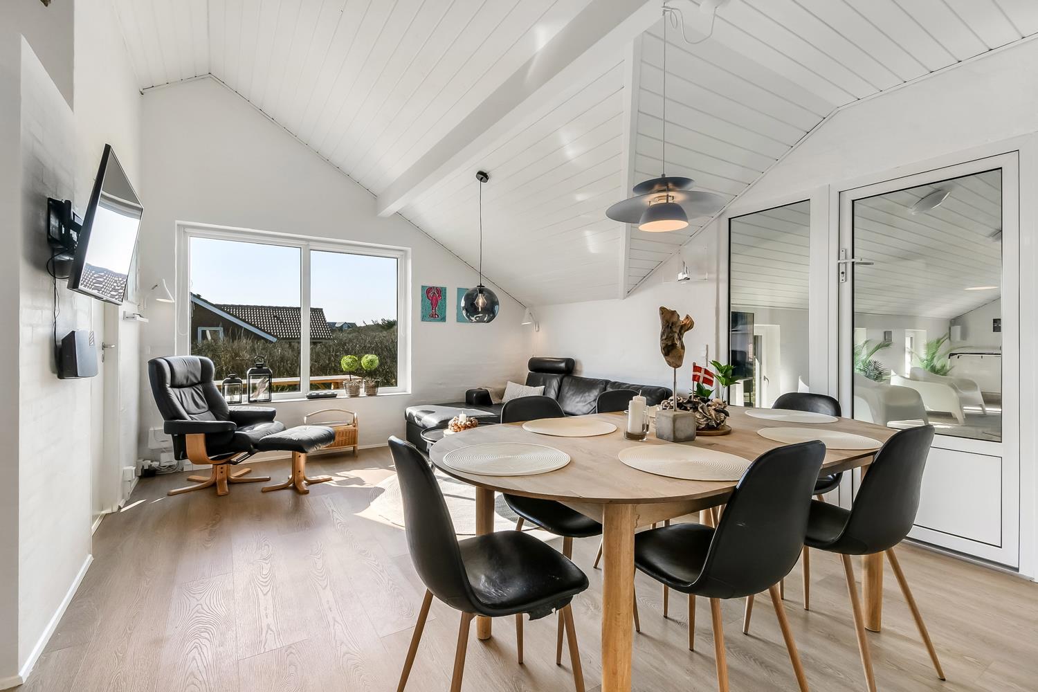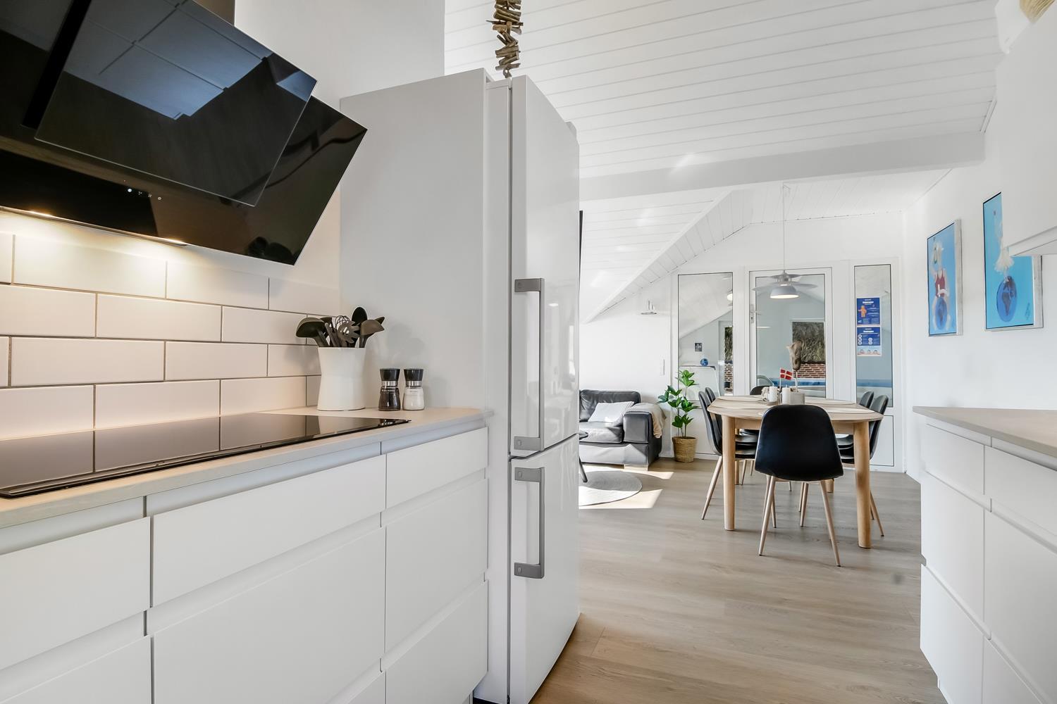 Das ca. 140 m² große Haus überzeugt mit einem modernen, hellen Einrichtungsstil und durchdachten Details. Der großzügige Eingangsbereich ist mit Waschmaschine, Trockner und Hauswirtschaftsraum ausgestattet. Das Herzstück ist der offene Wohnbereich mit hochwertigen Ledermöbeln, Essplatz und Smart-TV mit dänischen und deutschen Sendern sowie Streamingmöglichkeiten.