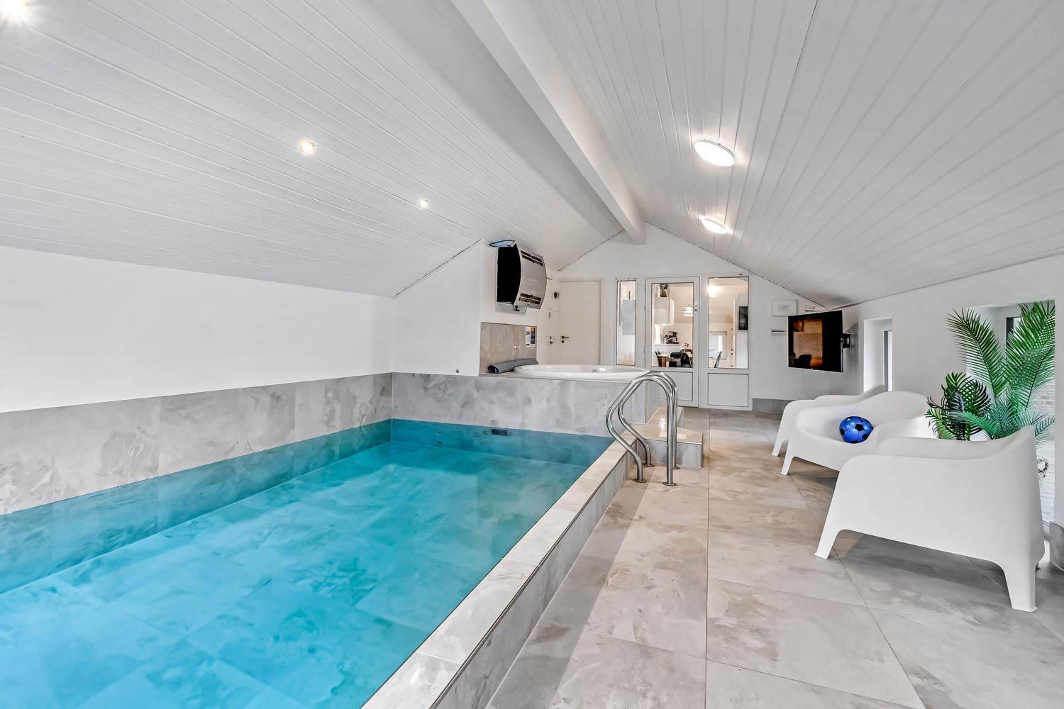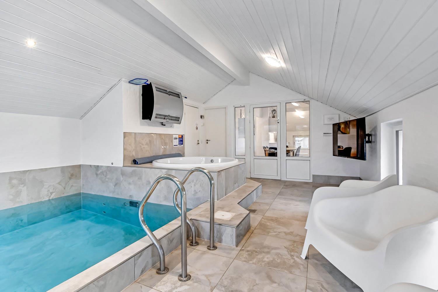 Vier Schlafzimmer (2 Doppelbetten, 1 Etagenbett, 1 mit zwei Einzelbetten), zwei Badezimmer und ein traumhafter Poolbereich gehören zur Ausstattung. Der Pool ist 5,5 x 3 Meter groß, der Whirlpool bietet Platz für 4 Personen und eine gemütliche Sauna rundet das Wellness-Erlebnis ab. Alles mit Fußbodenheizung und energieeffizientem Luft-Wasser-System. Bluetooth-Lautsprecher und ein zusätzliches TV sorgen für Unterhaltung.