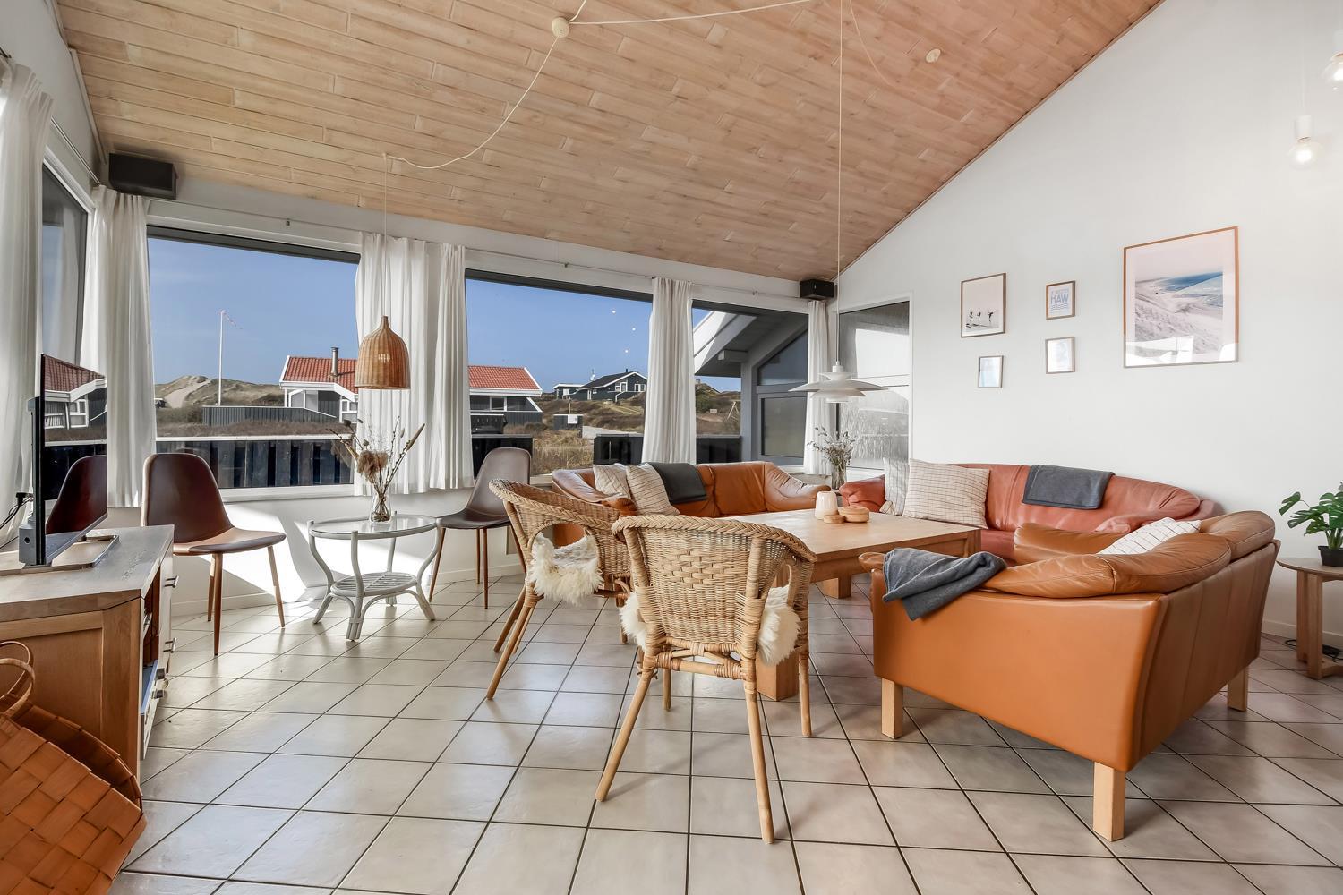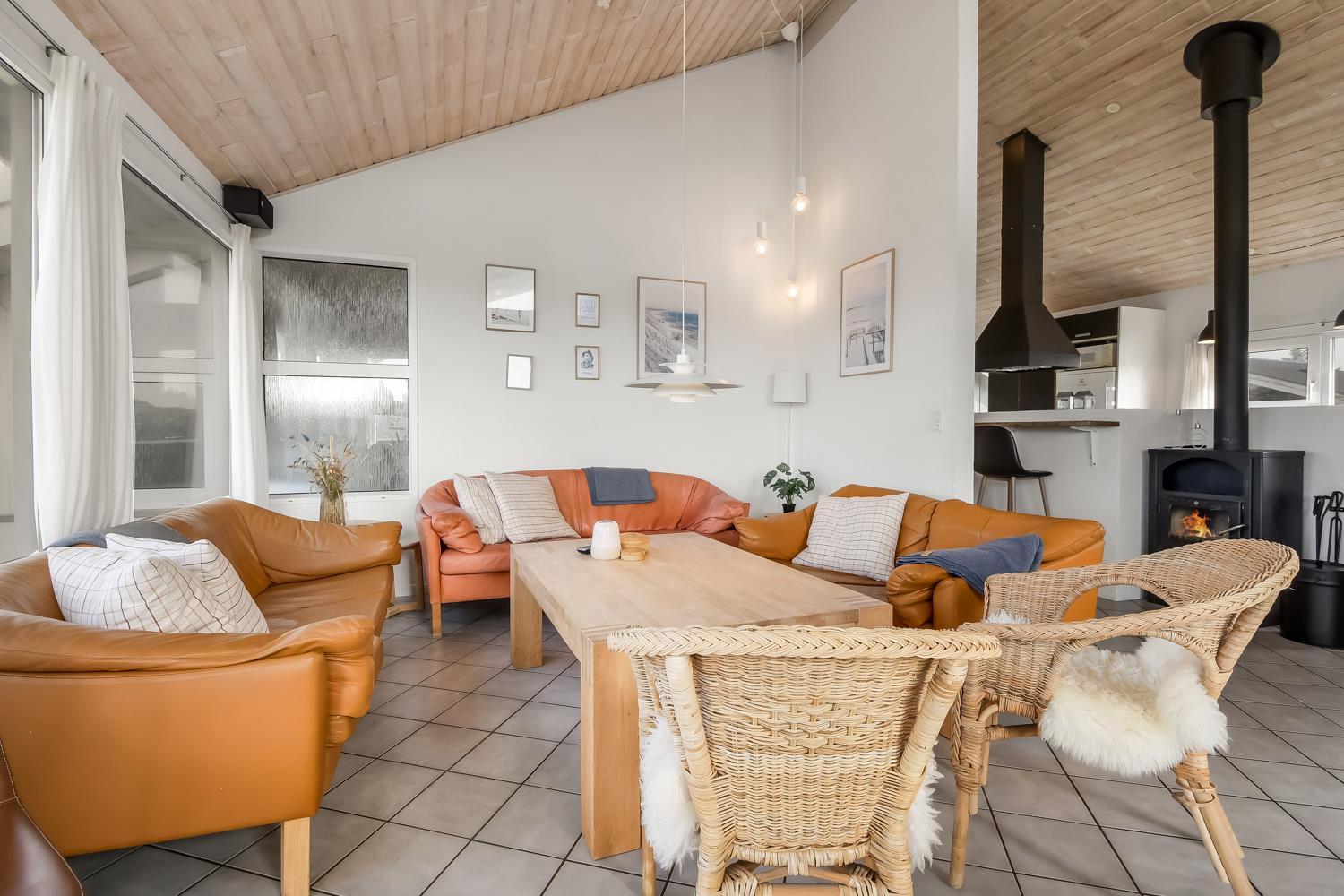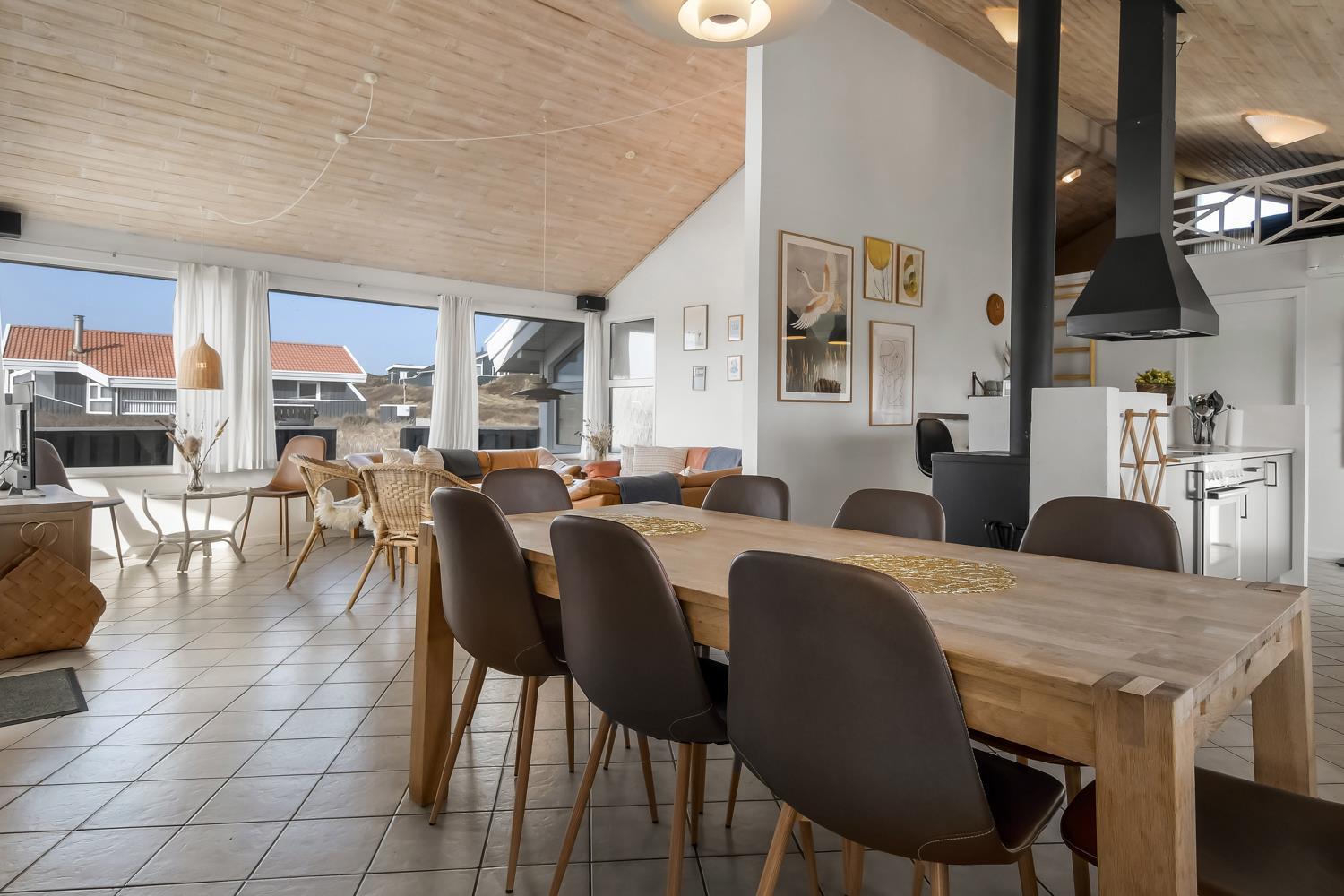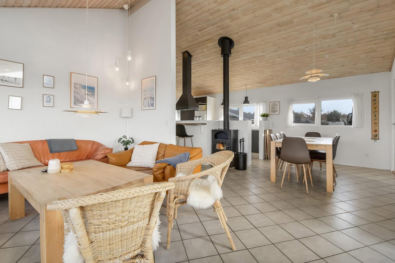 Komfortabel eingerichtetes Ferienhaus aus Holz. Das Wohnzimmer hat eine offene Decke mit großen Dachfenstern, die für einen herrlichen Lichteinfall sorgen. Offene Küche mit Wohn- und Essbereich, eingerichtet mit hochwertigen Möbeln. Hier genießen Sie die Aussicht auf die Dünen oder entspannen vor dem knisternden Kamin. Auf dem Smart-TV mit dänischen und deutschen Programmen und der Möglichkeit für Streaming von TV/Radio/Apps eingerichtet. Haben Sie ein Handy oder ein anderes Gerät mit dem Sie streamen können, haben Sie hier die Möglickeit. DVD- und CD-Player sind vorhanden. In Küche und Wohnzimmer gibt es Fliesenboden mit Fußbodenheizung. 5 Schlafzimmer mit Doppelbetten (DB) und Einzelbetten (EB): 1 DB + 1 DB + 1 DB + 2 EB + 2 EB und 2 Hemse (Schlafböden). Für die kleinen Gäste stehen Kinderbett und Hochstuhl zur Verfügung. Neue Küche mit vielen Geräten, u. a. Geschirrspüler, Mikrowelle und Kühlschrank mit Gefrierfach. Es gibt 2 Badezimmer mit Fußbodenheizung und Dusche, Toilette, Waschbecken, eines mit Whirlpool und direktem Zugang zur Sauna. Im Haus ist eine energiesparende Wärmepumpe installiert. 1 Haustiere ist erlaubt.