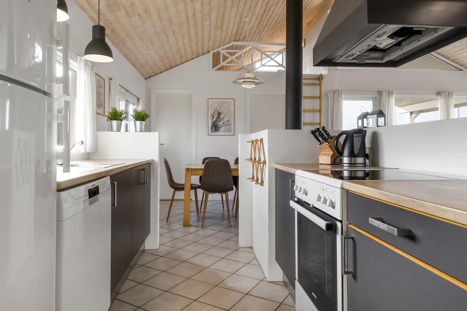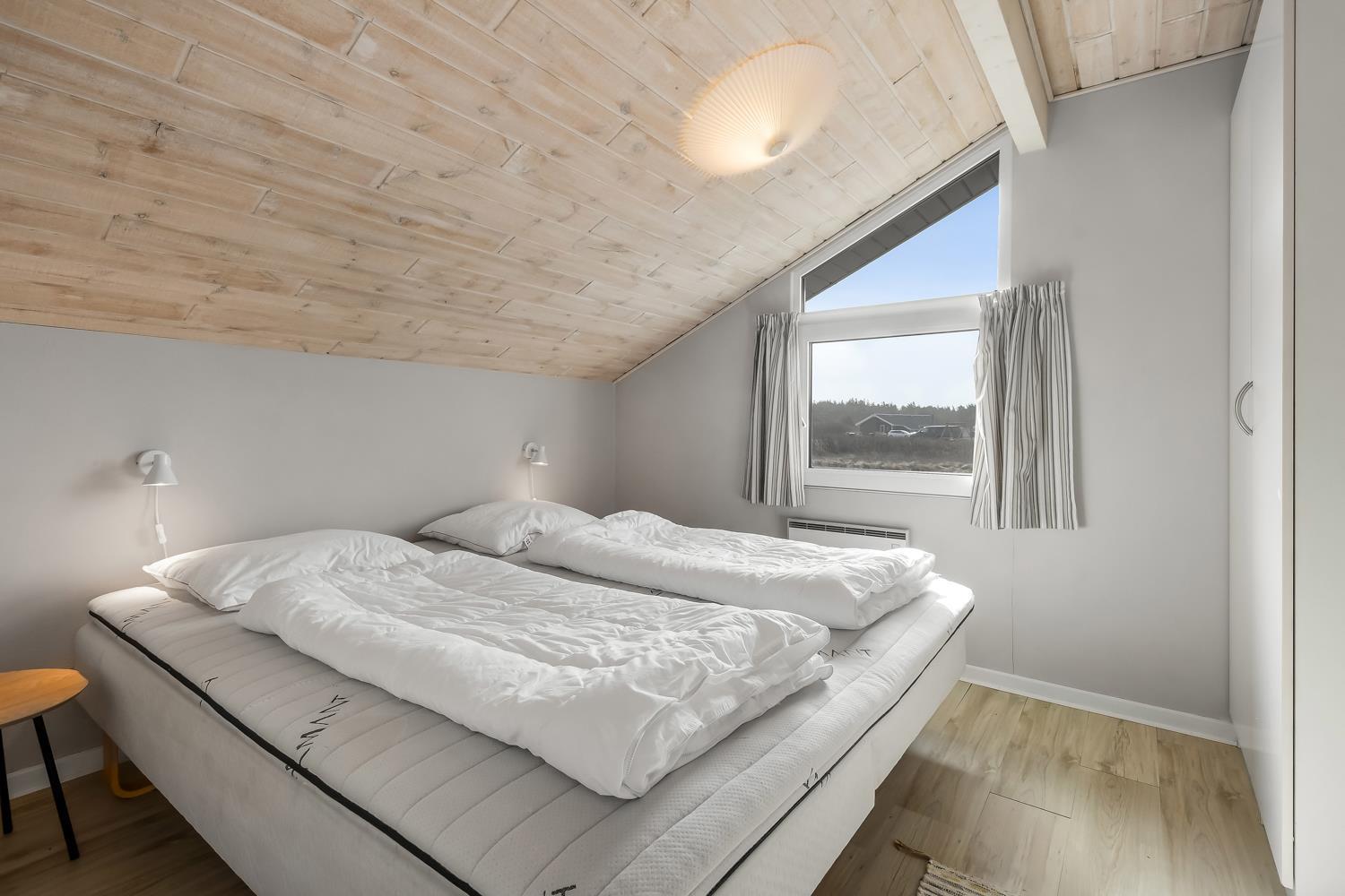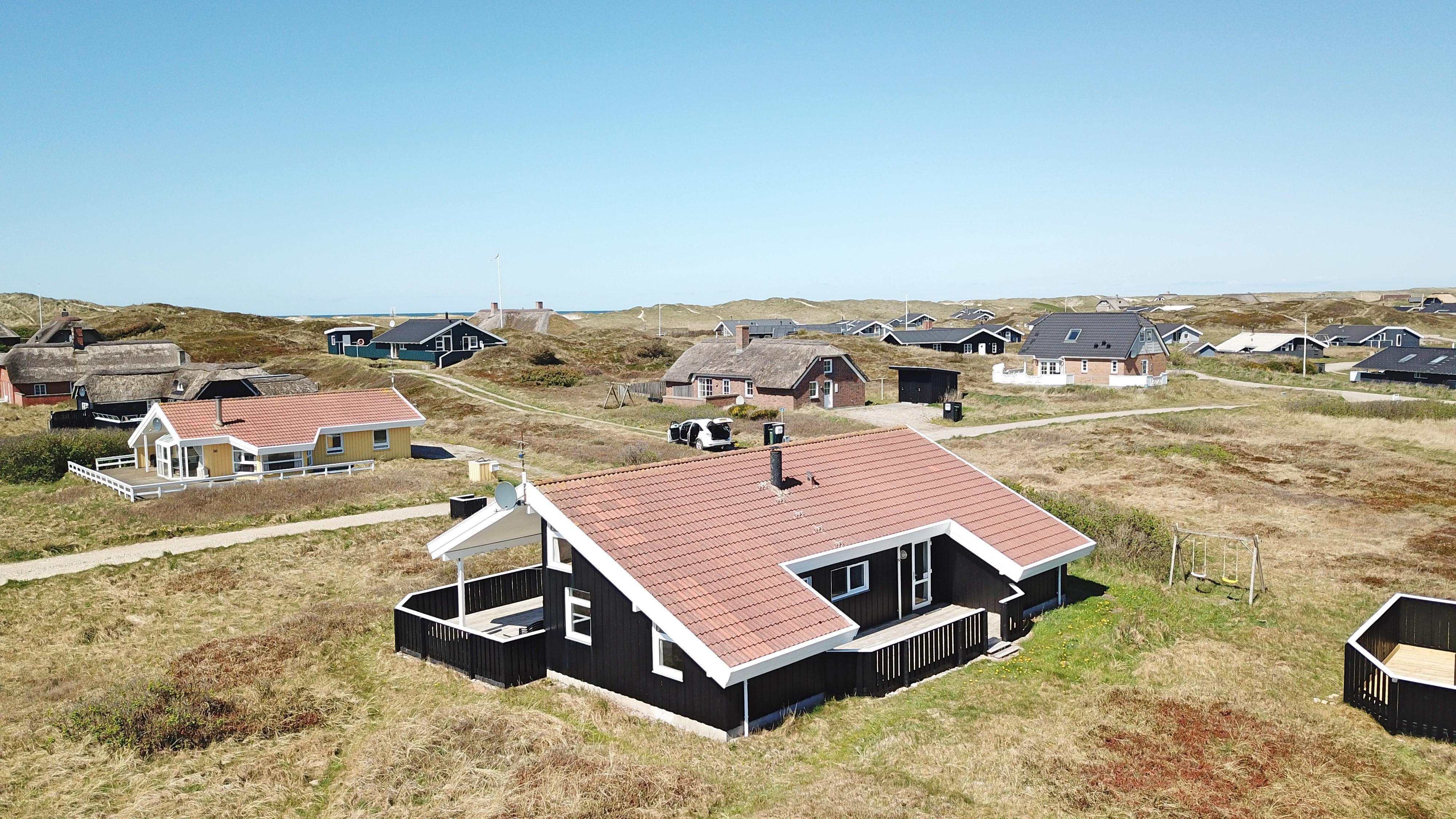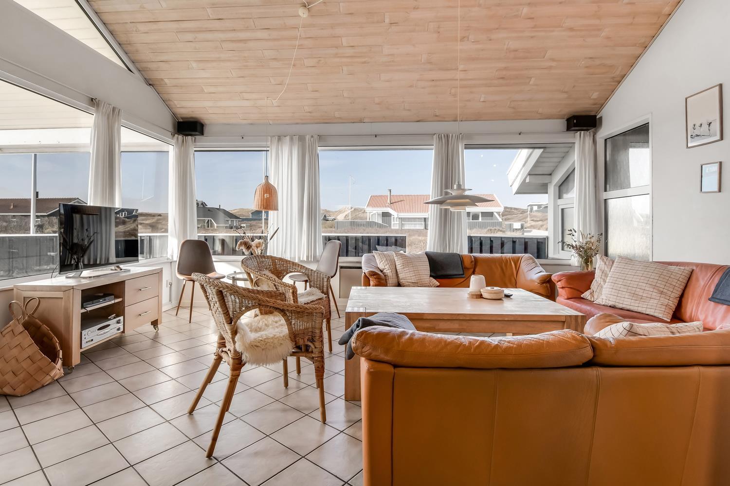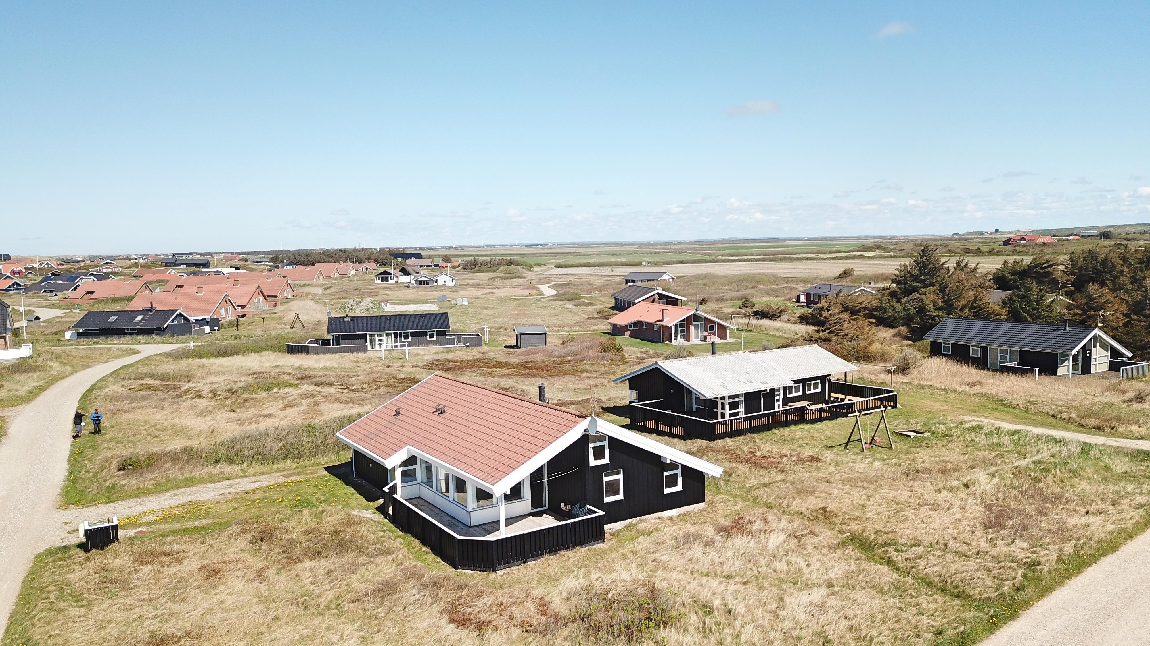 Komfortabel eingerichtetes Ferienhaus aus Holz. Das Wohnzimmer hat eine offene Decke mit großen Dachfenstern, die für einen herrlichen Lichteinfall sorgen. Offene Küche mit Wohn- und Essbereich, eingerichtet mit hochwertigen Möbeln. Hier genießen Sie die Aussicht auf die Dünen oder entspannen vor dem knisternden Kamin. Auf dem Smart-TV mit dänischen und deutschen Programmen und der Möglichkeit für Streaming von TV/Radio/Apps eingerichtet. Haben Sie ein Handy oder ein anderes Gerät mit dem Sie streamen können, haben Sie hier die Möglickeit. DVD- und CD-Player sind vorhanden. In Küche und Wohnzimmer gibt es Fliesenboden mit Fußbodenheizung. 5 Schlafzimmer mit Doppelbetten (DB) und Einzelbetten (EB): 1 DB + 1 DB + 1 DB + 2 EB + 2 EB und 2 Hemse (Schlafböden). Für die kleinen Gäste stehen Kinderbett und Hochstuhl zur Verfügung. Neue Küche mit vielen Geräten, u. a. Geschirrspüler, Mikrowelle und Kühlschrank mit Gefrierfach. Es gibt 2 Badezimmer mit Fußbodenheizung und Dusche, Toilette, Waschbecken, eines mit Whirlpool und direktem Zugang zur Sauna. Im Haus ist eine energiesparende Wärmepumpe installiert. 1 Haustiere ist erlaubt.