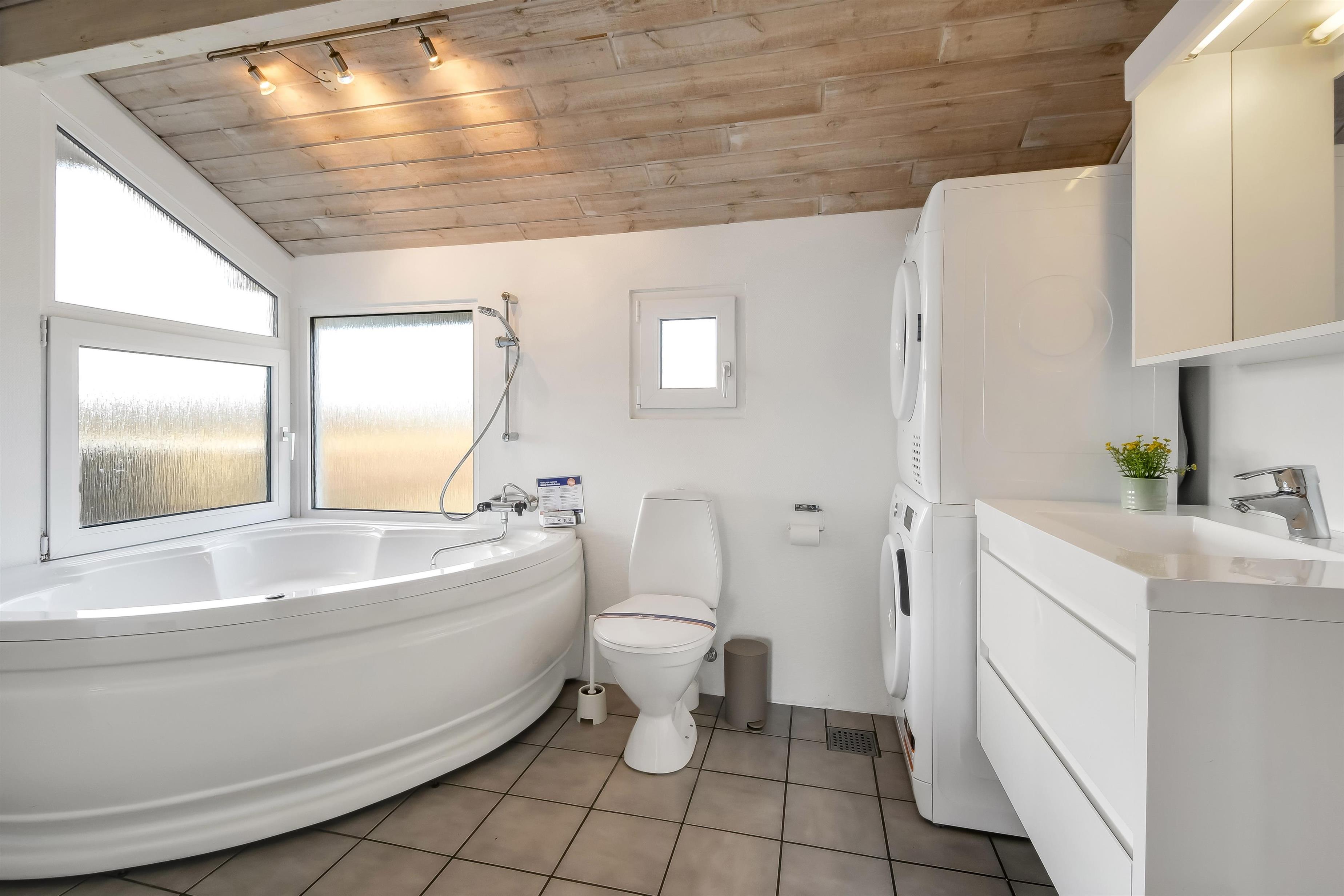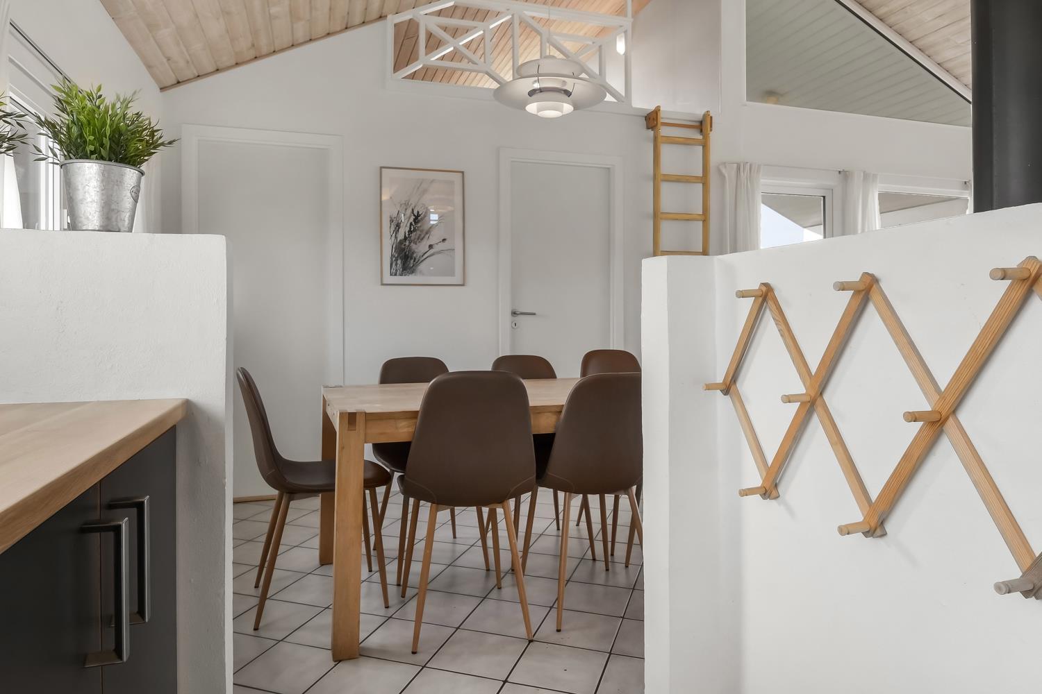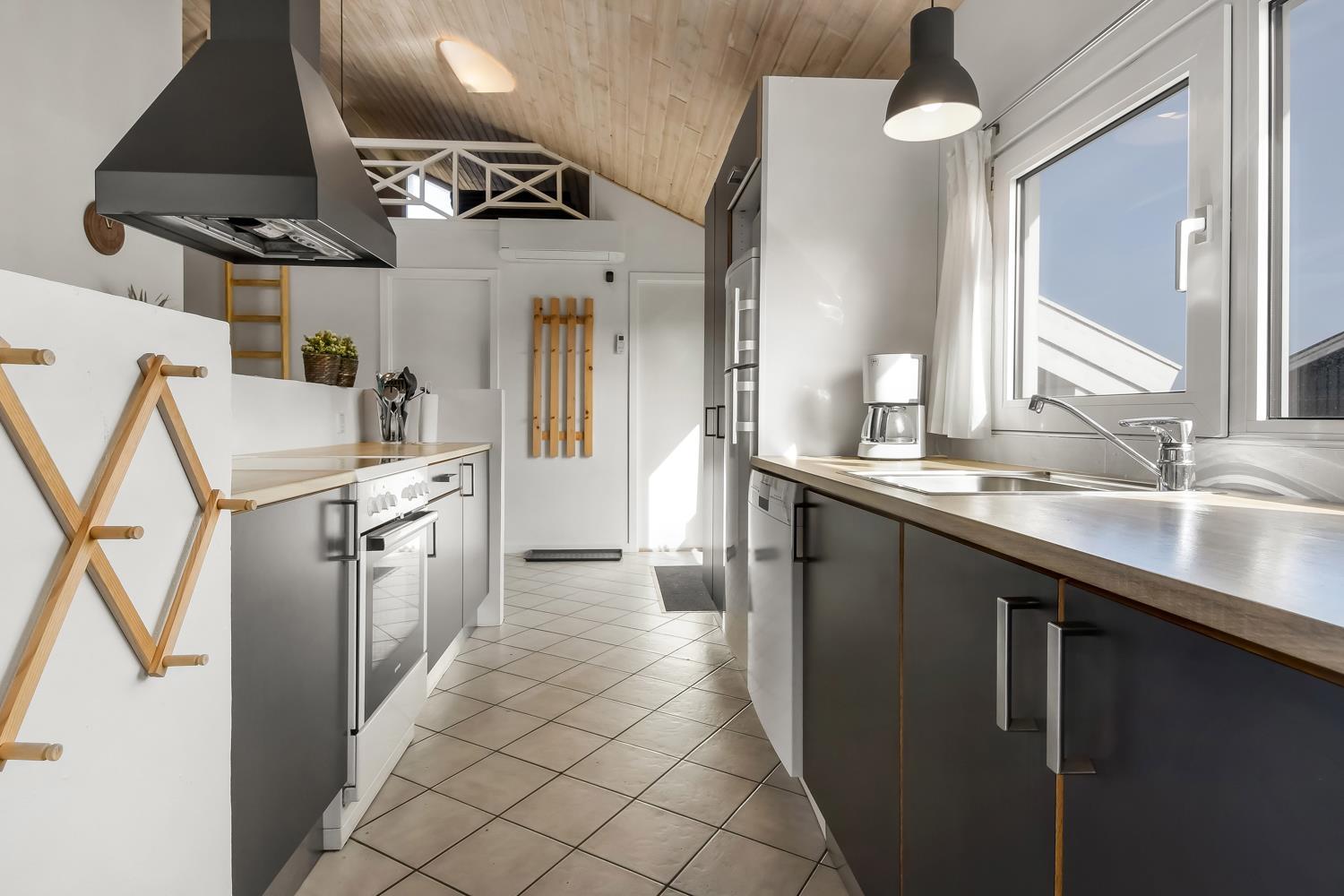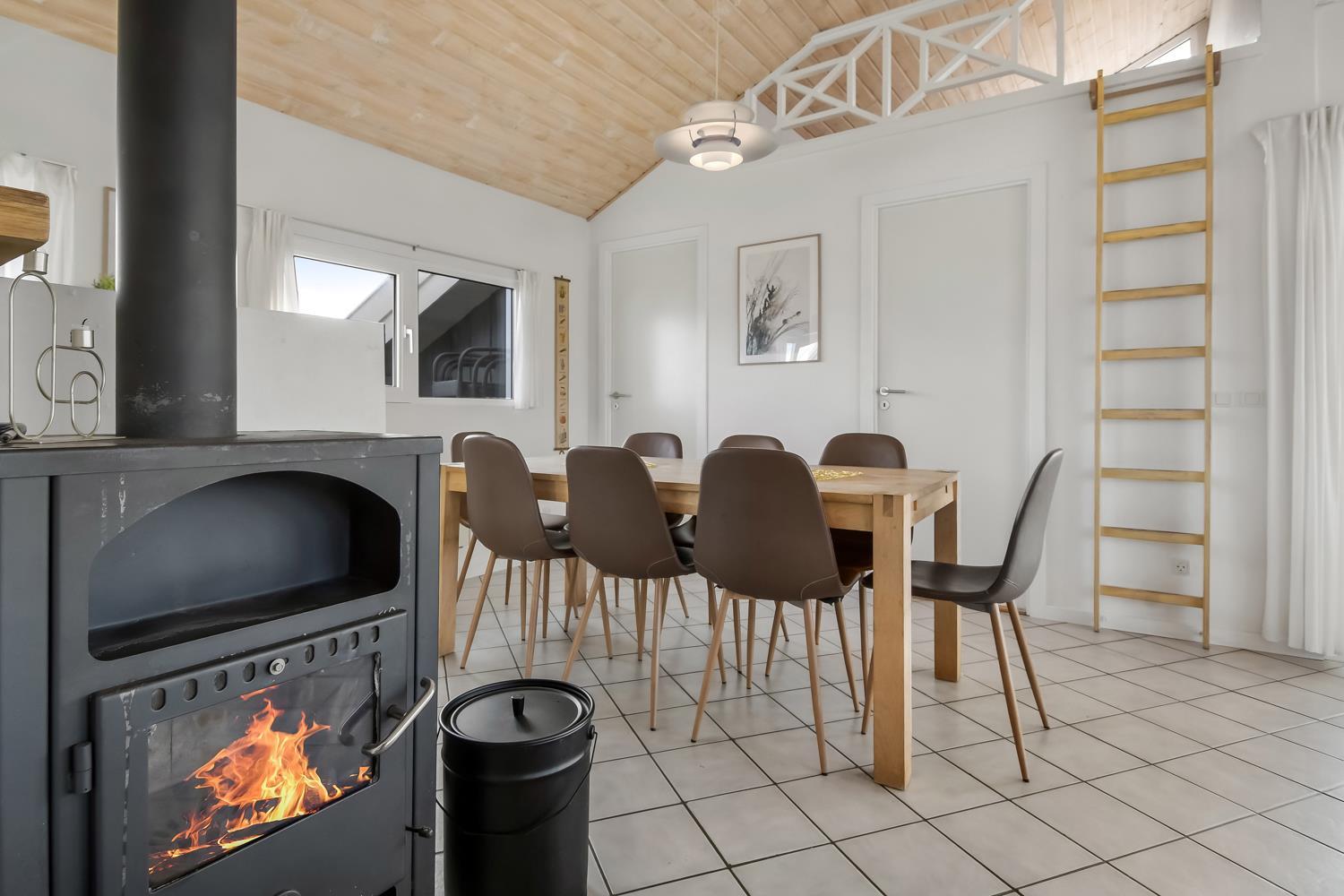 Komfortabel eingerichtetes Ferienhaus aus Holz. Das Wohnzimmer hat eine offene Decke mit großen Dachfenstern, die für einen herrlichen Lichteinfall sorgen. Offene Küche mit Wohn- und Essbereich, eingerichtet mit hochwertigen Möbeln. Hier genießen Sie die Aussicht auf die Dünen oder entspannen vor dem knisternden Kamin. Auf dem Smart-TV mit dänischen und deutschen Programmen und der Möglichkeit für Streaming von TV/Radio/Apps eingerichtet. Haben Sie ein Handy oder ein anderes Gerät mit dem Sie streamen können, haben Sie hier die Möglickeit. DVD- und CD-Player sind vorhanden. In Küche und Wohnzimmer gibt es Fliesenboden mit Fußbodenheizung. 5 Schlafzimmer mit Doppelbetten (DB) und Einzelbetten (EB): 1 DB + 1 DB + 1 DB + 2 EB + 2 EB und 2 Hemse (Schlafböden). Für die kleinen Gäste stehen Kinderbett und Hochstuhl zur Verfügung. Neue Küche mit vielen Geräten, u. a. Geschirrspüler, Mikrowelle und Kühlschrank mit Gefrierfach. Es gibt 2 Badezimmer mit Fußbodenheizung und Dusche, Toilette, Waschbecken, eines mit Whirlpool und direktem Zugang zur Sauna. Im Haus ist eine energiesparende Wärmepumpe installiert. 1 Haustiere ist erlaubt.
