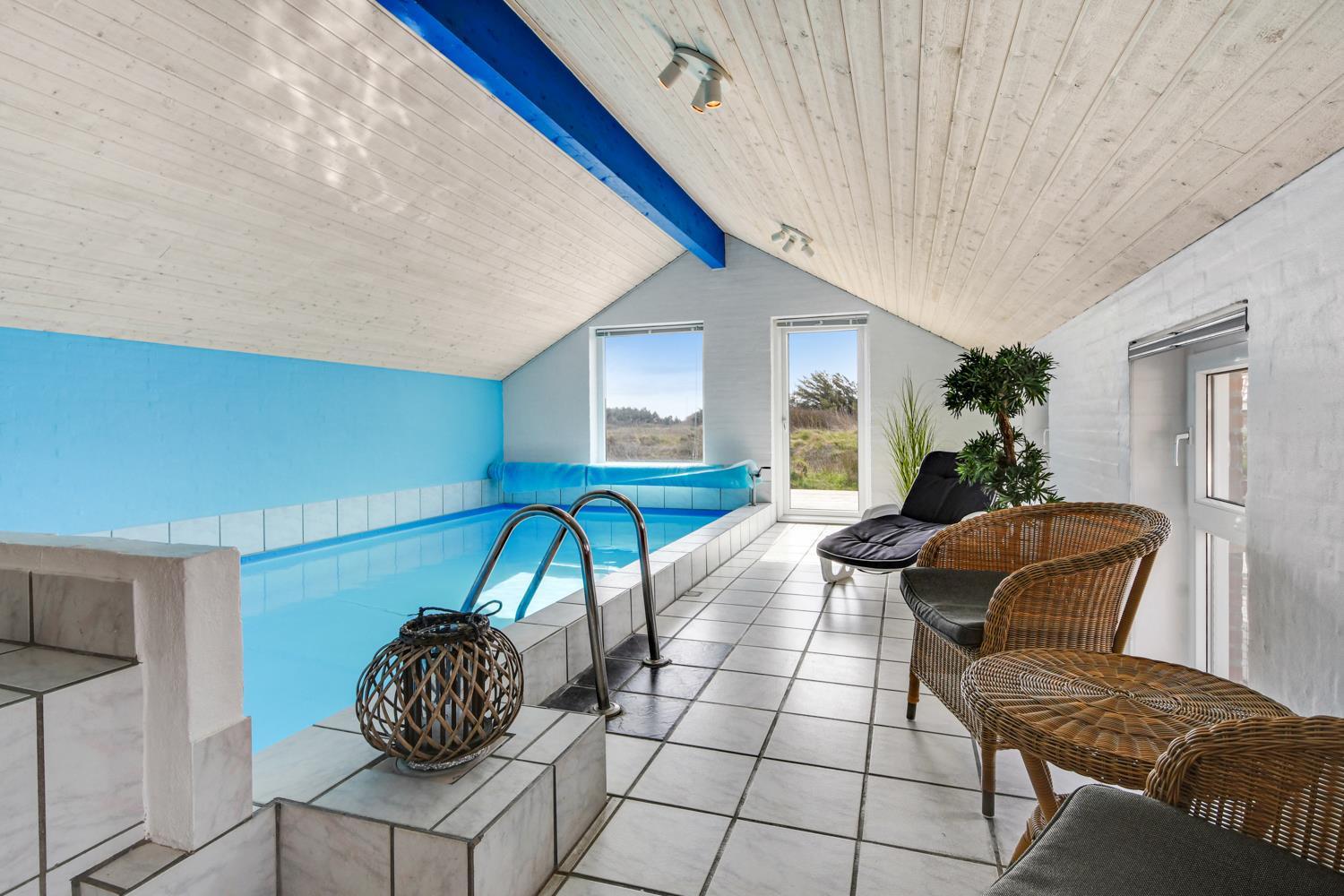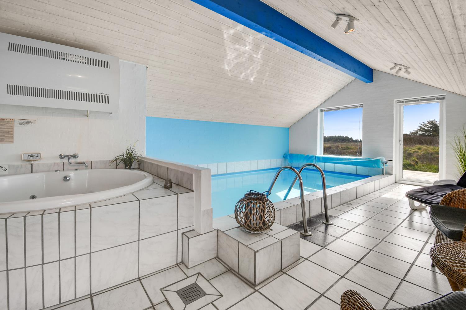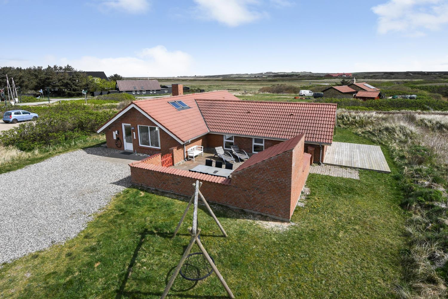 Das Poolhaus liegt auf einem Naturgrundstück dicht an der Nordsee. Es gibt eine 16 m² Westterrasse und eine eingezäunte 45 m² Terrasse ausgestattet mit Gartenmöbeln, Sonnenliegen und Grill. Für die Kinder stehen Sandkasten und Schaukeln zur Verfügung. Für einen Ausflug empfiehlt sich eine Fahrt in die Städte Lemvig oder Thyborøn, beide mit guten Einkaufsmöglichkeiten. In Lemvig gibt es außerdem einige Museen, in Thyborøn das Küstencenter, das Jütland Aquarium und das Schneckenhaus, die alle einen Besuch wert sind.