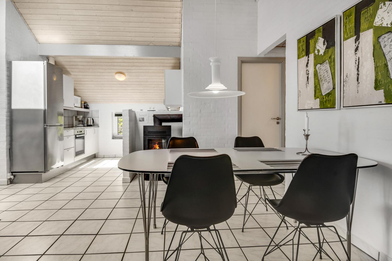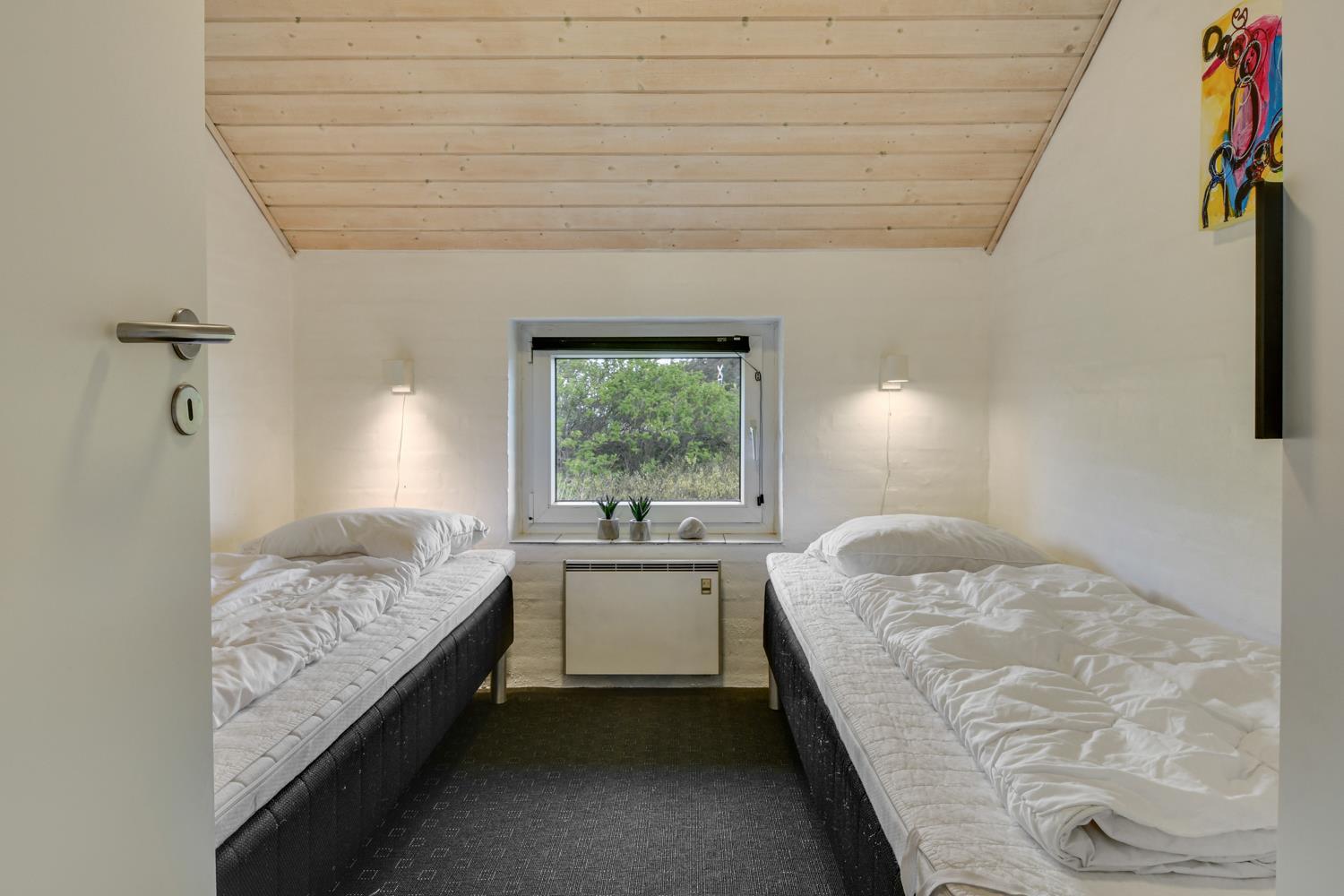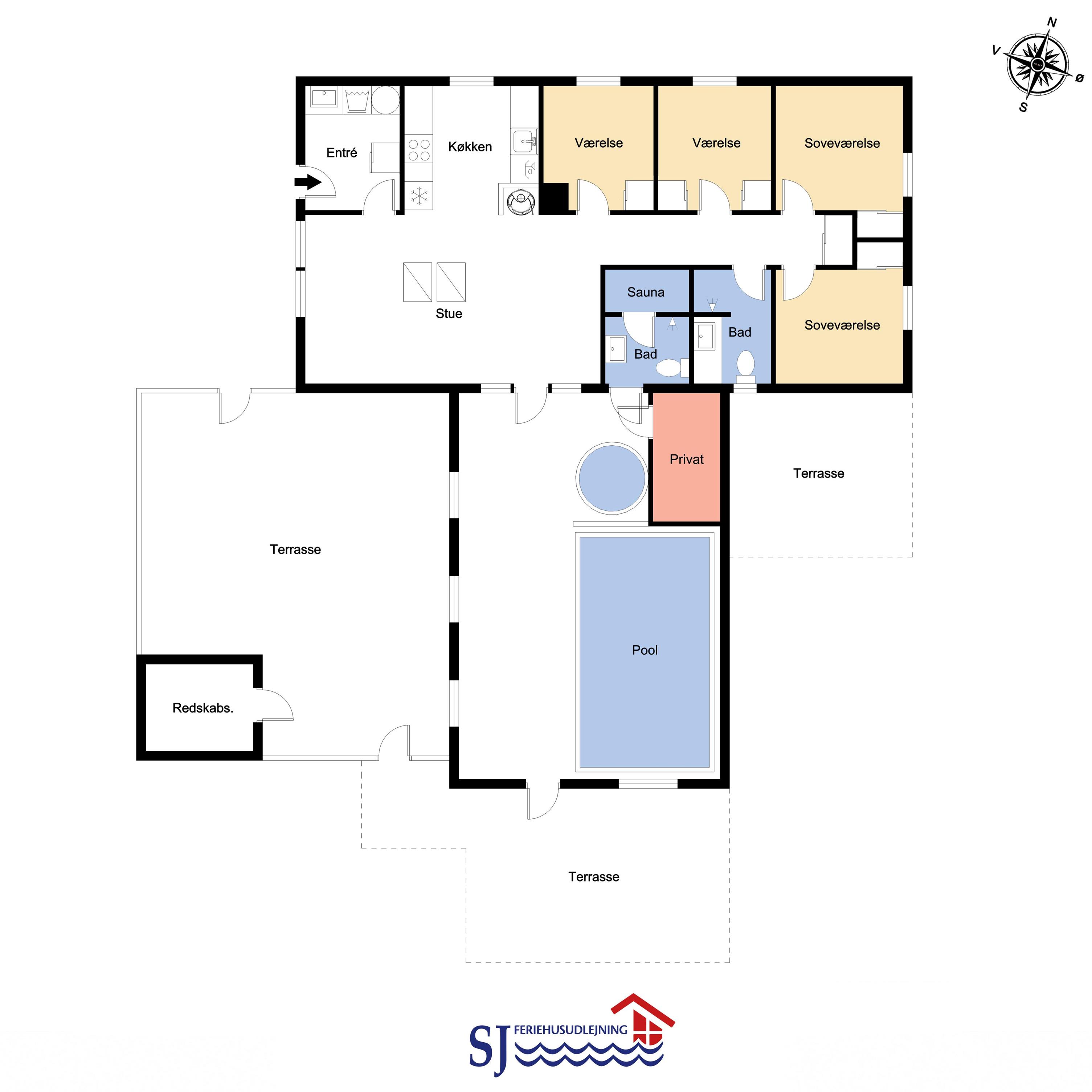 Die offene Küche ist mit allen möglichen Geräten ausgestattet, u. a. Geschirrspüler, Mikrowelle, Kühl- und Gefrierschrank. Wohnzimmer mit Flachbildschirm-TV mit dänischem (DR1, TV2) und deutschem Programm (Satellitenempfang), DVD- und CD-Player sowie Spielekonsole. Im Wohnzimmer gibt es einen Holzofen, wo man in bequemen Möbeln mit einem guten Buch in der Hand eine heiße Tasse Tee oder Kaffee genießen kann. 4 große Schlafzimmer mit Doppelbetten (DB), Einzelbetten (EB) und Etagenbetten: 1 DB + 1 DB + 2 EB + 2 Etagenbetten mit 4 Schlafplätzen. Für die kleinen Gäste stehen ein Kinderbett und ein Hochstuhl zur Verfügung. 2 Badezimmer jeweils mit Fußbodenheizung und Dusche, eines davon mit Zugang vom Poolraum und Durchgang zur Sauna. Im Poolraum gibt es einen 15 m² großen Pool mit Gegenstromanlage und Unterwasserbeleuchtung sowie einen 4-Personen-Whirlpool. Hier können Sie eine Runde schwimmen, im Whirlpool eine Hydromassage nehmen und sich anschließend in der Sauna aufwärmen. Im Haus sind 2 äußerst energieeffiziente Wärmepumpen installiert. 2 Hunde sind erlaubt. Nichtraucherhaus. Wenn Sie ein Elektroauto oder einen Plug-in-Hybrid haben, verfügt das Haus über eine Ladebox. Kaution Wintersaison EUR 400 und Sommersaison EUR 300